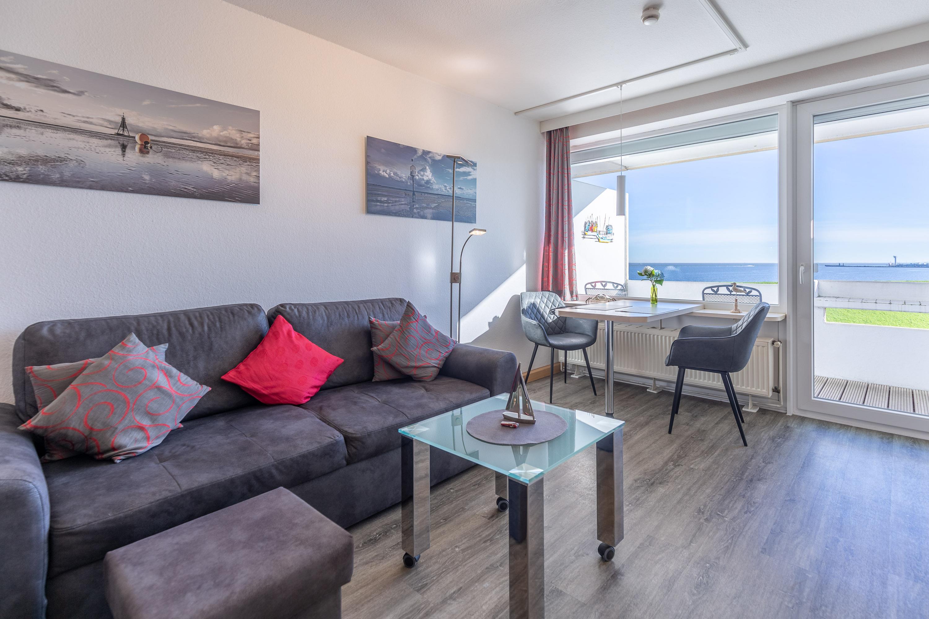 Vom Esstisch am Fenster genießen Sie schon beim allmorgendlichen Frühstück einen traumhaften Ausblick auf die Elbe und den Schifffahrtsweg. Die 35 m² Ferienwohnung bietet einen abwechslungsreichen Ausblick auf die vorbeifahrenden Ozeanriesen und lässt keine Langeweile aufkommen. Ferienwohnung Nautic 308 ist ideal für eine Belegung mit 2 Personen geeignet. Im Wohnbereich ist eine kleine Küche mit Geschirrspüler und Mikrowelle integriert.