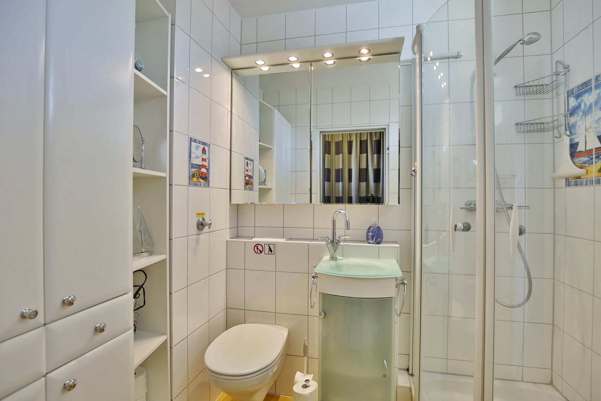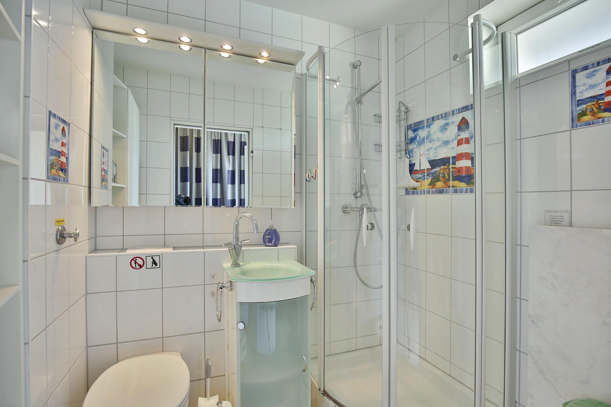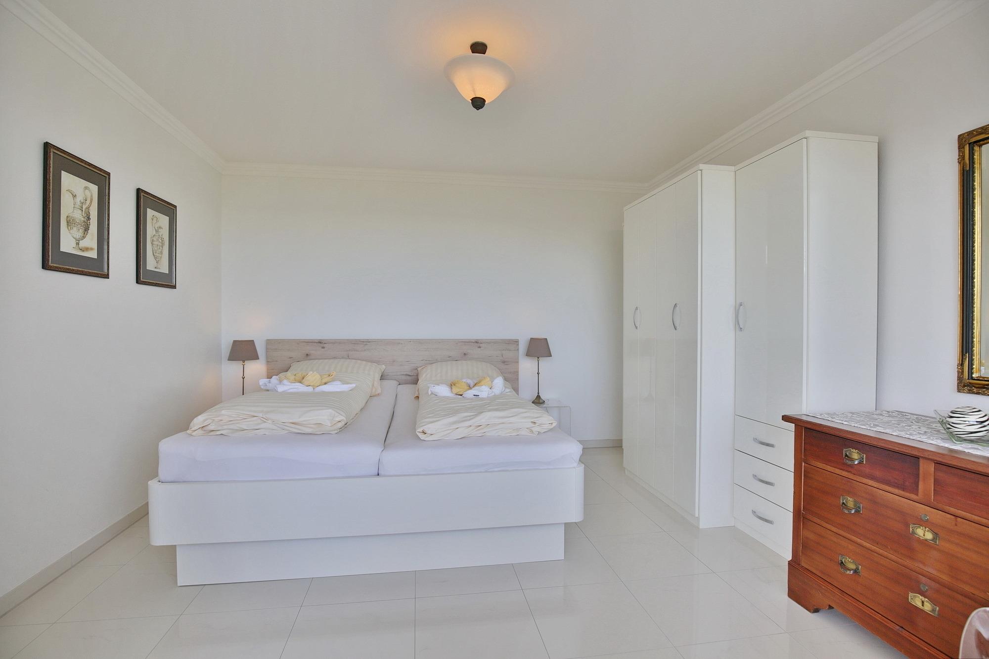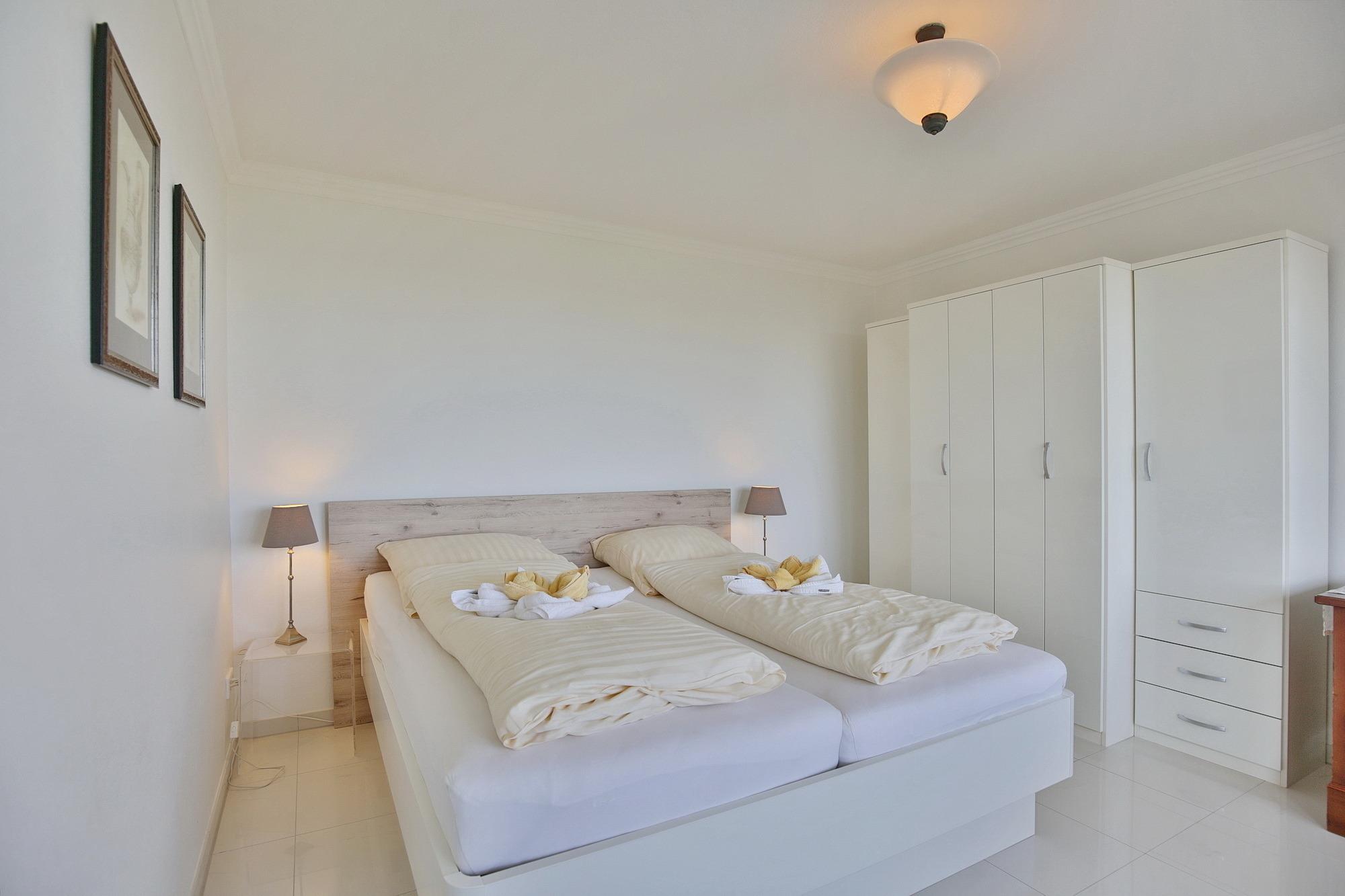 Das separate Schlafzimmer bietet ein Doppelbett (2x90x200). Rückenschonende Matratzen sorgen dafür, dass Sie sich auch im Schlaf erholen. Auch das separate Schlafzimmer bietet einen fantastischen Meerblick und sorgt dafür, dass Sie schon beim Aufstehen den grandiosen Meerblick genießen können. Zur Ferienwohnung gehört ein modern saniertes Bad mit Dusche und WC.