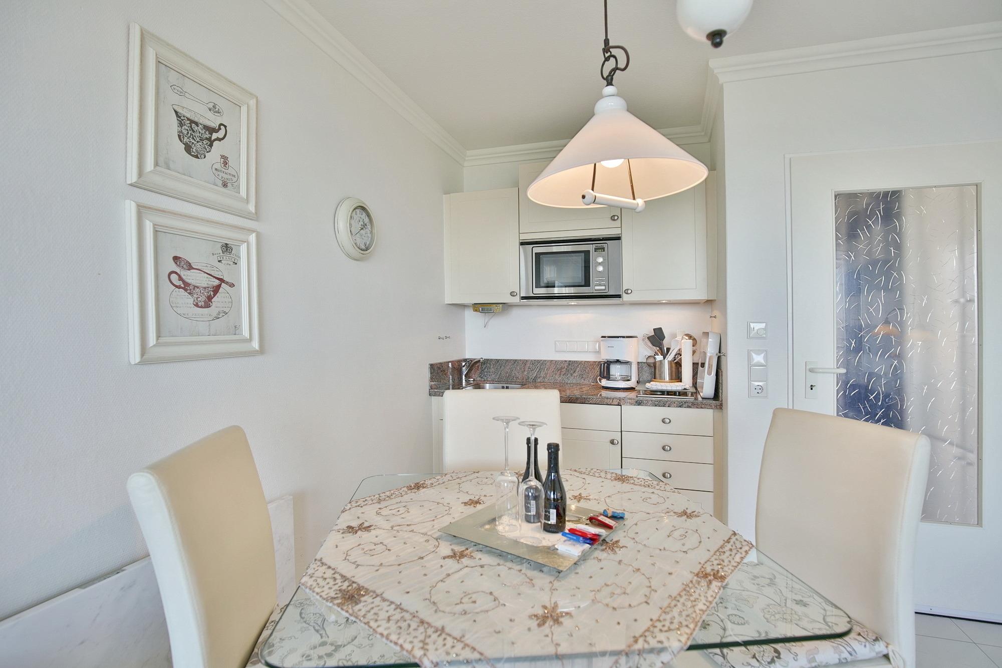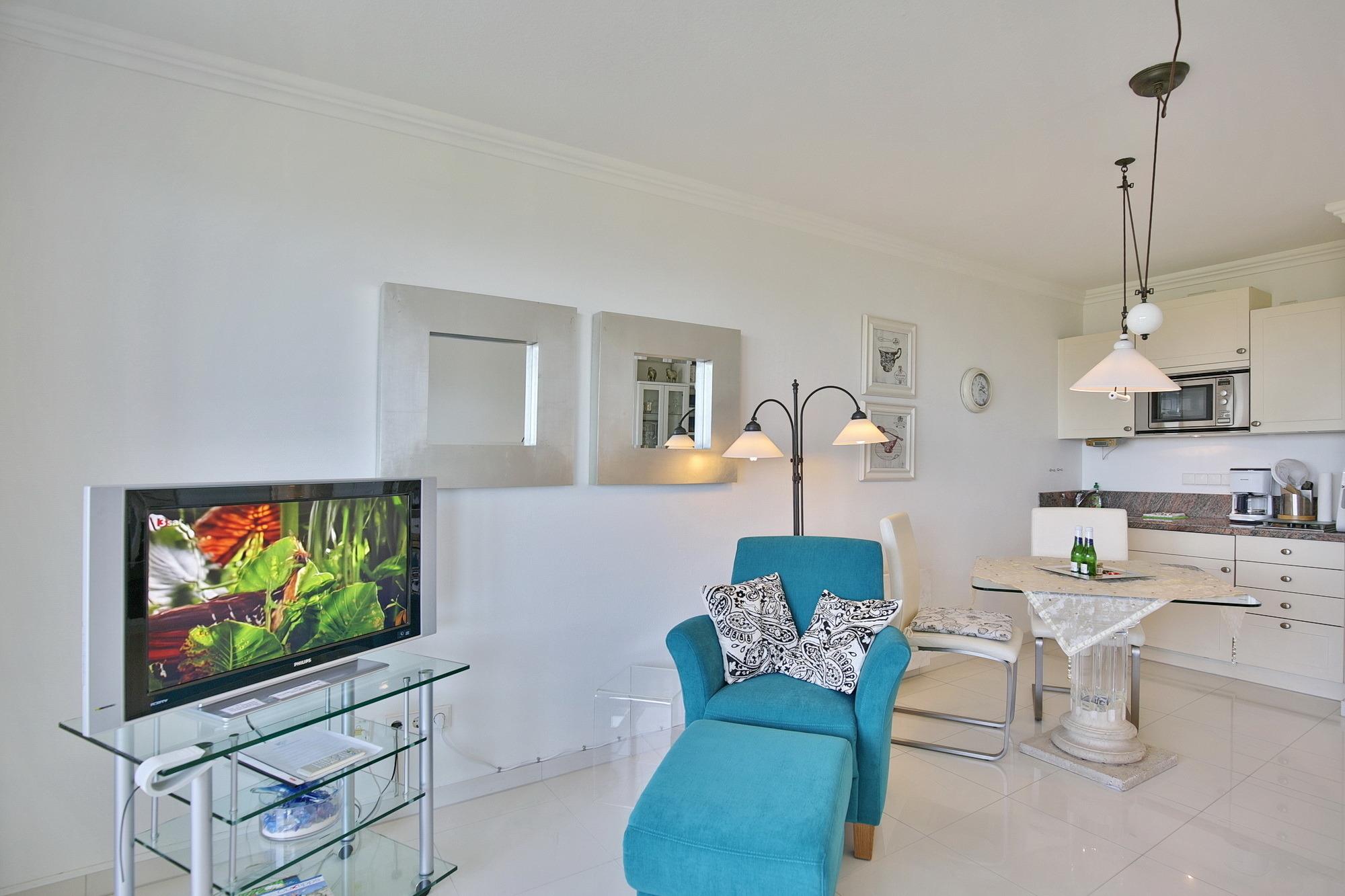 Der kombinierte Wohn-/Essbereich bietet eine hochwertige Küchenzeile mit Miele-Geräten. Unter anderem ist die Küche mit einem 2-Plattenherd, einer Mikrowelle und einem Kühlschrank ausgestattet. Auf der Couchgarnitur und dem Relaxsessel können Sie sich entspannt zurücklehnen und den Meerblick genießen. Für Unterhaltung sorgt neben dem abwechslungsreichen Ausblick auch ein LCD Fernseher und kostenloses WLAN. Darüber hinaus verfügt Ferienwohnung Nautic 309 über einen großen Balkon, der sowohl vom Wohn- als auch vom Schlafzimmer begehbar ist.