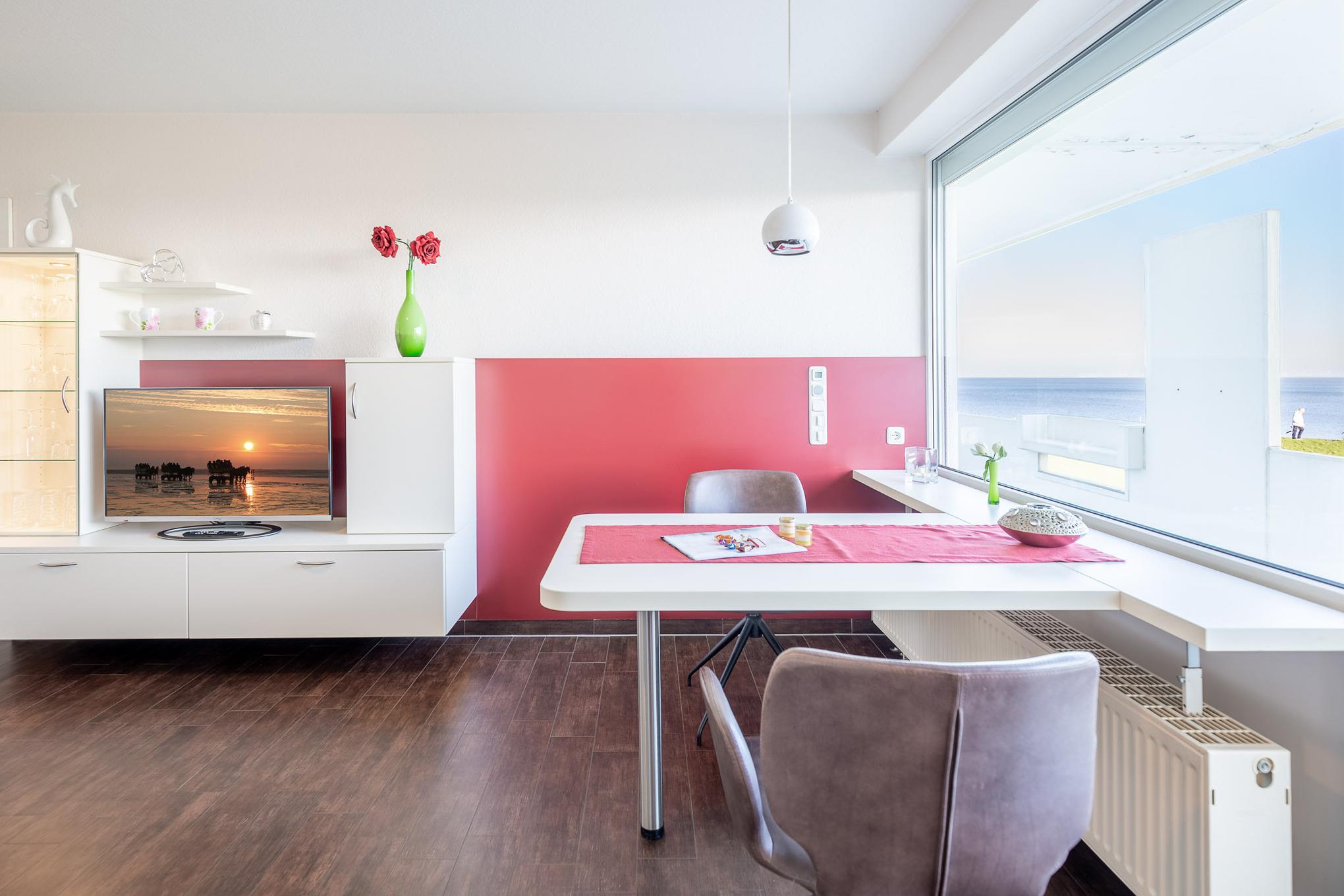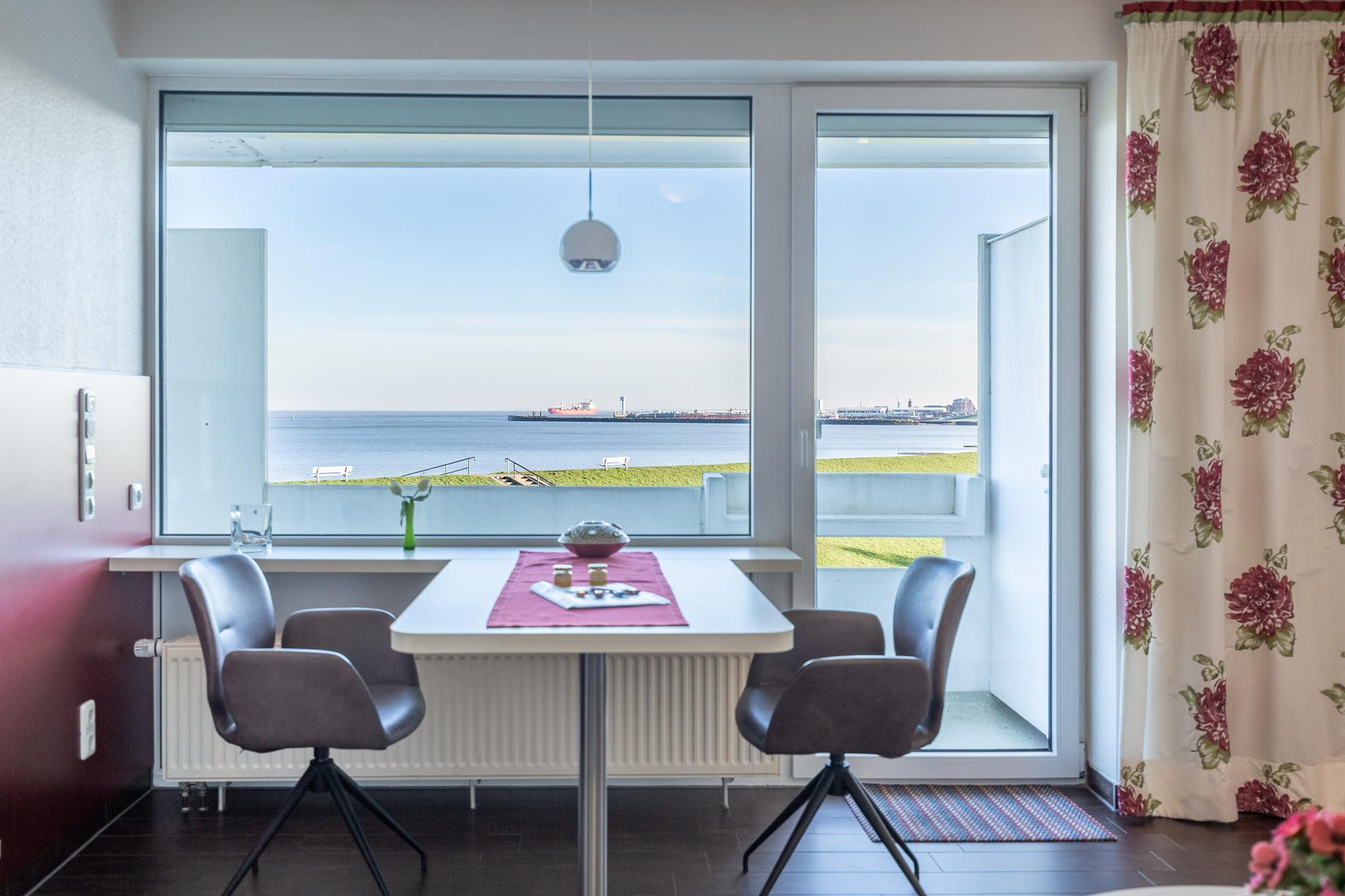 Vom Esstisch am Fenster genießen Sie schon beim Frühstück den atemberaubenden Ausblick auf die vorbeifahrenden Krabbenkutter, Segelschiffe und Luxus Liner, die zum Greifen nah scheinen. Ein großer Metz LCD-TV sorgt auch an einem Fernsehabend für beste Unterhaltung. Die separate Küche ist mit einem 2 Plattenherd, einem Geschirrspüler sowie einem Kühlschrank mit Gefrierfach ausgestattet. Eine Rarität ist der großzügige Balkon mit spektakulärem Meerblick, der bei sonnigem Wetter zum Verweilen einlädt. Zur Ferienwohnung gehört ein modernes Bad mit Dusche und WC.