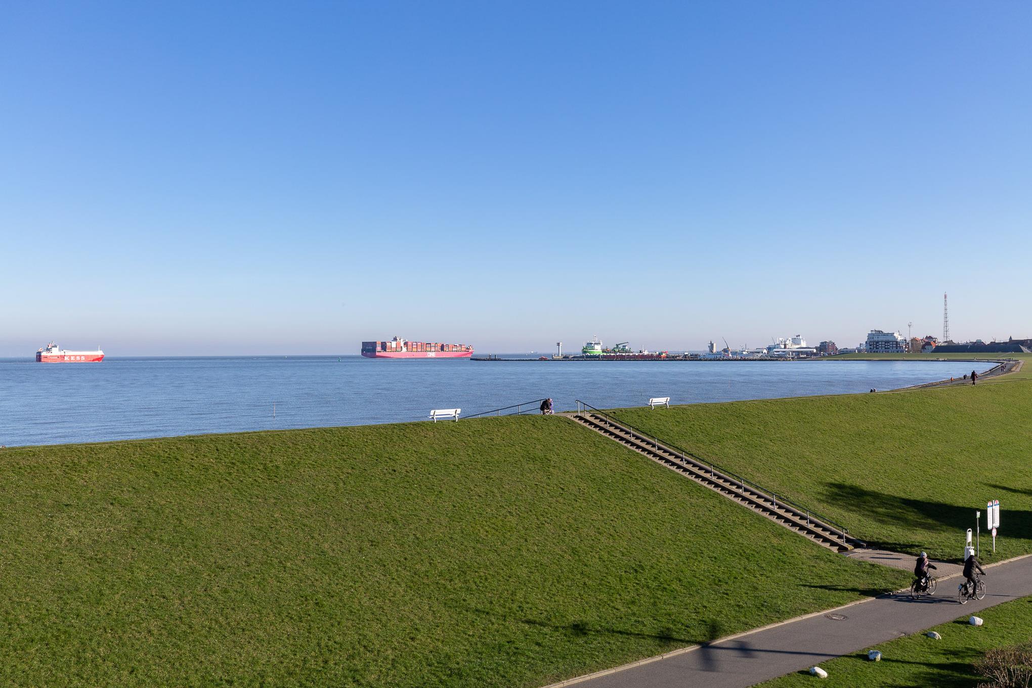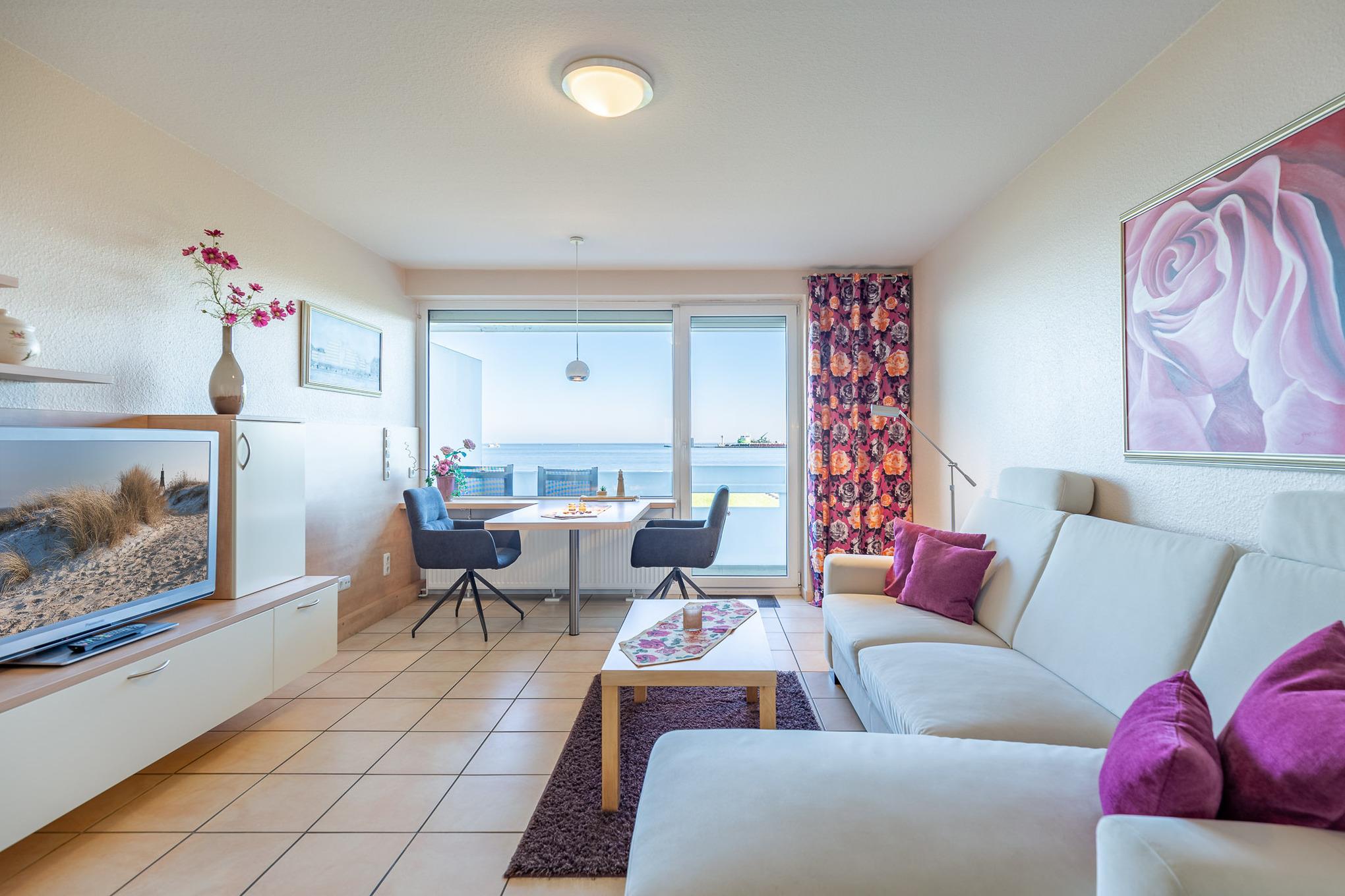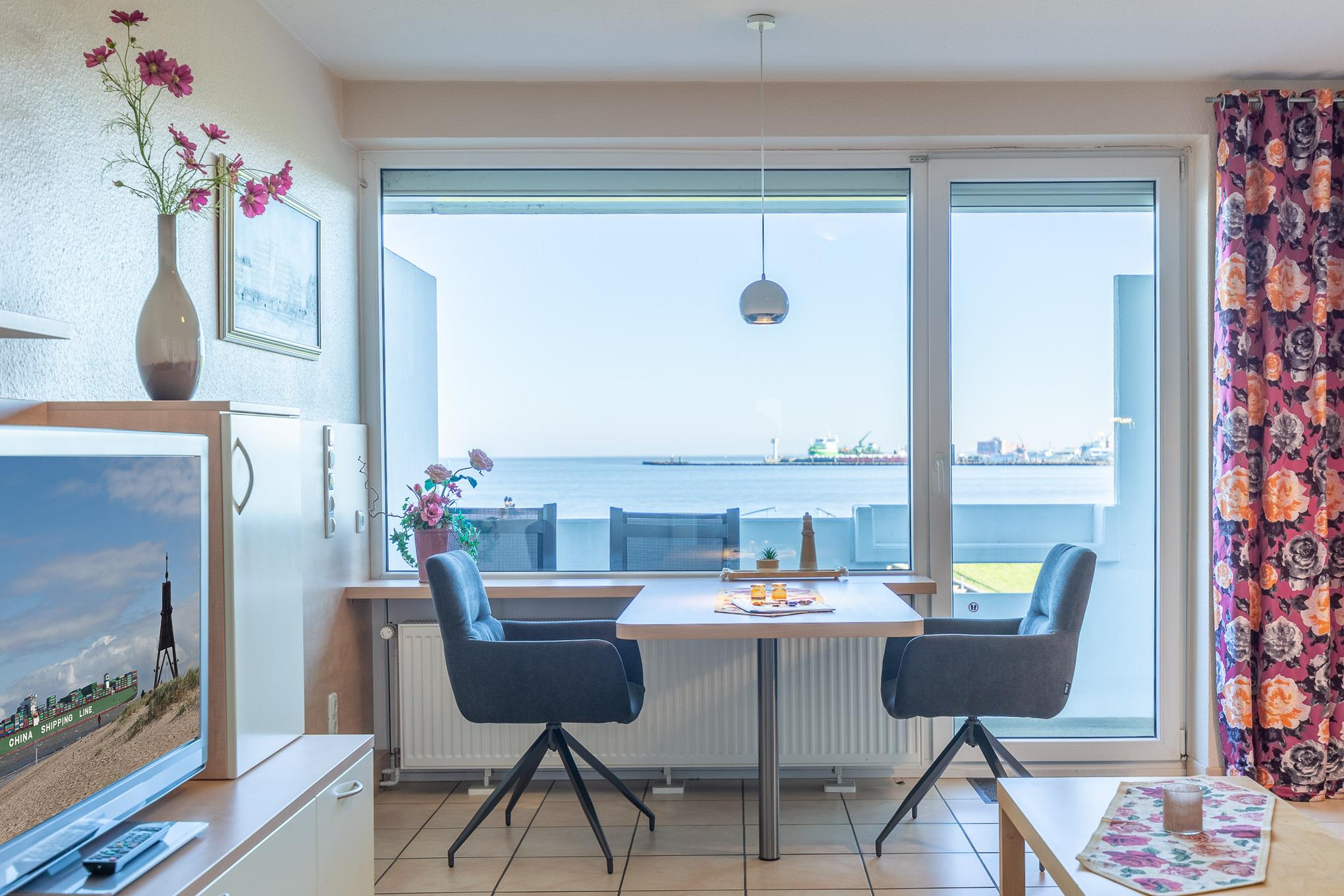 Egal ob Sie am Esstisch, auf dem Ecksofa oder auf dem Balkon sitzen, immer genießen Sie den fantastischen Blick auf den Weltschifffahrtsweg, die Grimmershörnbucht und den Hafen. Ein großer Flachbildfernseher sorgt dafür, dass Sie auch im Urlaub nicht auf die Sportschau oder Ihre Lieblingsserie verzichten müssen. Eine Küchenzeile ist im Wohnbereich integriert. Selbstverständlich genießen Sie auch vom möblierten Balkon den atemberaubenden Meerblick, der mehr als beeindruckt. Zur Ferienwohnung gehört ein modernes Bad mit Dusche und WC.