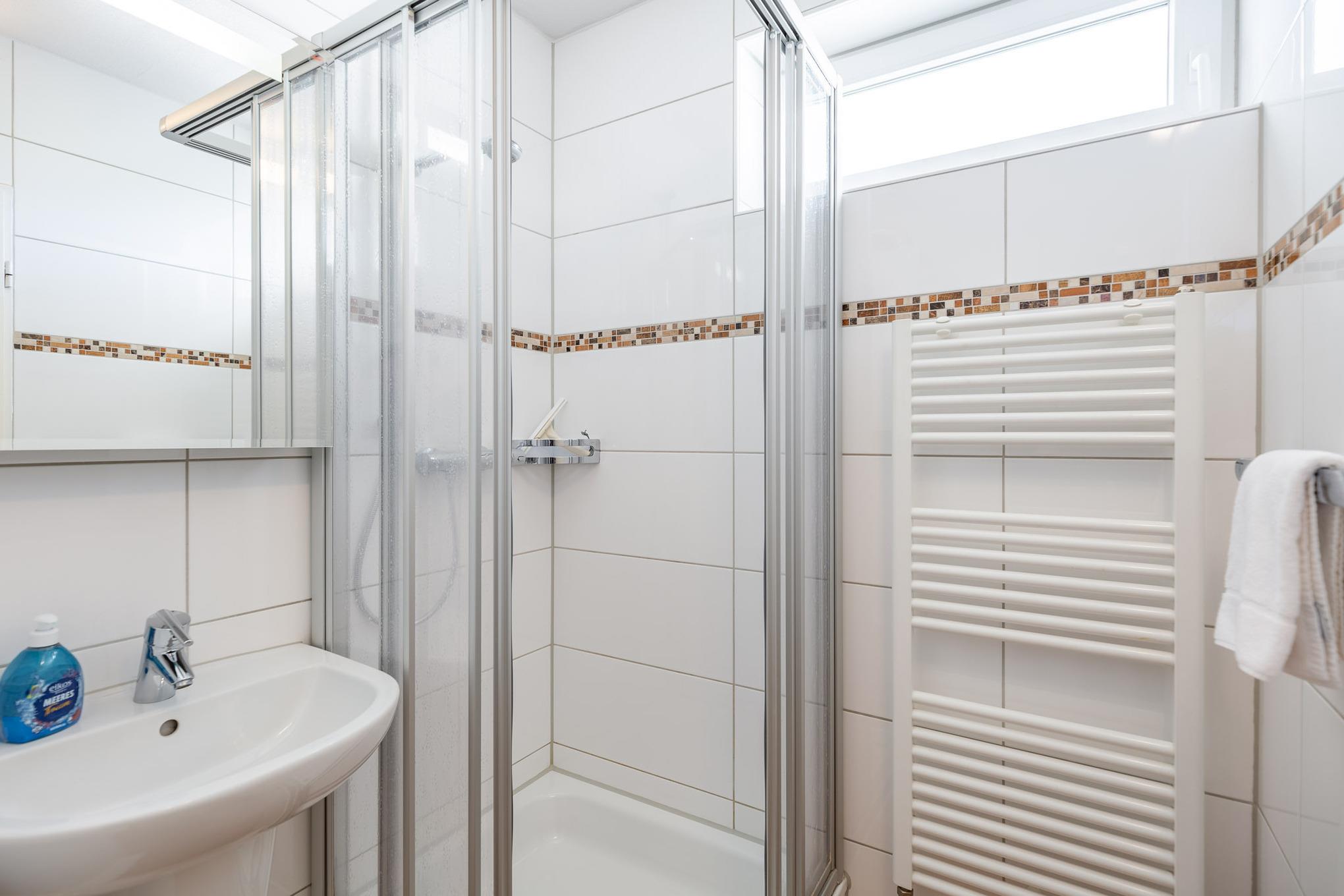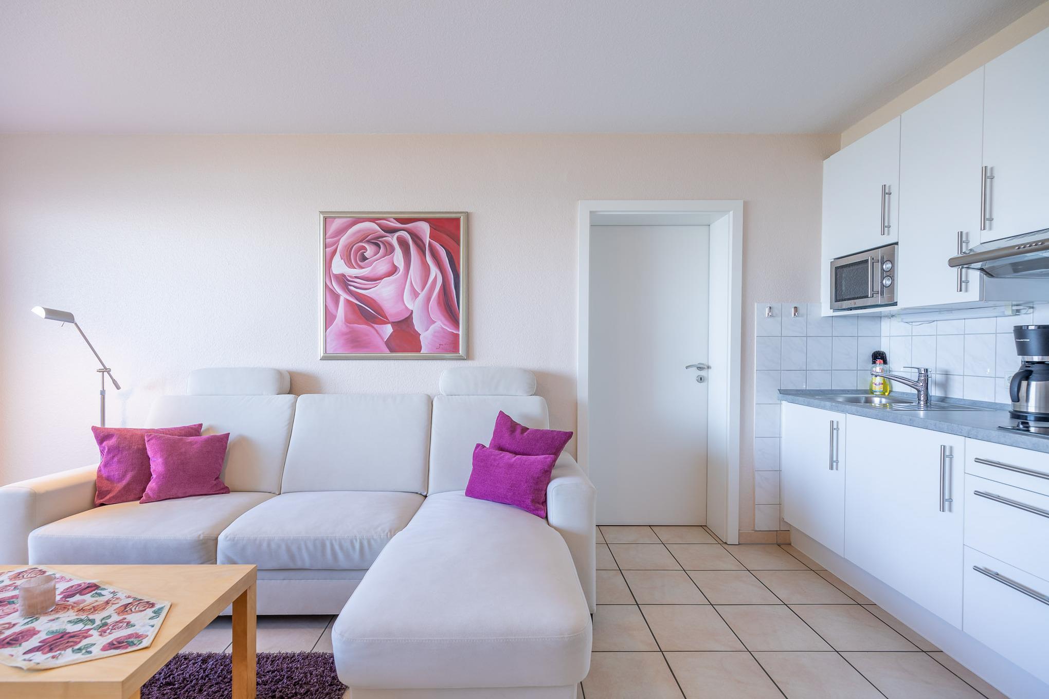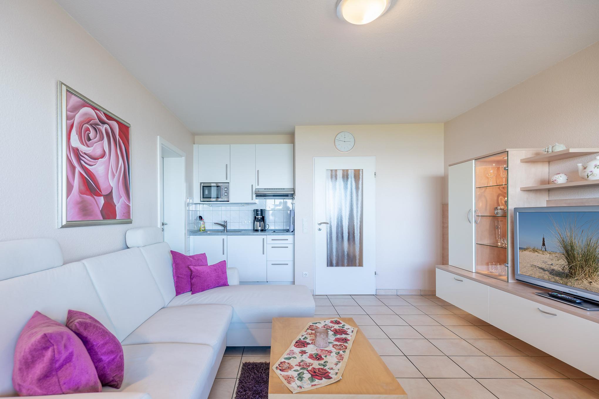 Egal ob Sie am Esstisch, auf dem Ecksofa oder auf dem Balkon sitzen, immer genießen Sie den fantastischen Blick auf den Weltschifffahrtsweg, die Grimmershörnbucht und den Hafen. Ein großer Flachbildfernseher sorgt dafür, dass Sie auch im Urlaub nicht auf die Sportschau oder Ihre Lieblingsserie verzichten müssen. Eine Küchenzeile ist im Wohnbereich integriert. Selbstverständlich genießen Sie auch vom möblierten Balkon den atemberaubenden Meerblick, der mehr als beeindruckt. Zur Ferienwohnung gehört ein modernes Bad mit Dusche und WC.