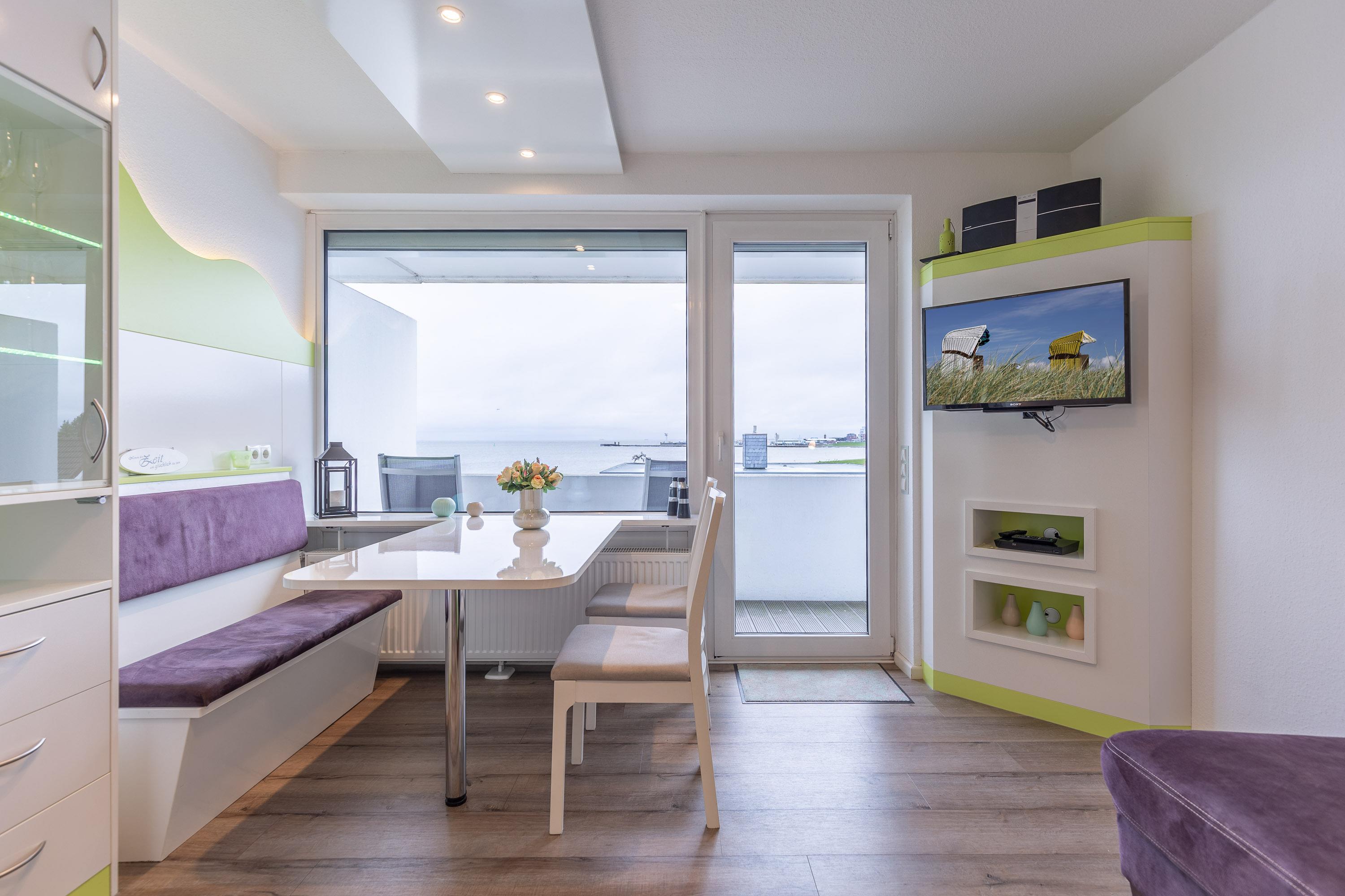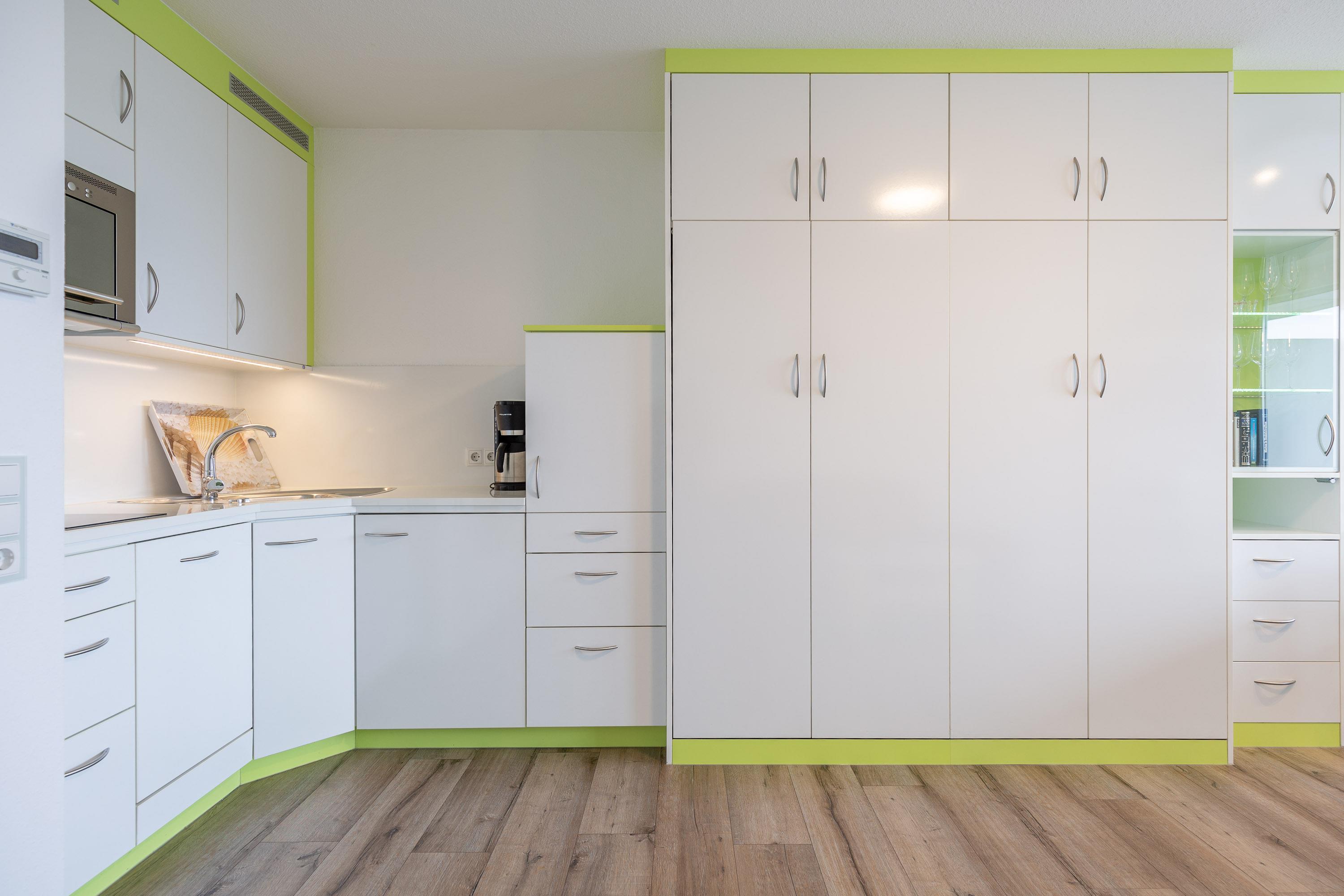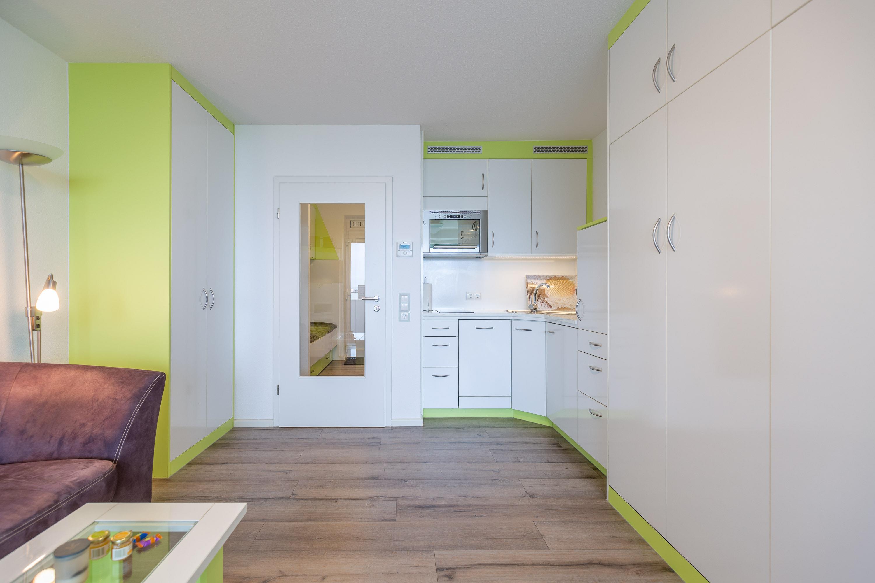 Die hochwertigen Schrankbetten lassen sich getrennt nutzen. Ein Etagenbett im Vorraum bietet eine vom Wohnbereich getrennte Schlafmöglichkeit. Eine integrierte Küche mit Geschirrspüler und ein Flachbildfernseher gehören zum Standard. Zur Wohnung gehört ein meerseitiger Balkon. Ferienwohnung 402 ist mit einem modernen Bad mit Dusche, WC und einem Fenster zum Belüften ausgestattet.