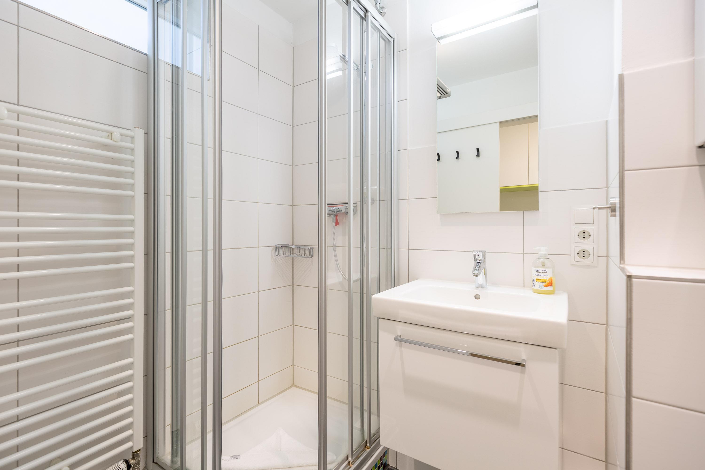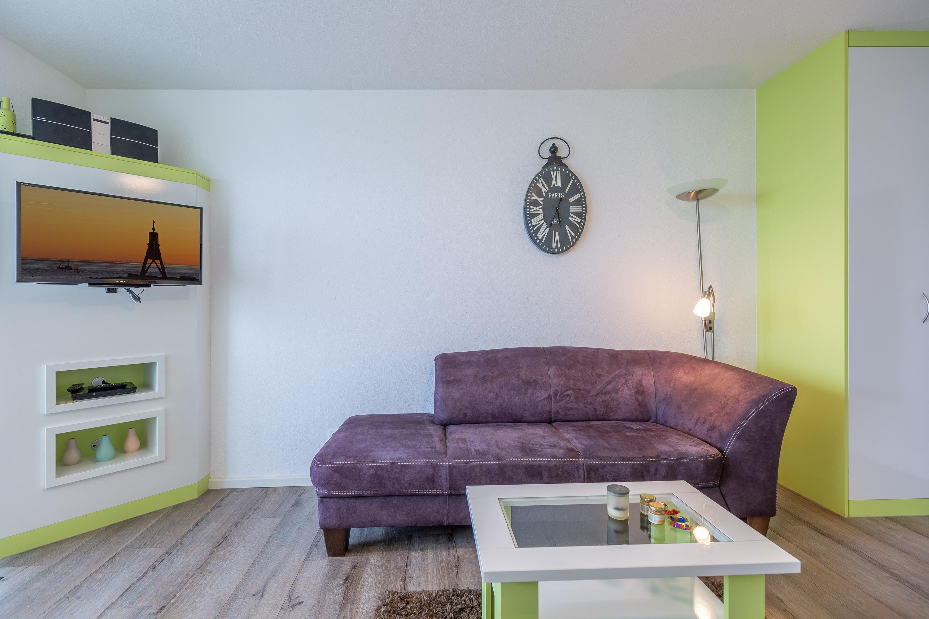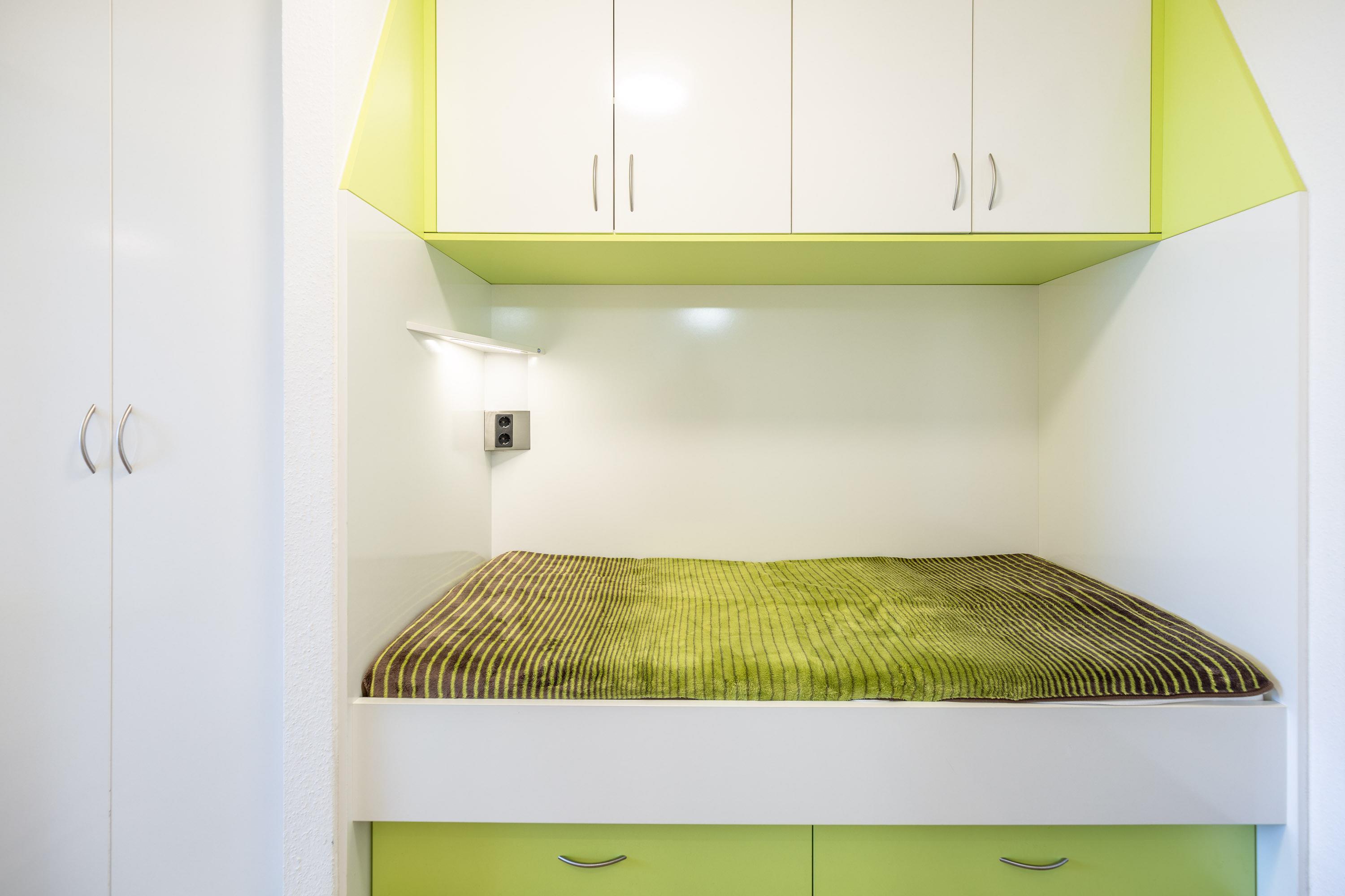 Die hochwertigen Schrankbetten lassen sich getrennt nutzen. Ein Etagenbett im Vorraum bietet eine vom Wohnbereich getrennte Schlafmöglichkeit. Eine integrierte Küche mit Geschirrspüler und ein Flachbildfernseher gehören zum Standard. Zur Wohnung gehört ein meerseitiger Balkon. Ferienwohnung 402 ist mit einem modernen Bad mit Dusche, WC und einem Fenster zum Belüften ausgestattet.