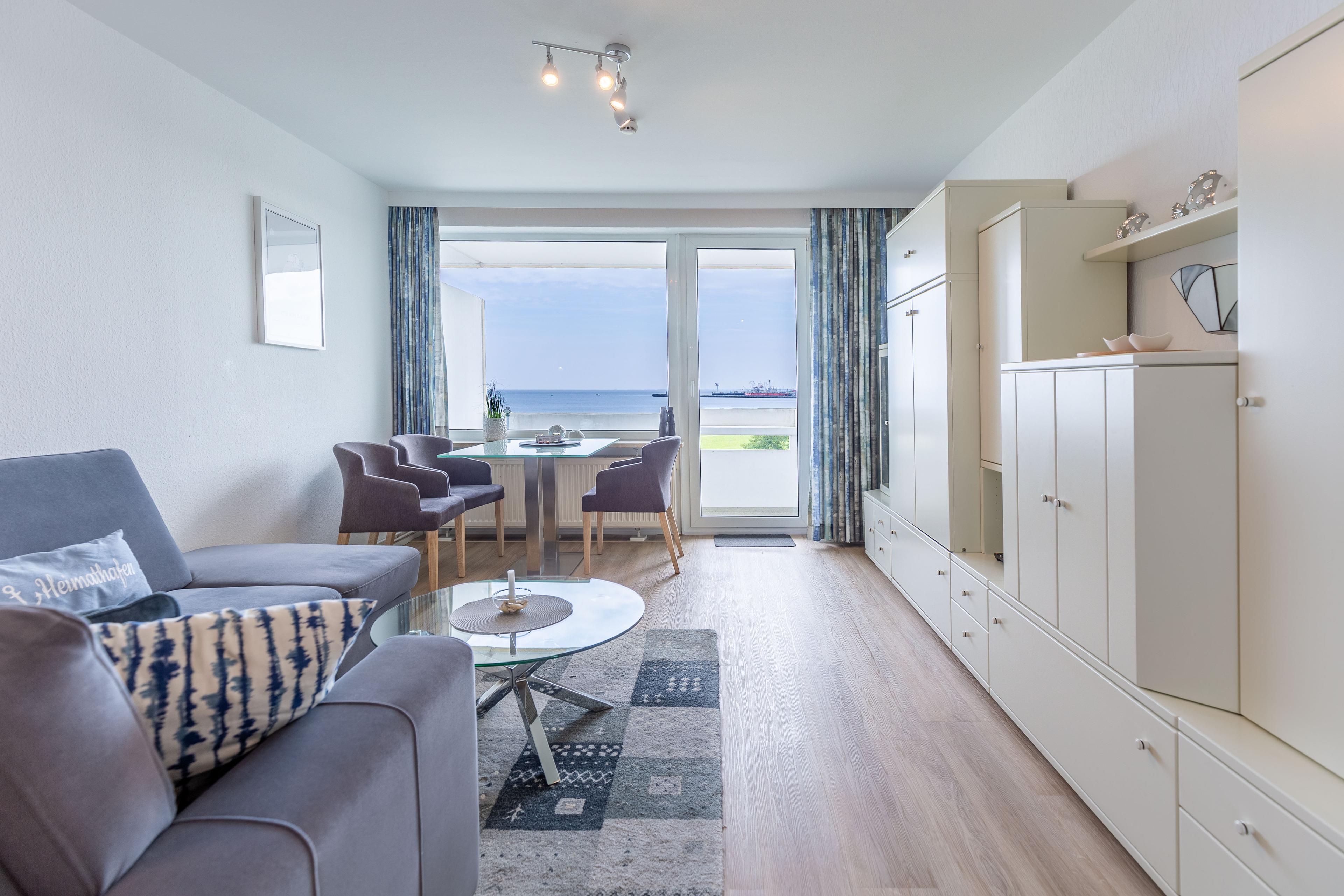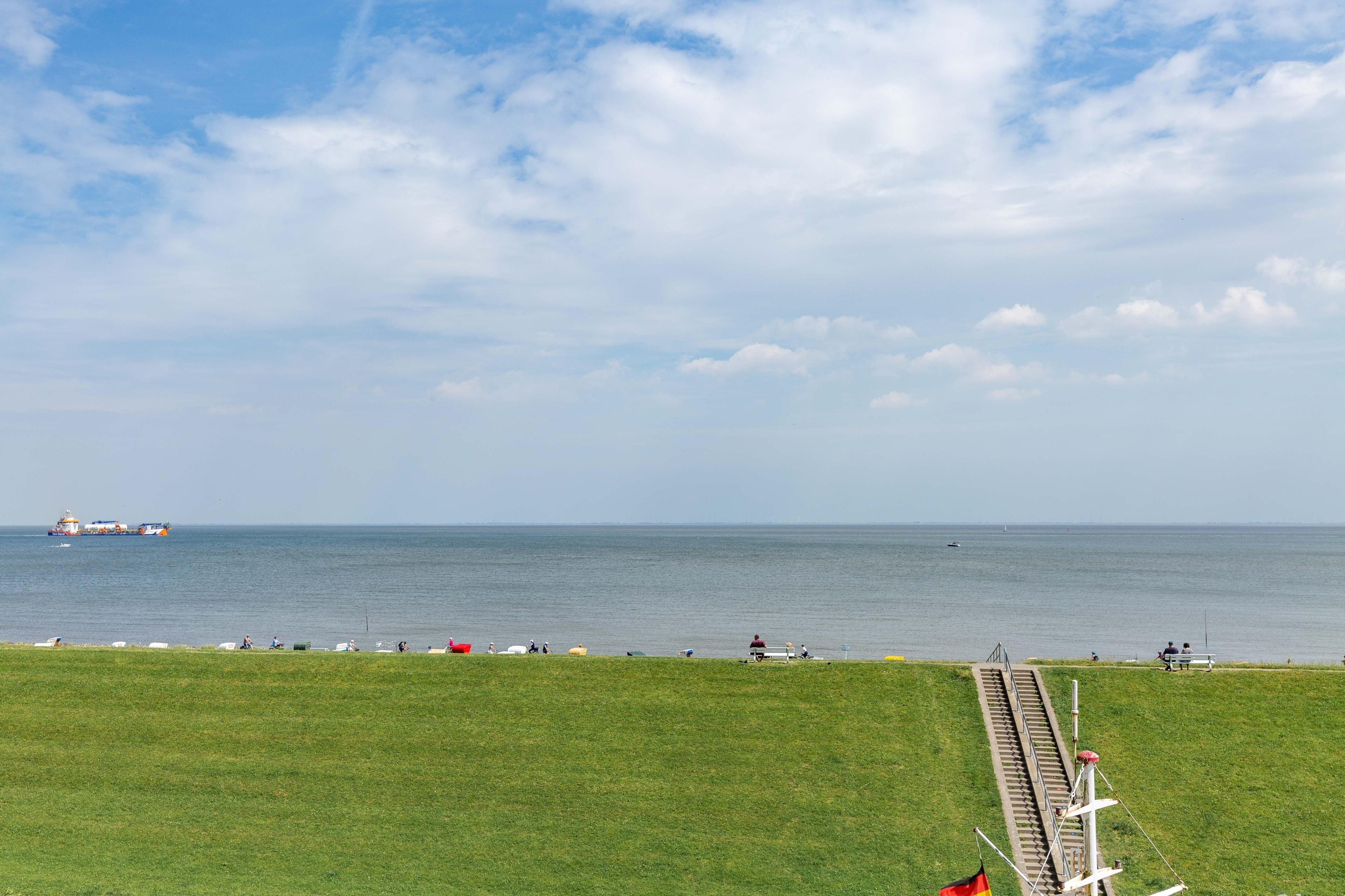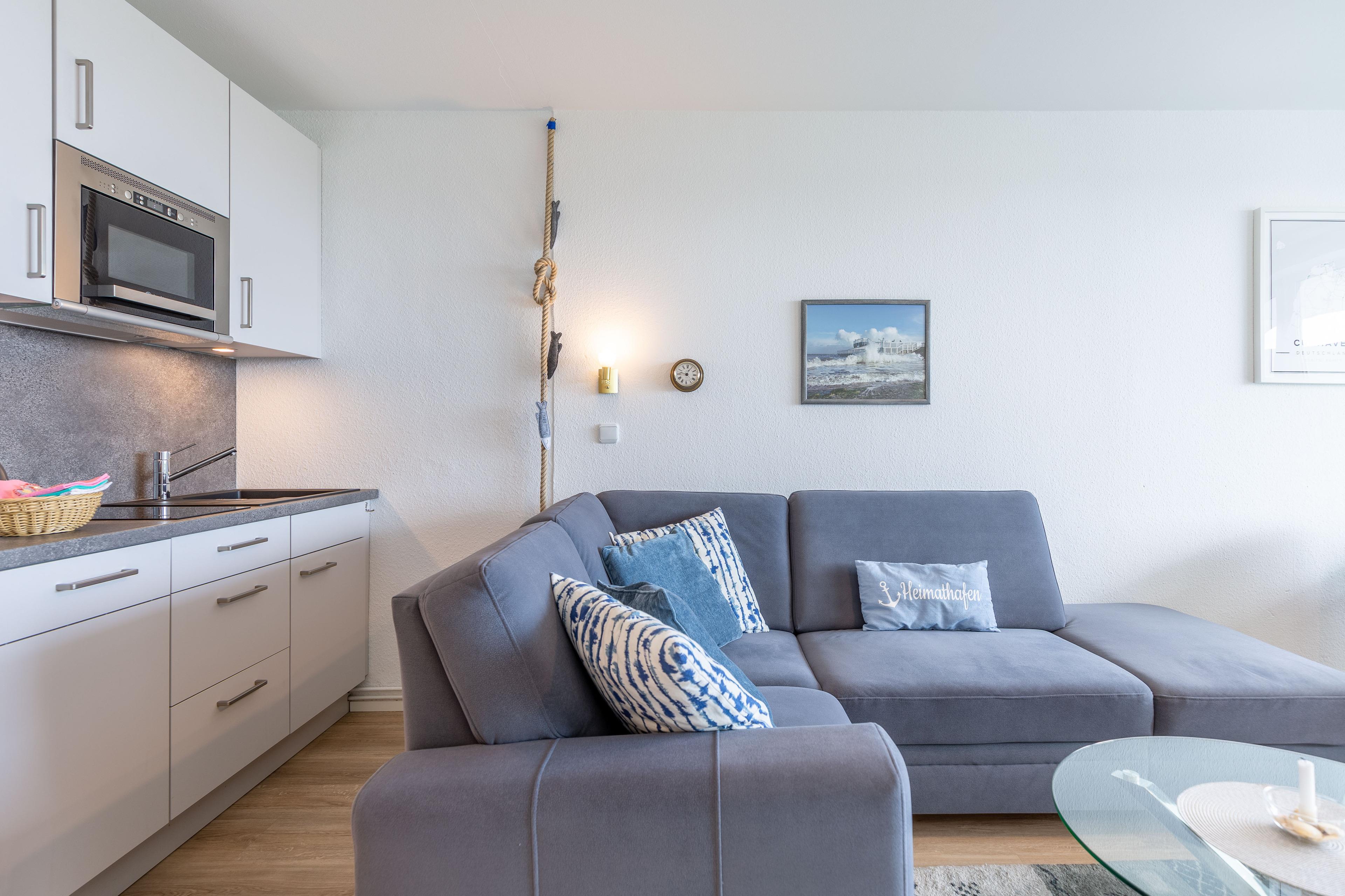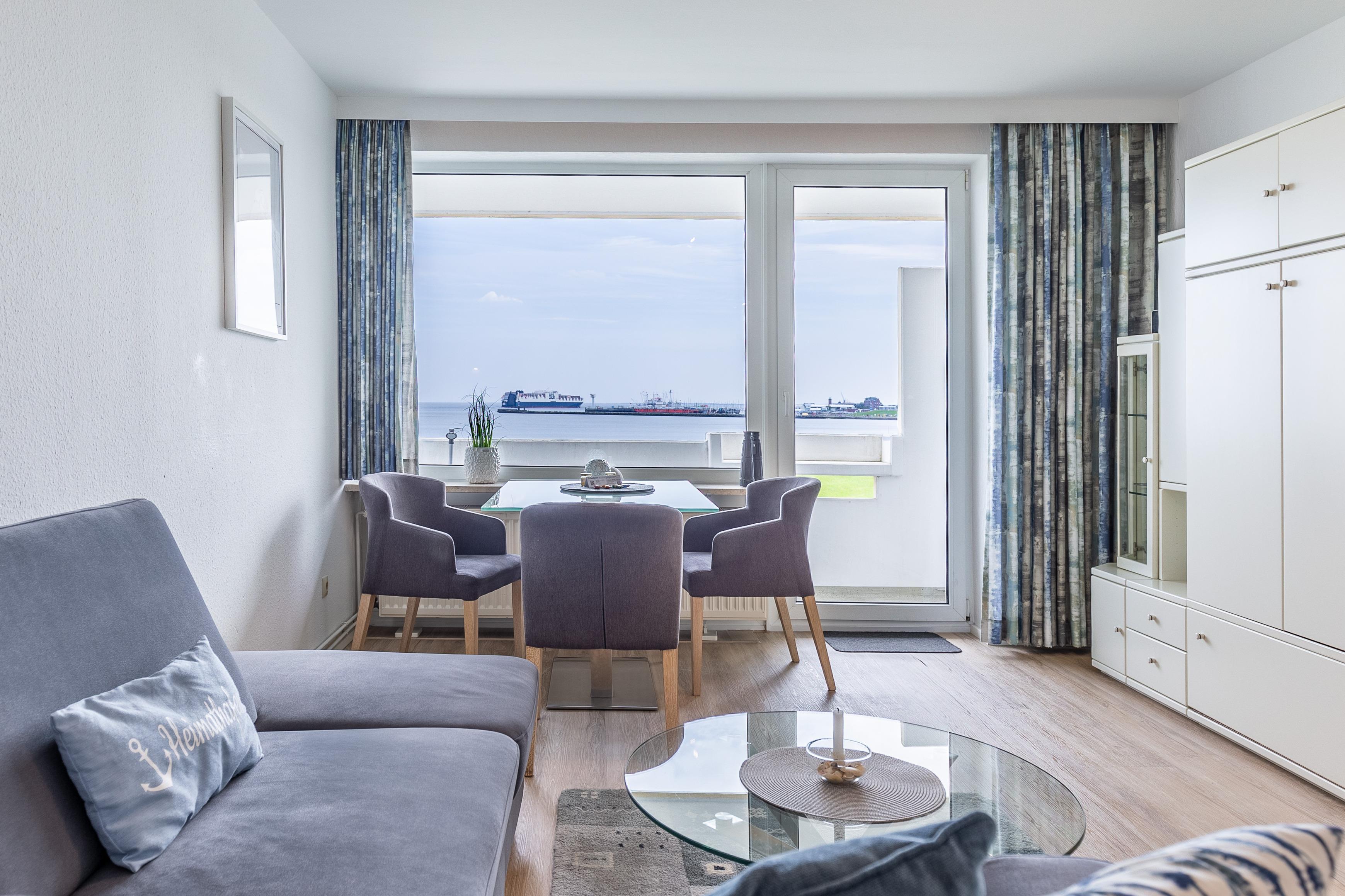 Der kombinierte Wohn-/Essbereich bietet eine Küchenzeile mit Geschirrspüler, 2-Platten-Ceranfeld sowie Mikrowelle mit Crisp-Funktion. Auf dem Ecksofa können Sie sich entspannt zurücklehnen und den atemberaubenden Meerblick genießen. Krabbenkutter und Kreuzfahrtschiffe sind zum Greifen nah. Für beste Unterhaltung sorgt neben dem abwechslungsreichen Ausblick auch ein LCD Fernseher.