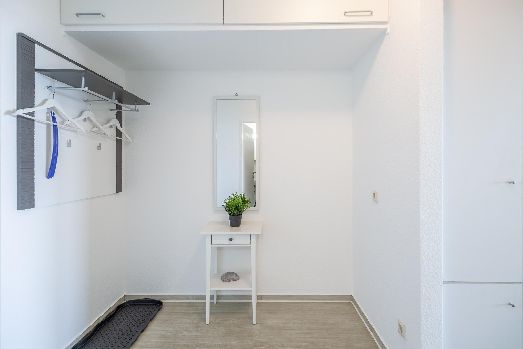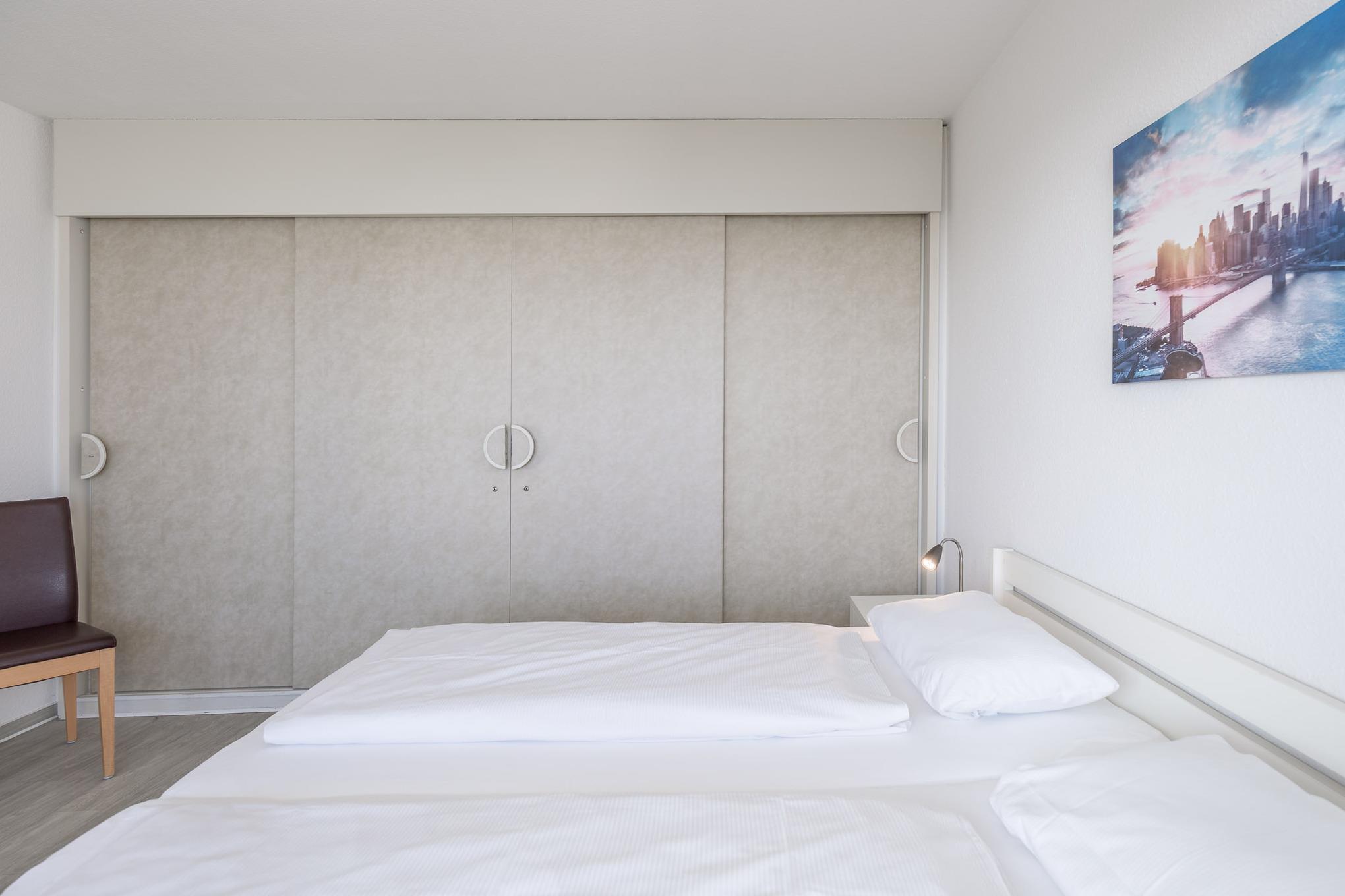 Die 2-Zimmer Ferienwohnung bietet 2 Personen auf 55 m² genügend Raum für behagliches und erholsames Wohnen. Ferienwohnung 509 bietet den Komfort eines separaten Schlafzimmers. Das große Doppelbett (2x100x200) in rückenschonender Komfortliegehöhe gewährleistet einen erholsamen Schlaf. Dank elektrischer Außenjalousien werden Sie nicht von der Morgensonne geweckt.