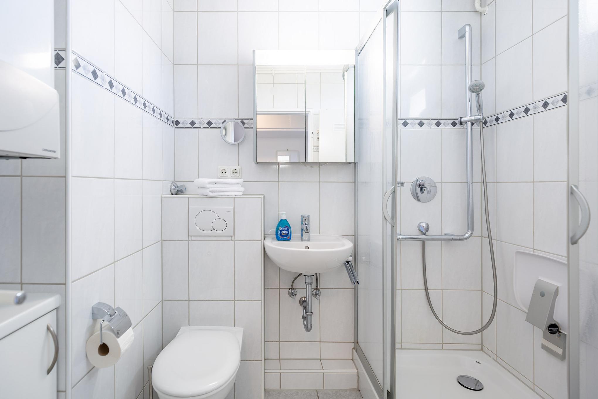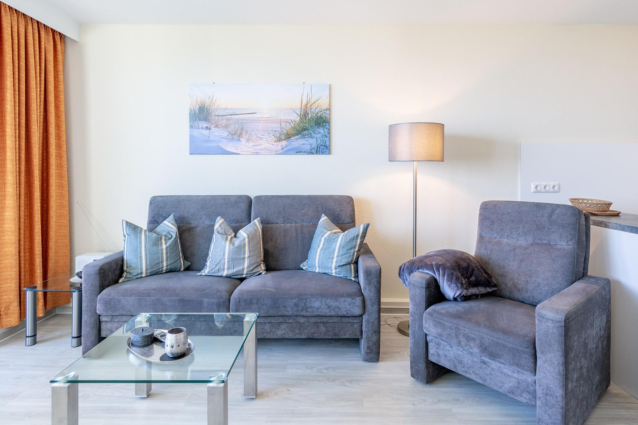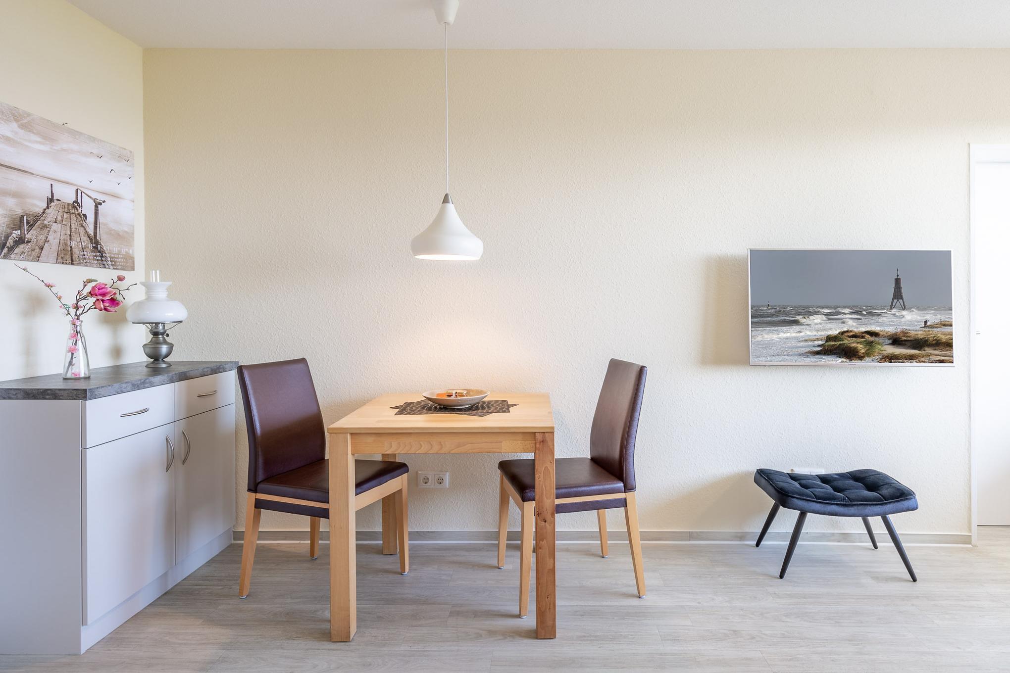 Im kombinierten Wohn- und Essbereich ist eine funktionale Küchenzeile mit Kühlschrank, Geschirrspüler und Mikrowelle integriert. Dank Flachbildfernseher müssen Sie auch im Urlaub nicht auf einen entspannten Fernsehabend verzichten. Darüber hinaus gehört kostenloses Wlan zum Standard dieser Wohnung.[nbsp]Der Balkon ist eine wahre Freiluft-Nordseeloge und erstreckt sich über die gesamte Fläche des Wohn- und Schlafzimmers. Selbstverständlich genießen Sie auch vom Balkon den traumhaften Meerblick.