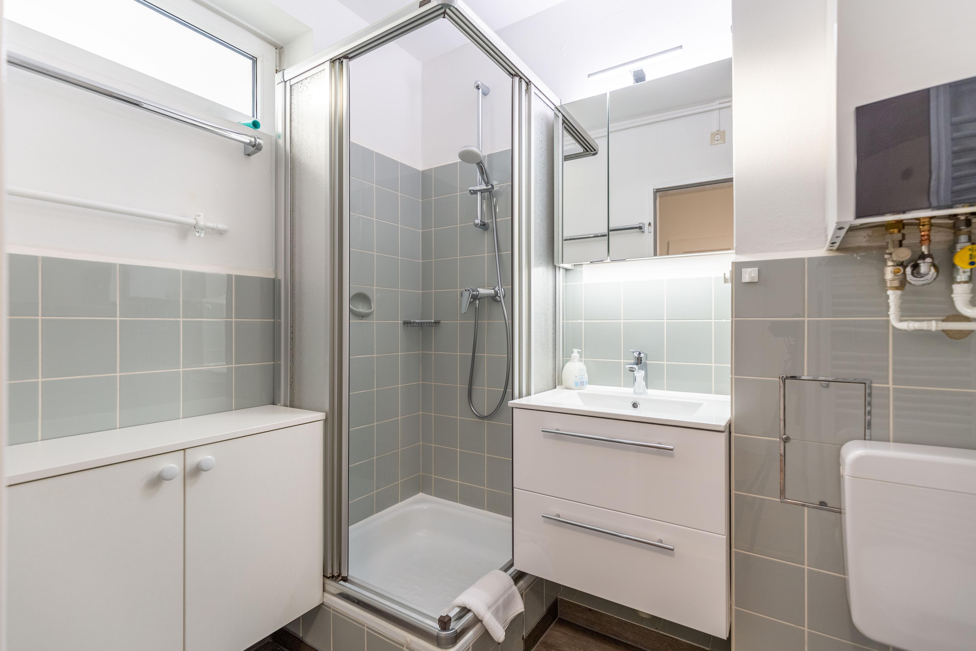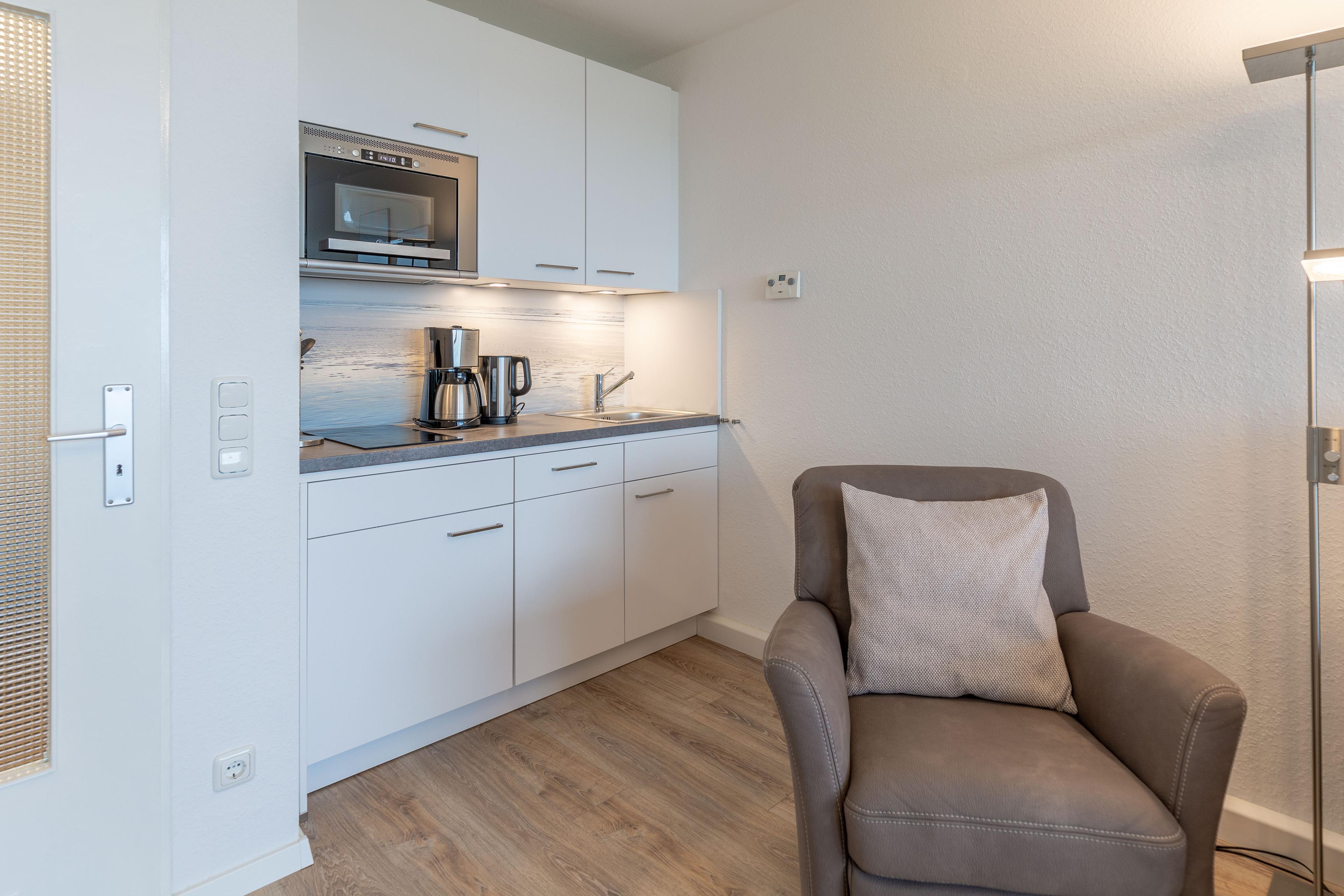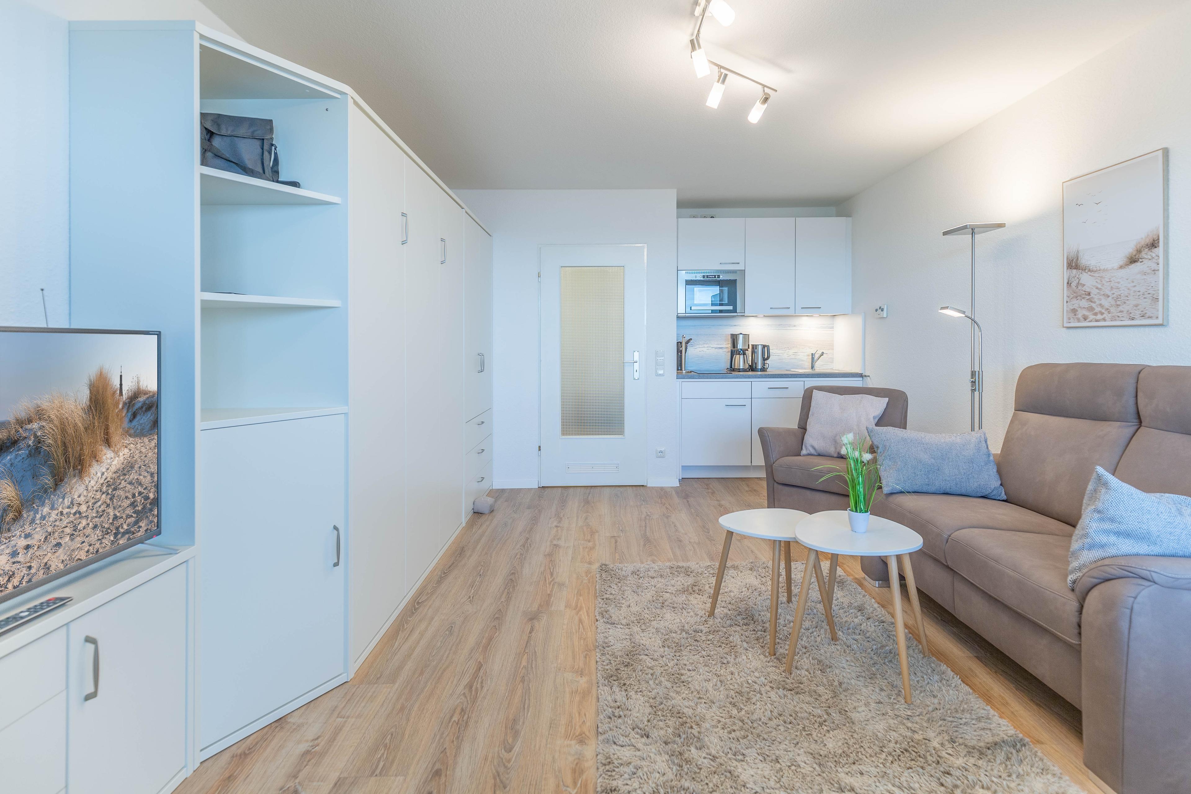 Der kombinierte Wohn- und Schlafbereich verfügt über eine kleine integrierte Küchenzeile mit einem Ceranfeld (2 Kochstellen), einem Geschirrspüler sowie einer Mikrowelle mit Crisp-Funktion. Das komfortable Schrankbett mit einer Liegefläche von 2x80x200 gewährleistet einen erholsamen Schlaf. Dank elektrischer Außenjalousien werden Sie nicht von der Morgensonne geweckt. Das Bad mit Dusche und WC verfügt über ein Fenster zum Belüften. Dank kostenlosem WLAN kommt keine Langeweile auf. Ein KFZ-Stellplatz ist vorhanden.