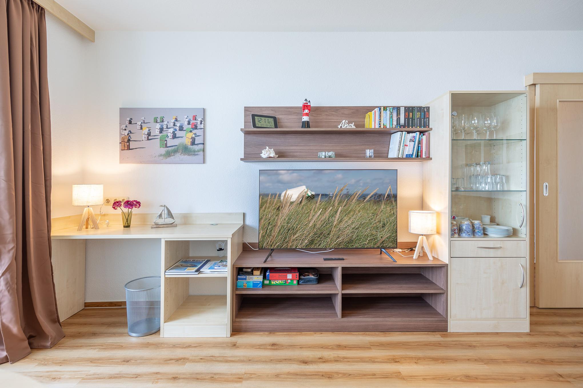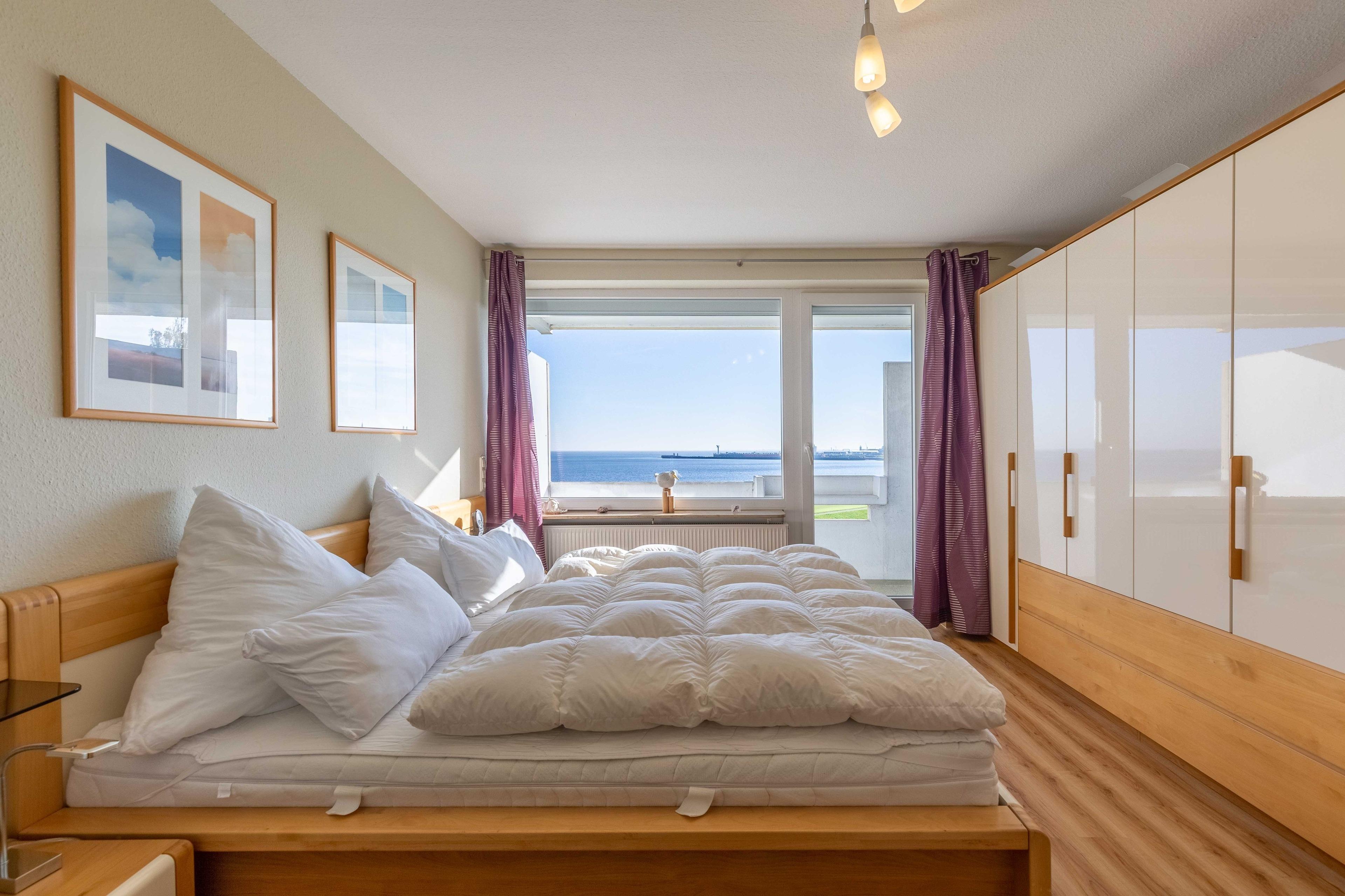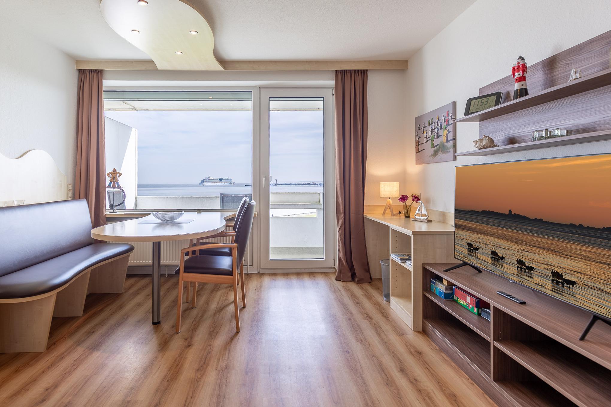 Der am Fenster gelegene Esstisch im Wohnbereich lädt Sie schon beim Frühstück zum Schiffe gucken ein. Die vorbeifahrenden Krabbenkutter, Segelschiffe und Luxus Liner scheinen zum Greifen nah. Morgens aufwachen und sich gleich die frische Meeresluft um die Nase pusten lassen, dafür brauchen Sie nur die Balkontür zu öffnen und können vom großen Doppelbett (2x90x200) aus den traumhaften Ausblick genießen. Ein Schrankbett (90x200) im Wohnbereich bietet eine weitere Schlafmöglichkeit. Damit Sie in den Morgenstunden nicht von der Sonne geweckt werden, sind alle Fenster mit elektrischen Außenjalousien ausgestattet. Die separate Küche im Eingangsbereich ist mit einem 2-Zonen-Ceranfeld, einem Geschirrspüler sowie einem Kühlschrank und einer Mikrowelle ausgestattet. Zur Ferienwohnung gehört ein modernes Bad mit Dusche und ein separates WC. Sowohl das Wohnzimmer, als auch das Schlafzimmer verfügen über einen Balkon mit Meerblick.