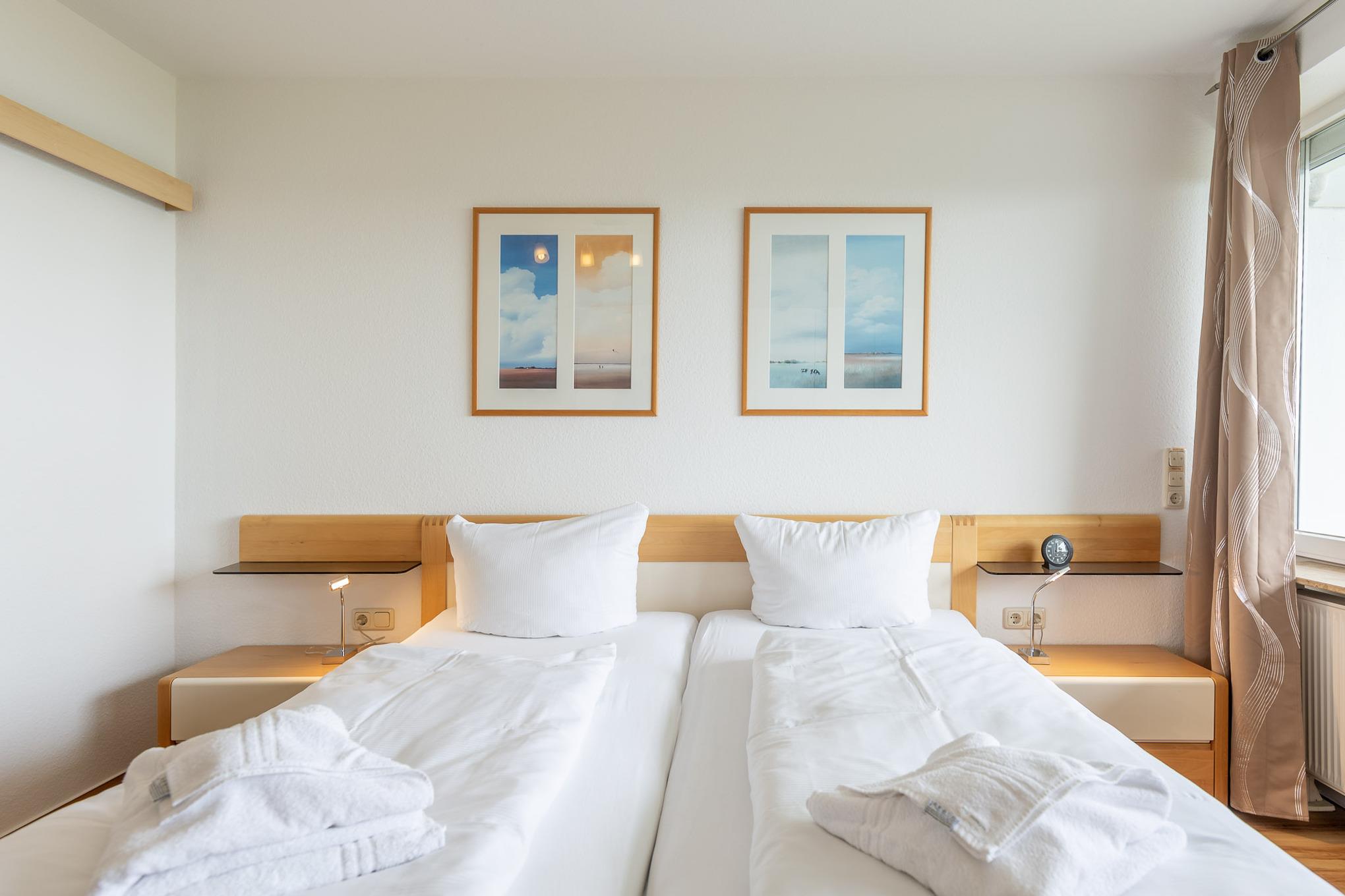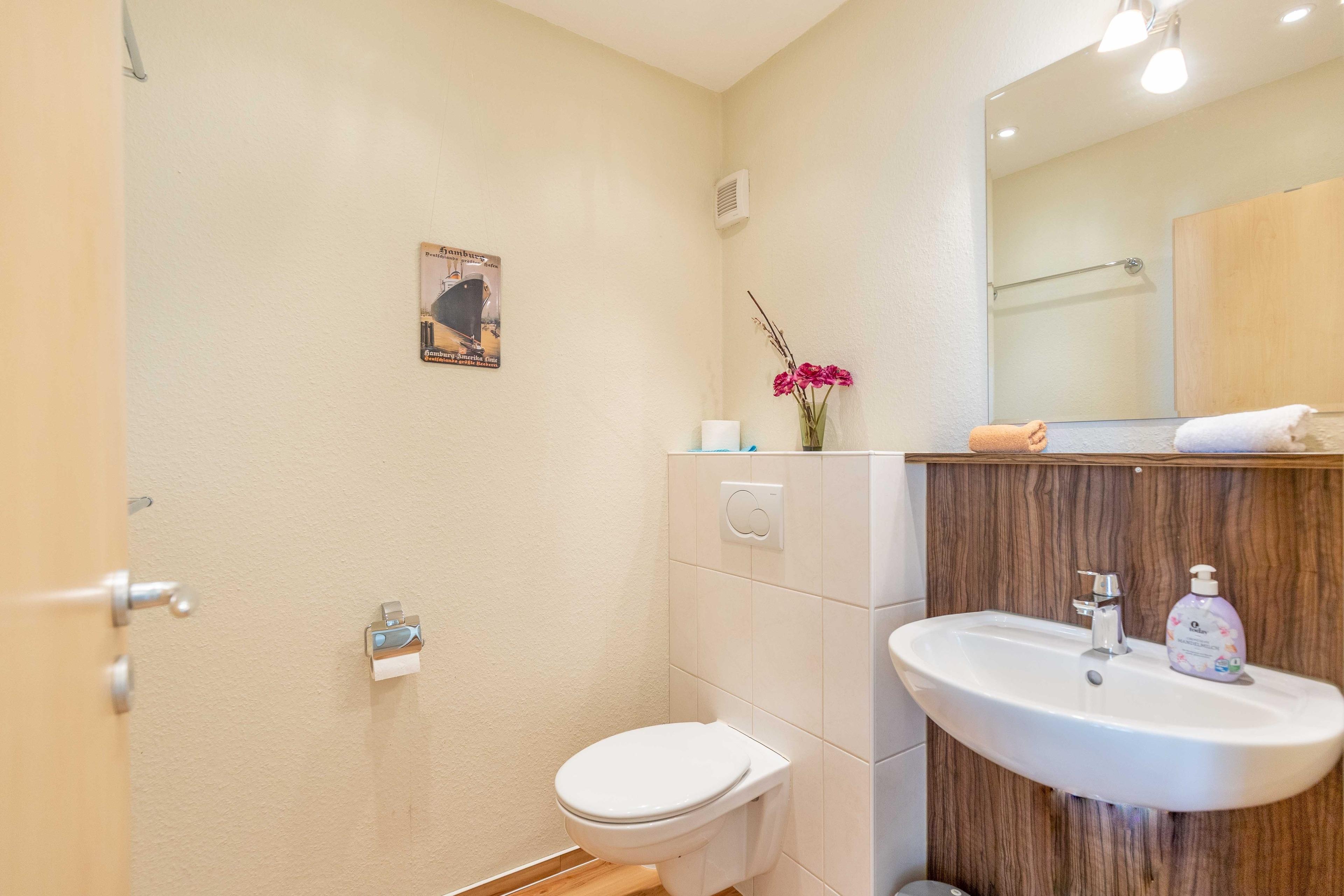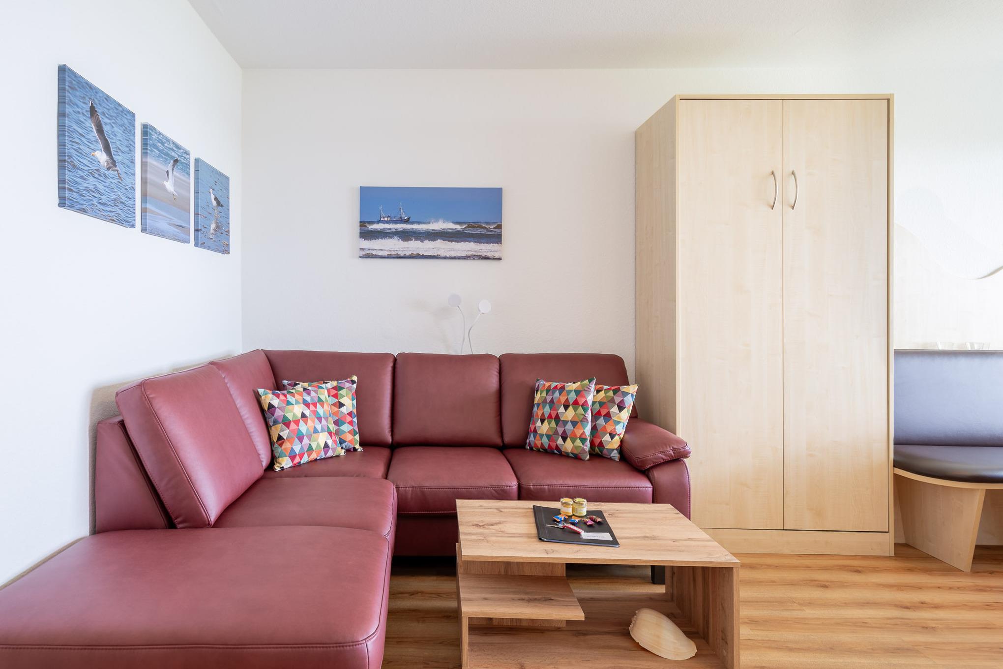 Der am Fenster gelegene Esstisch im Wohnbereich lädt Sie schon beim Frühstück zum Schiffe gucken ein. Die vorbeifahrenden Krabbenkutter, Segelschiffe und Luxus Liner scheinen zum Greifen nah. Morgens aufwachen und sich gleich die frische Meeresluft um die Nase pusten lassen, dafür brauchen Sie nur die Balkontür zu öffnen und können vom großen Doppelbett (2x90x200) aus den traumhaften Ausblick genießen. Ein Schrankbett (90x200) im Wohnbereich bietet eine weitere Schlafmöglichkeit. Damit Sie in den Morgenstunden nicht von der Sonne geweckt werden, sind alle Fenster mit elektrischen Außenjalousien ausgestattet. Die separate Küche im Eingangsbereich ist mit einem 2-Zonen-Ceranfeld, einem Geschirrspüler sowie einem Kühlschrank und einer Mikrowelle ausgestattet. Zur Ferienwohnung gehört ein modernes Bad mit Dusche und ein separates WC. Sowohl das Wohnzimmer, als auch das Schlafzimmer verfügen über einen Balkon mit Meerblick.