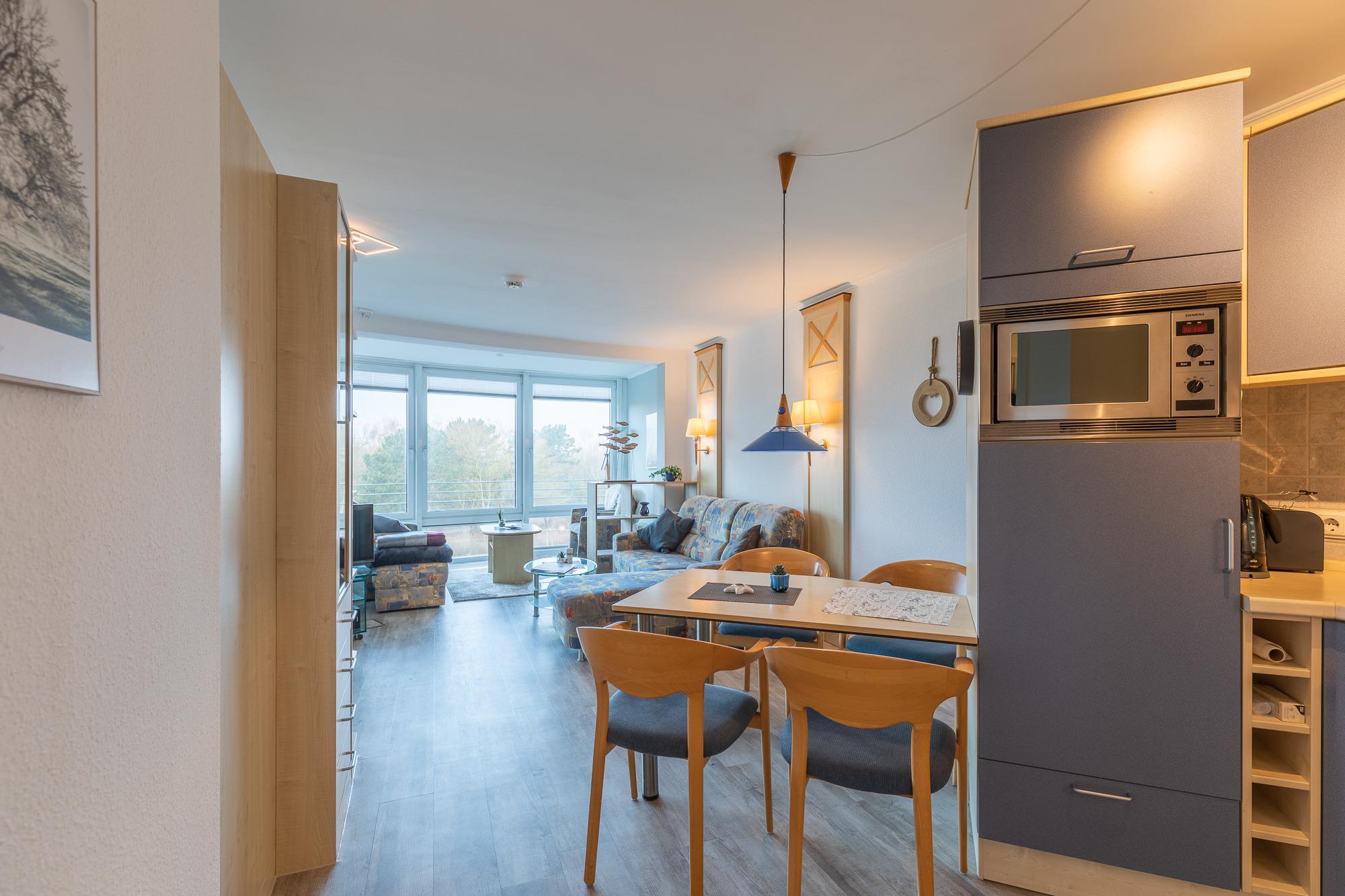 Die schöne 2 Zimmer Wohnung im 2. Obergeschoss, für bis zu 4 Personen, 1 Wohnzimmer mit 2 gemütlichen Sitzecken (2er und 3er Sofa, 1 Sessel), Essplatz für 4 Personen, Küchenzeile (4 Plattenherd, Backofen, Geschirrspüler, Kaffeemaschine, Wasserkocher, Toaster und Mikrowelle), TV, ein innenliegendes Schlafzimmer mit 2 Einzelbetten und Kleiderschrank (das innenliegende Schlafzimmer verfügt oberhalb über 3 schmale Fenster, die zum Wohnzimmer geöffnet werden können), Bad mit Dusche und WC, Balkon (mit Tisch und 4 Stühlen), Fahrstuhl im Haus, reservierter PKW Stellplatz in der Tiefgarage.