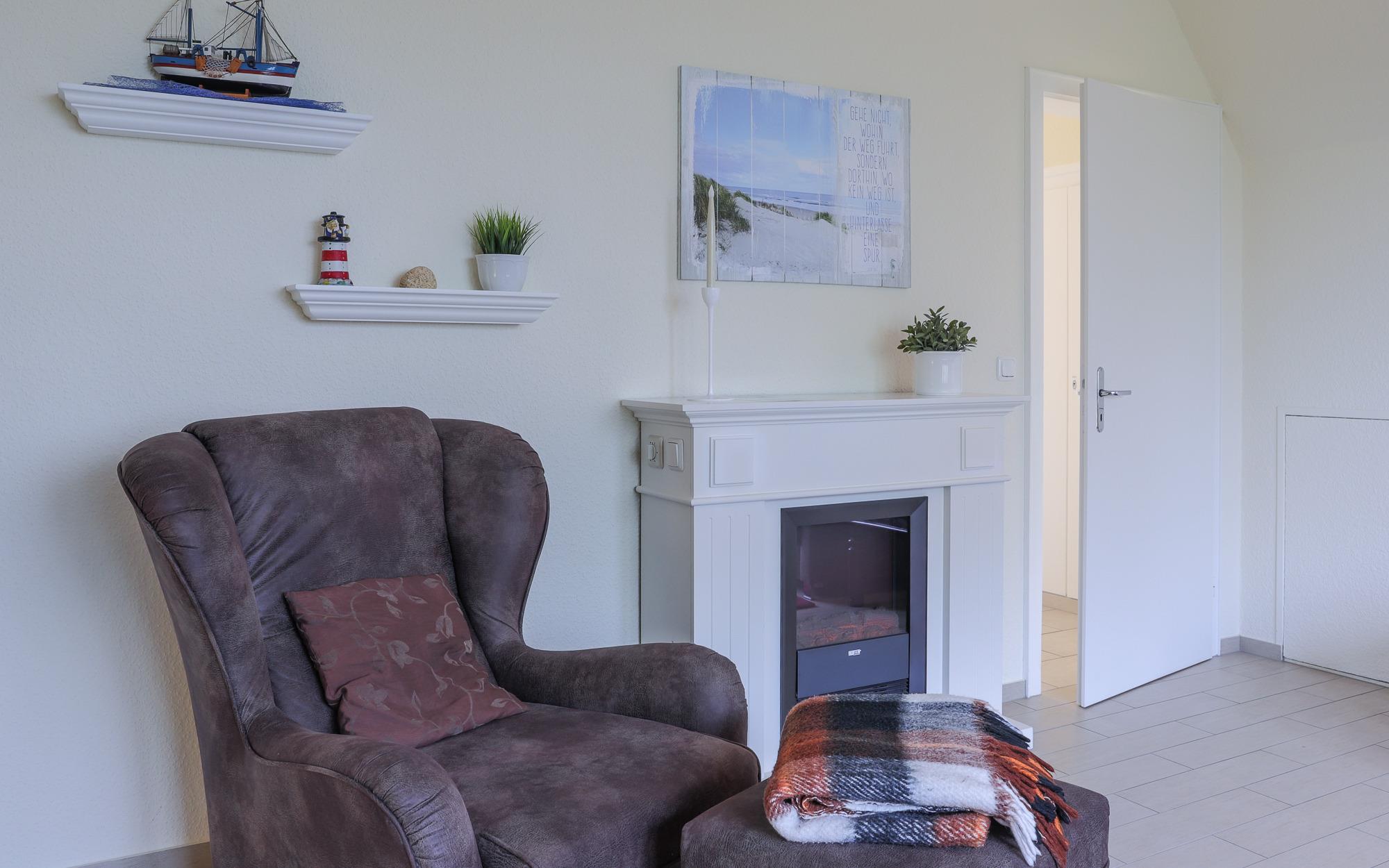 Wohnbereich: Gemütliche Sofaecke, zusätzl. Schlafsofa (160 × 200 cm, Lattenrost), elektrischer Kamin für Wohlfühlatmosphäre, Ausrichtung zum Deich