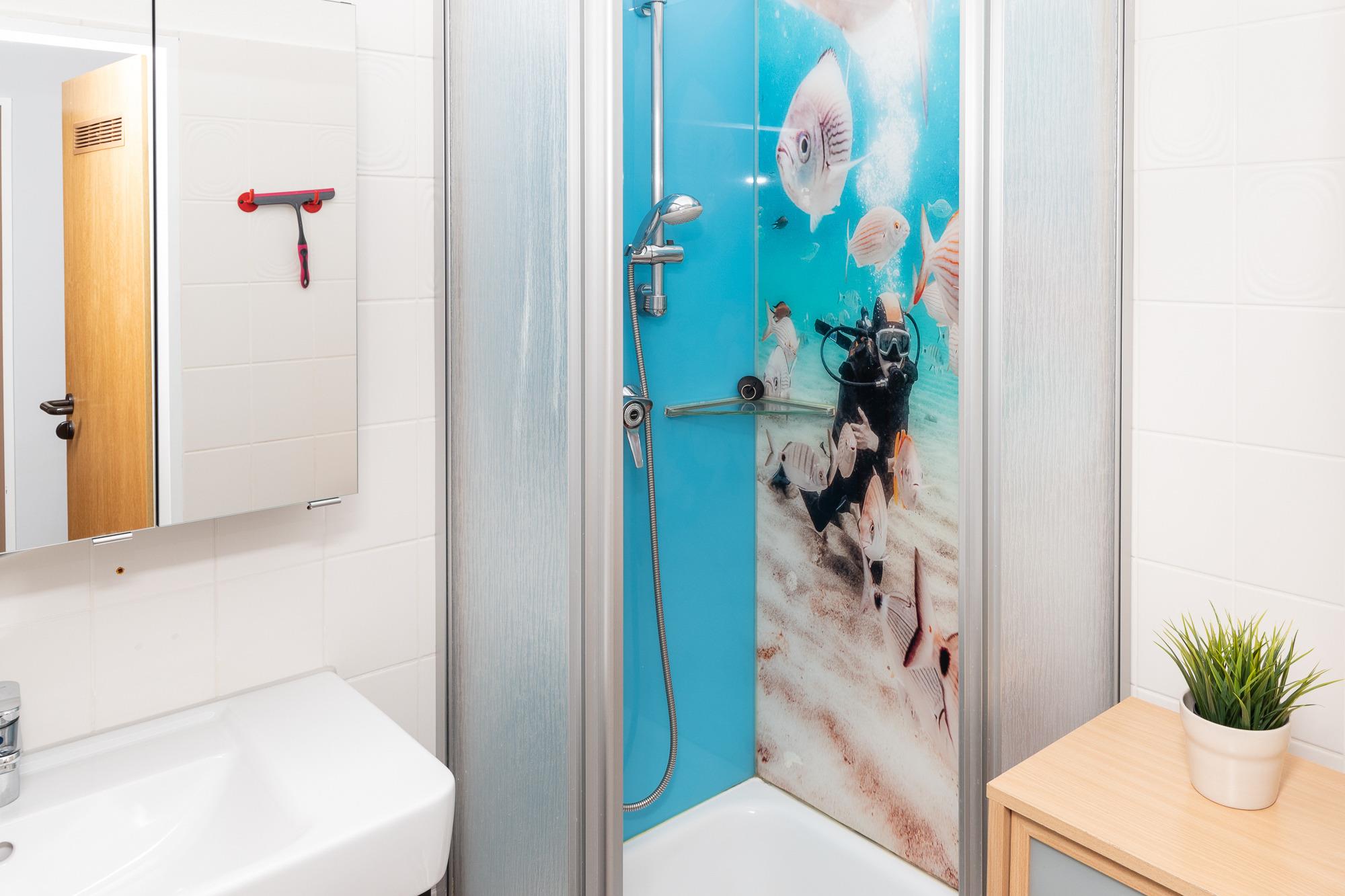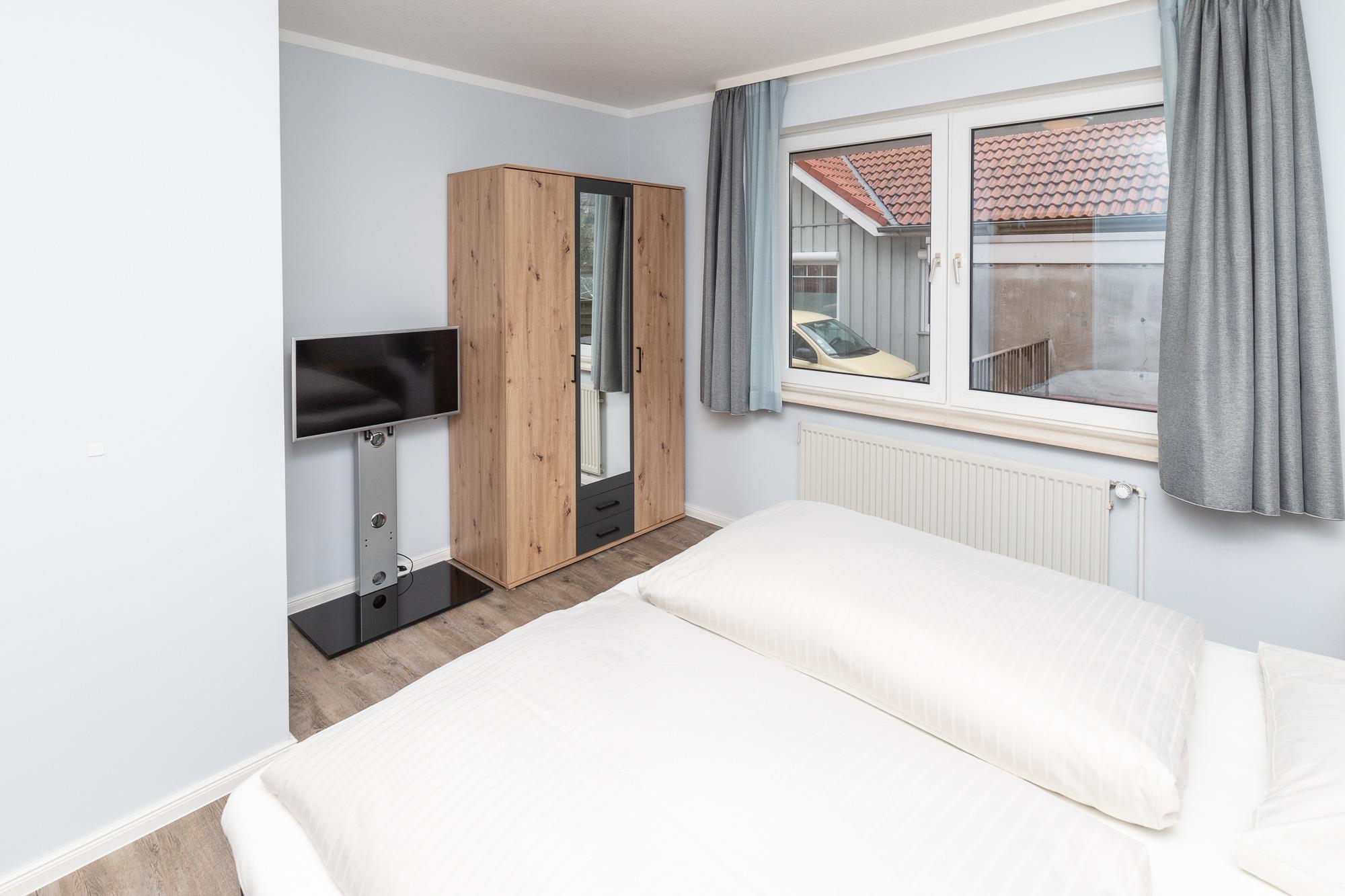 Zwei Schlafbereiche mit komfortablen Doppelbetten bieten erholsame Nächte. Das Badezimmer/WC ist mit Dusche und Fön ausgestattet.