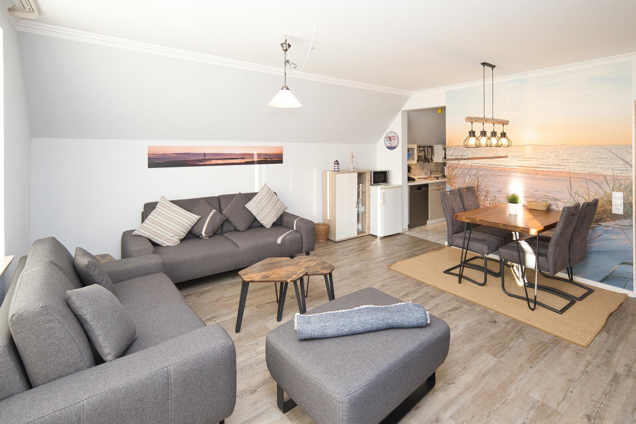 Der Wohnbereich ist mit einer gemütlichen Couchgarnitur, Satelliten-HD-TV, Radio und kostenlosem WLAN ausgestattet. Ein separater Essplatz für 4 Personen sowie die gut ausgestattete Küche mit Spülmaschine, Backofen, Kaffeemaschine und Toaster runden das Angebot ab.