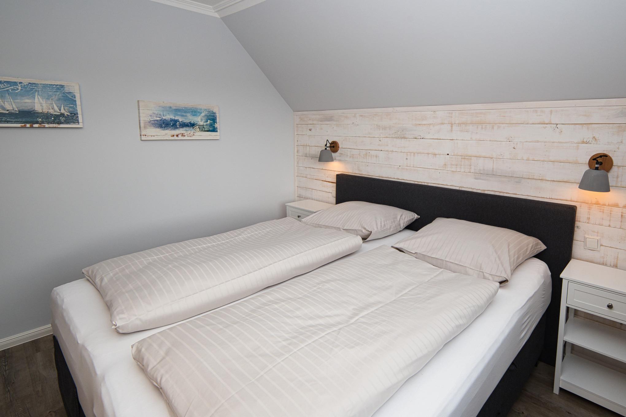 Zwei Schlafbereiche mit komfortablen Doppelbetten bieten erholsame Nächte. Das Badezimmer/WC ist mit Dusche und Fön ausgestattet.