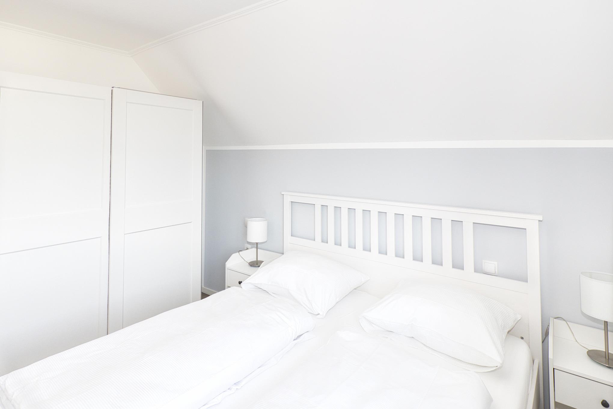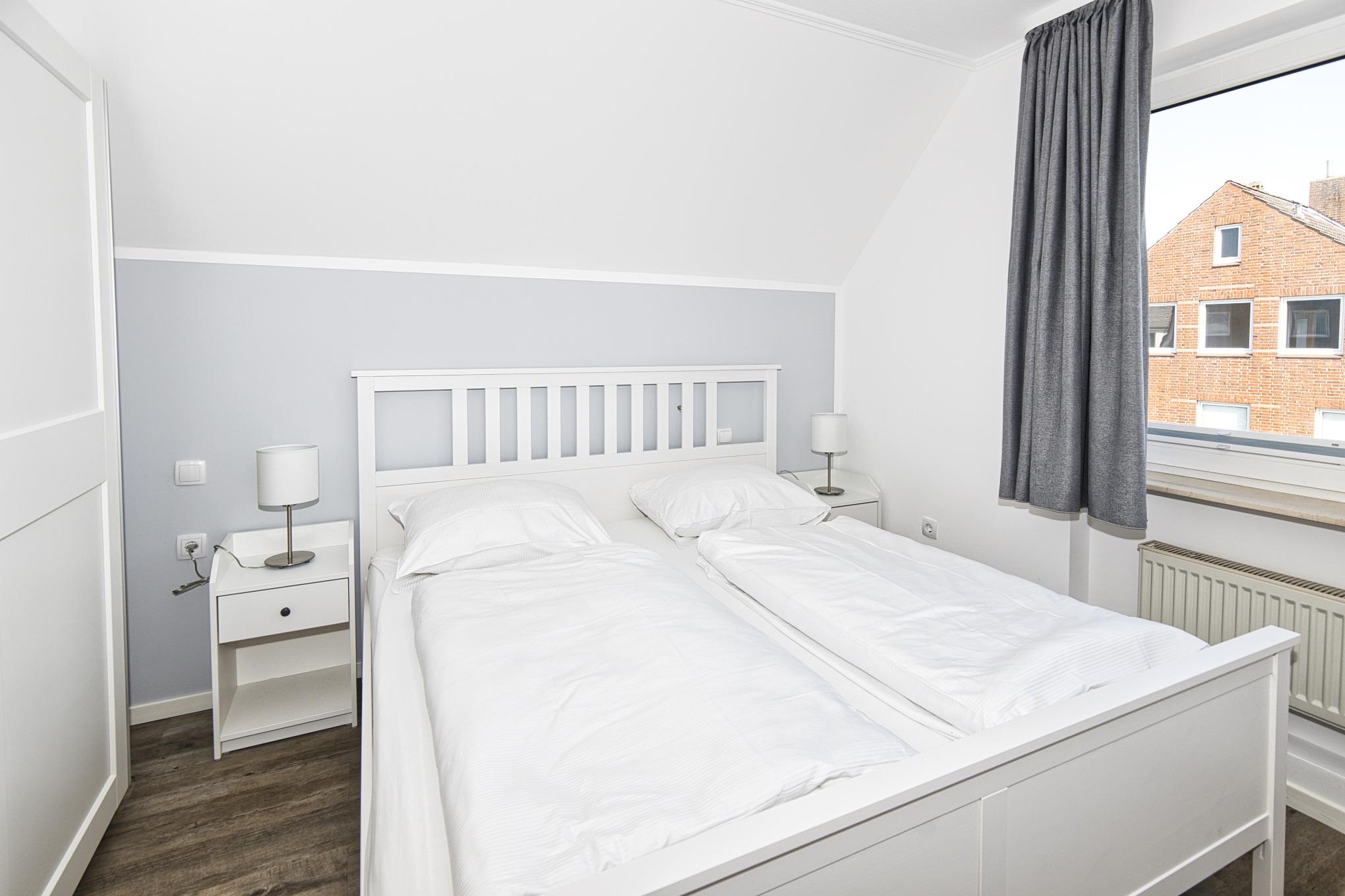 Das Schlafzimmer bietet ein Doppelbett (180×200?cm) und einen Kleiderschrank. Das Duschbad/WC mit Tageslicht ist innerhalb der Wohnung vorhanden.