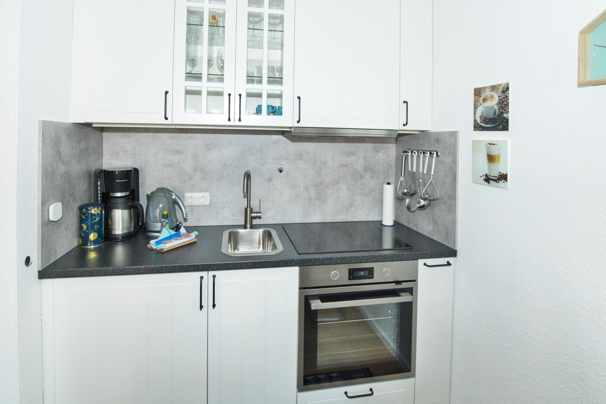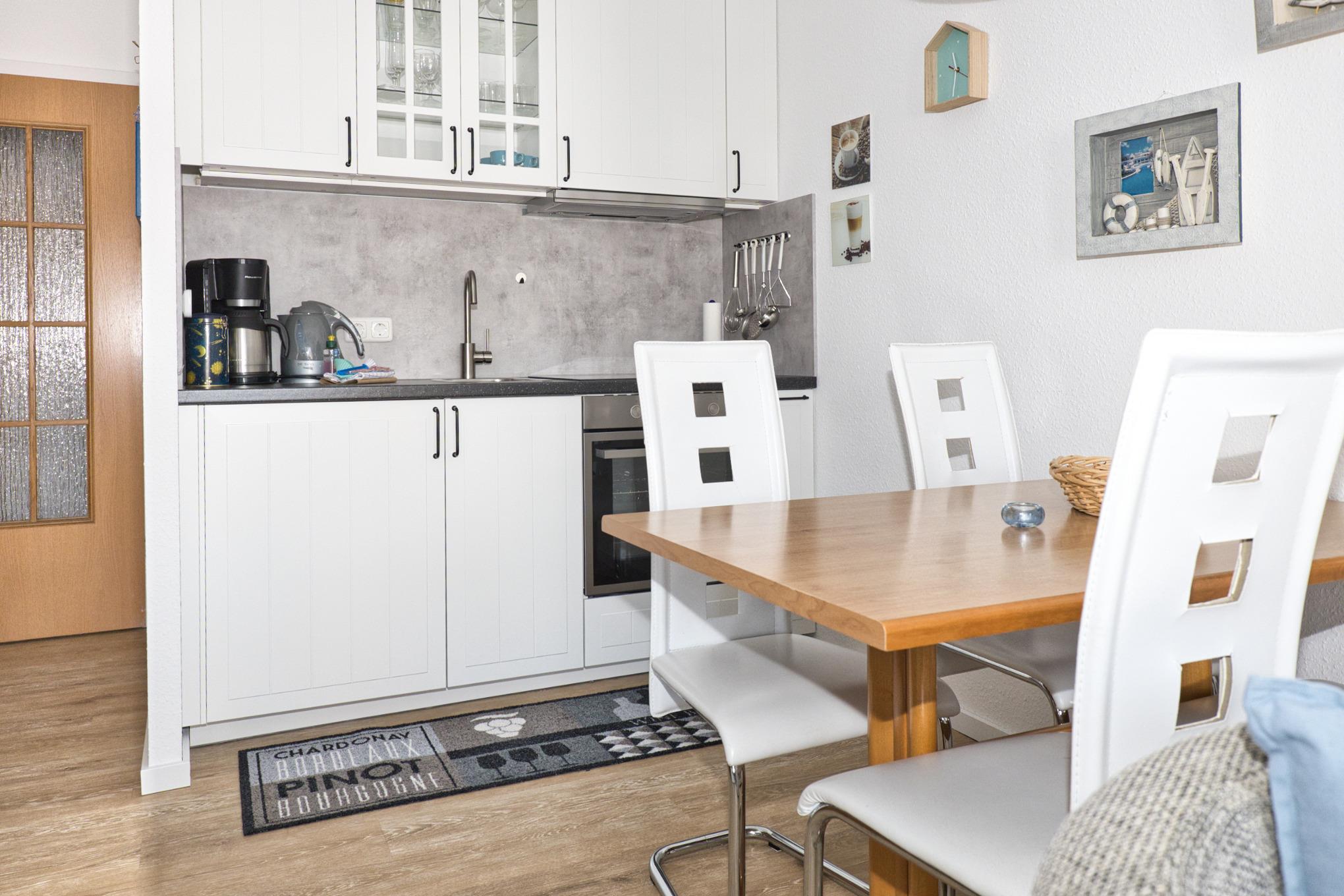 Die kleine Einbauküche ist für den Ferienalltag ausreichend ausgestattet. Direkt daneben befindet sich der Essplatz, an dem bis zu vier Personen bequem sitzen können.