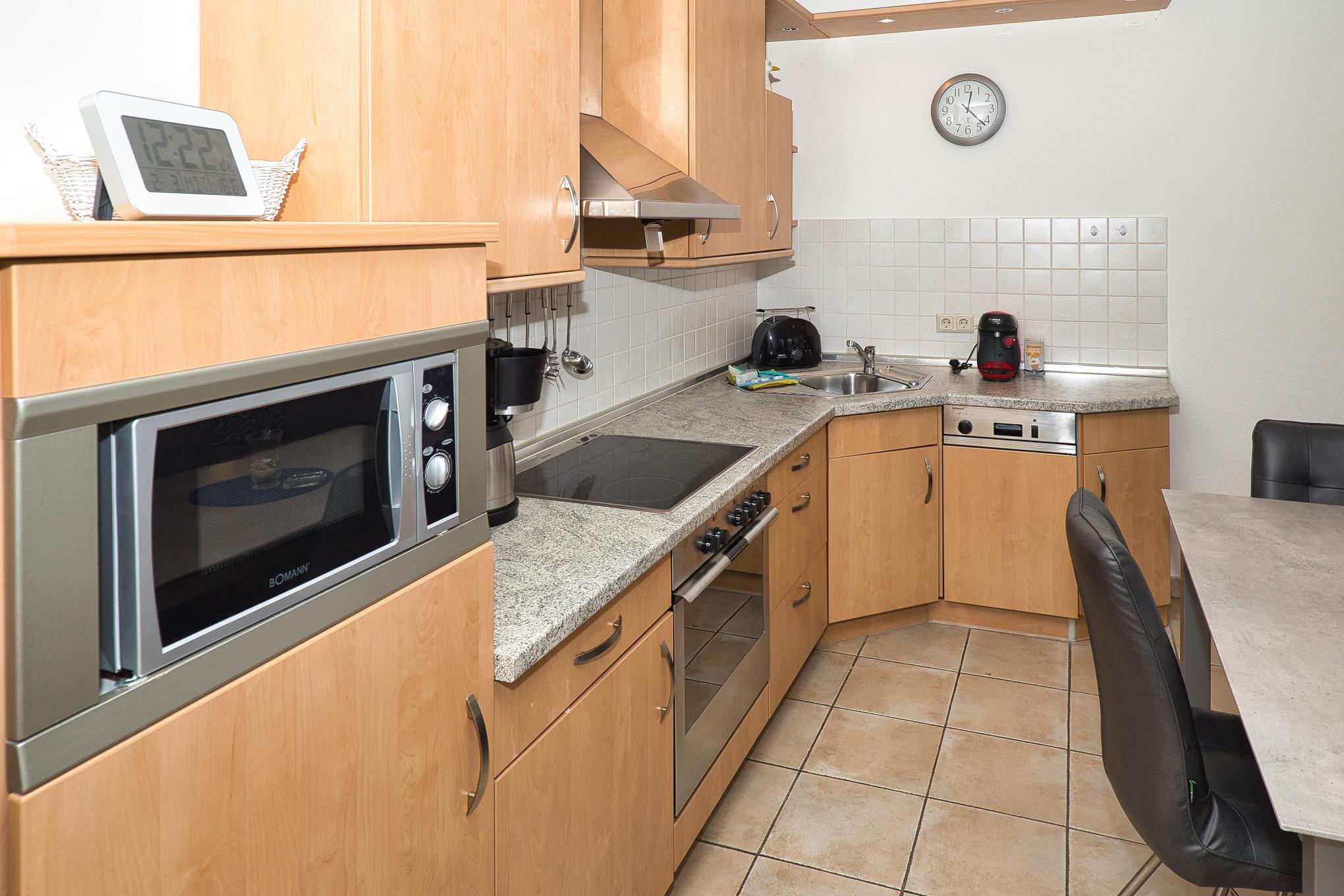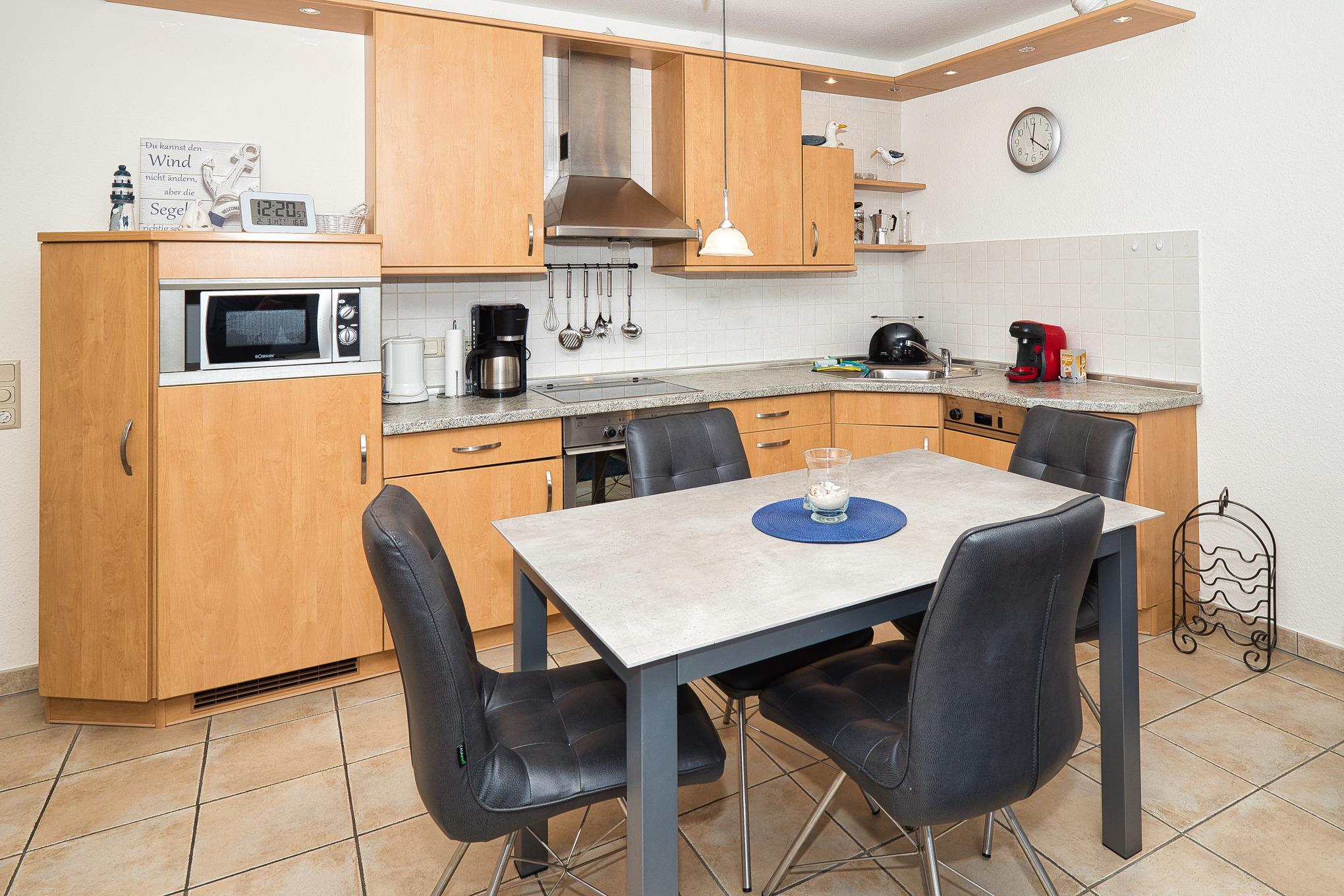 Die Wohnung selbst bietet eine gemütliche und komfortable Atmosphäre. Der Wohn- und Essbereich lädt zum Verweilen ein und ist gut ausgestattet. Die offene Einbauküche fügt sich nahtlos in den Wohnbereich ein und bietet alles, was man für die Zubereitung von Mahlzeiten benötigt. Vom Wohnbereich aus gelangen Sie auf den Westbalkon, wo Sie die frische Luft genießen und den Tag ausklingen lassen können.