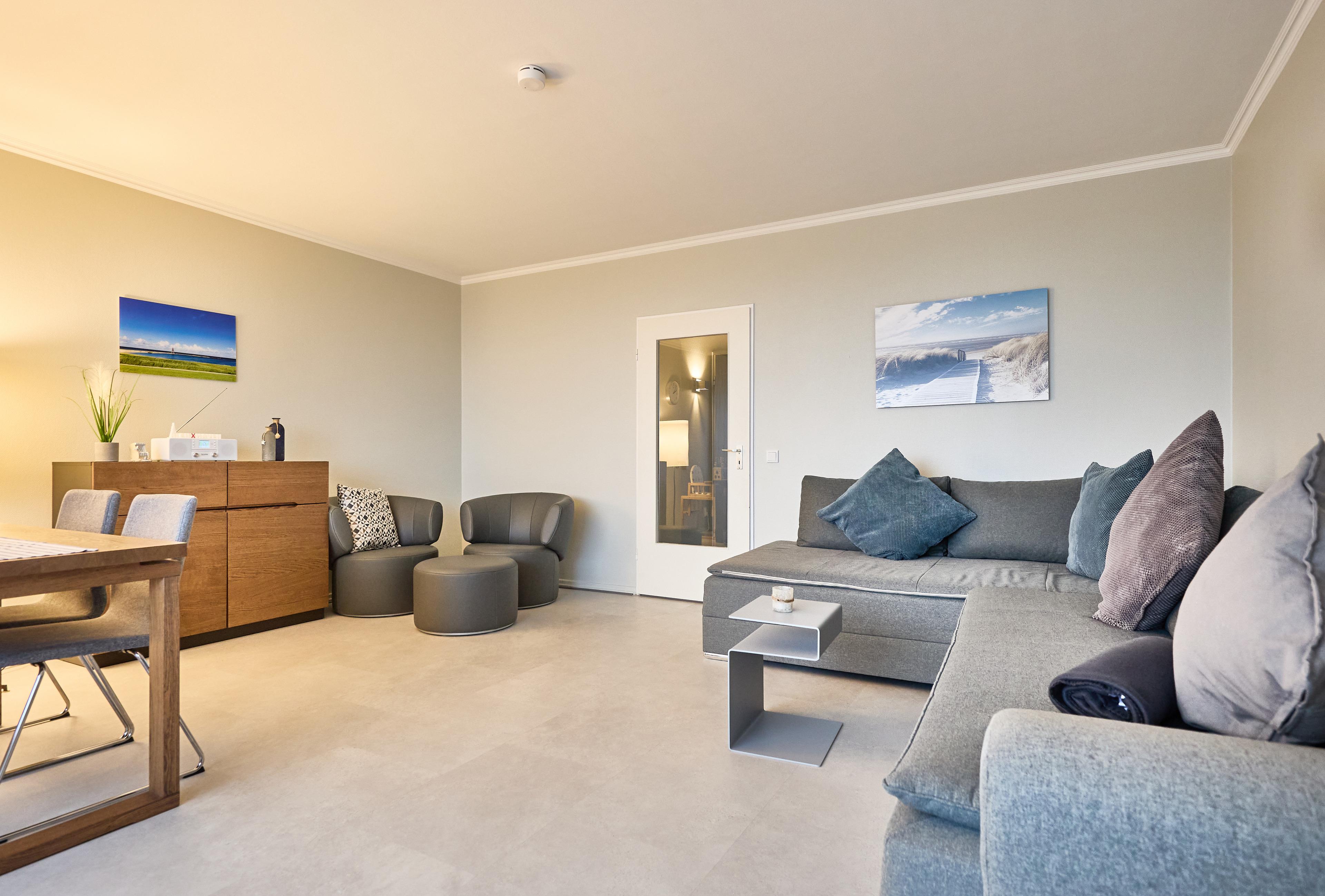 Die Wohnung ist liebevoll eingerichtet und bietet Ihnen alles, was Sie für einen angenehmen Aufenthalt benötigen. Die separate, gut ausgestattete Küche ermöglicht Ihnen die Zubereitung Ihrer Lieblingsgerichte. Das moderne Duschbad mit WC sorgt für den nötigen Komfort. Im Schlafzimmer erwarten Sie zwei gemütliche Einzelbetten, ein geräumiger Kleiderschrank und ein Schreibtisch, der Ihnen auch im Urlaub einen ruhigen Arbeitsplatz bietet. Der großzügige Wohn- und Essbereich lädt mit einer bequemen Couch zum Entspannen ein, während der Esstisch am Fenster mit Blick auf die Nordsee perfekt für gemütliche Mahlzeiten oder einen Spieleabend ist. Der TV lässt sich schwenken und Sie von verschiedenen Plätzen gut sehen.