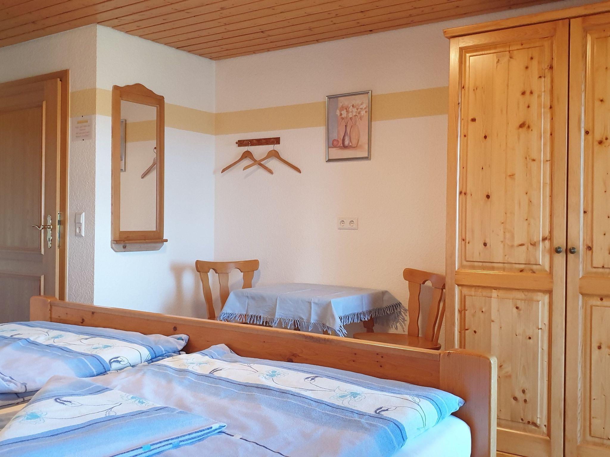 - You can expect a cosy, country-style furnished apartment with 80 sqm on the 2nd floor, accessible via 2 stairs, with parquet and laminate floors, balcony with table and chairs and a wonderful panoramic view - 2 double rooms with (200x200 cm), one with direct access to the balcony, in one of the rooms it is possible to set up a cot, - each of the double rooms has its own shower/WC - 1 separate twin room with shower/WC, directly opposite the flat can be booked in addition. - the kitchen as well as the living room are two separate rooms, - in the spacious hallway you will find a wardrobe with shoe racks, - the fully equipped kitchenette is equipped with dishwasher, cooker with oven, bread machine, microwave, water/egg cooker, toaster, blender, waffle iron, coffee machine, Senseo pad machine, blender etc.