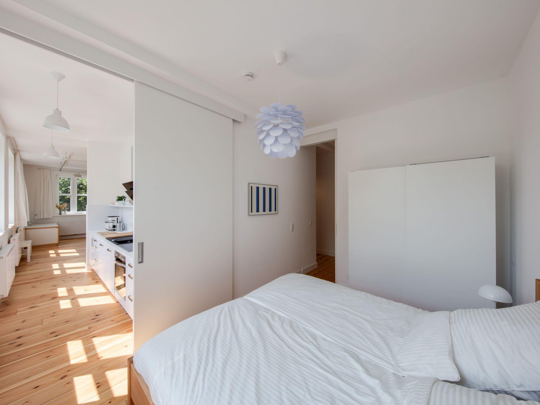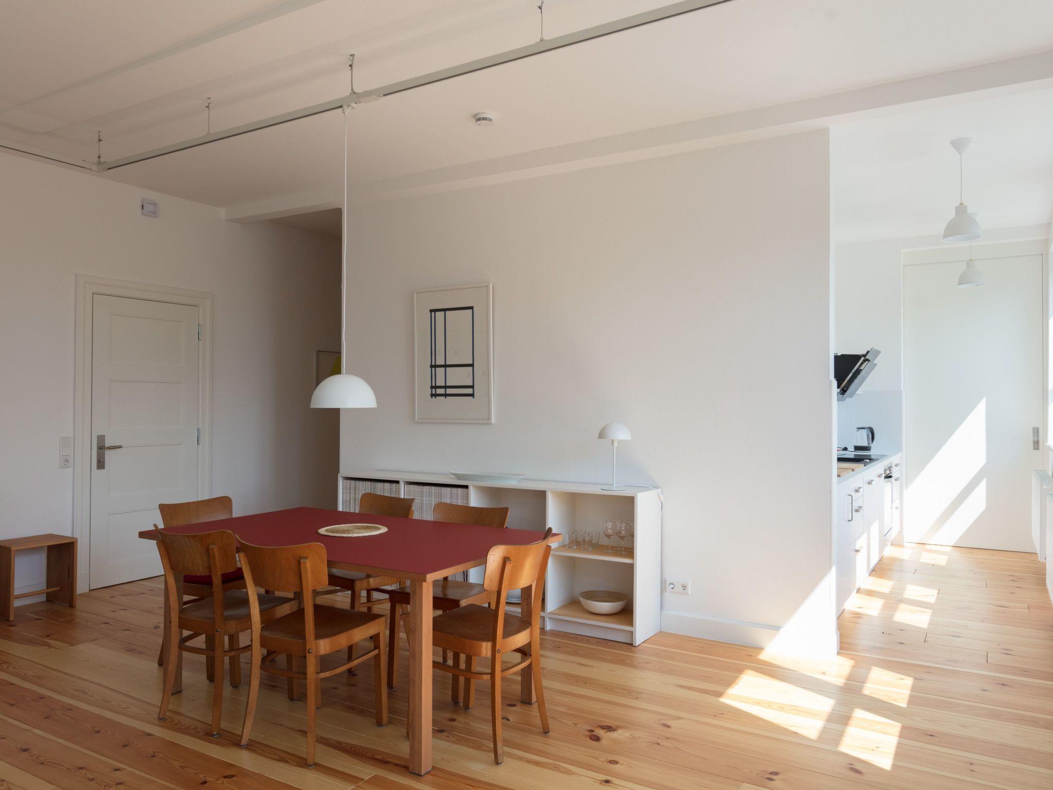 Inside the holiday flat, you will be greeted by well thought-out furnishings that will fulfil all your needs during your stay. The flat extends to 95 m² and has two separate bedrooms, one of which is equipped with a TV. The modern open-plan kitchen, complete with ceramic hob, filter coffee machine, kettle and a dishwasher, leaves nothing to be desired. The spacious loft-style living and dining area, also equipped with a TV, provides the perfect setting for spending time together. A washing machine for your sole use is also available, guaranteeing maximum comfort even during longer stays.