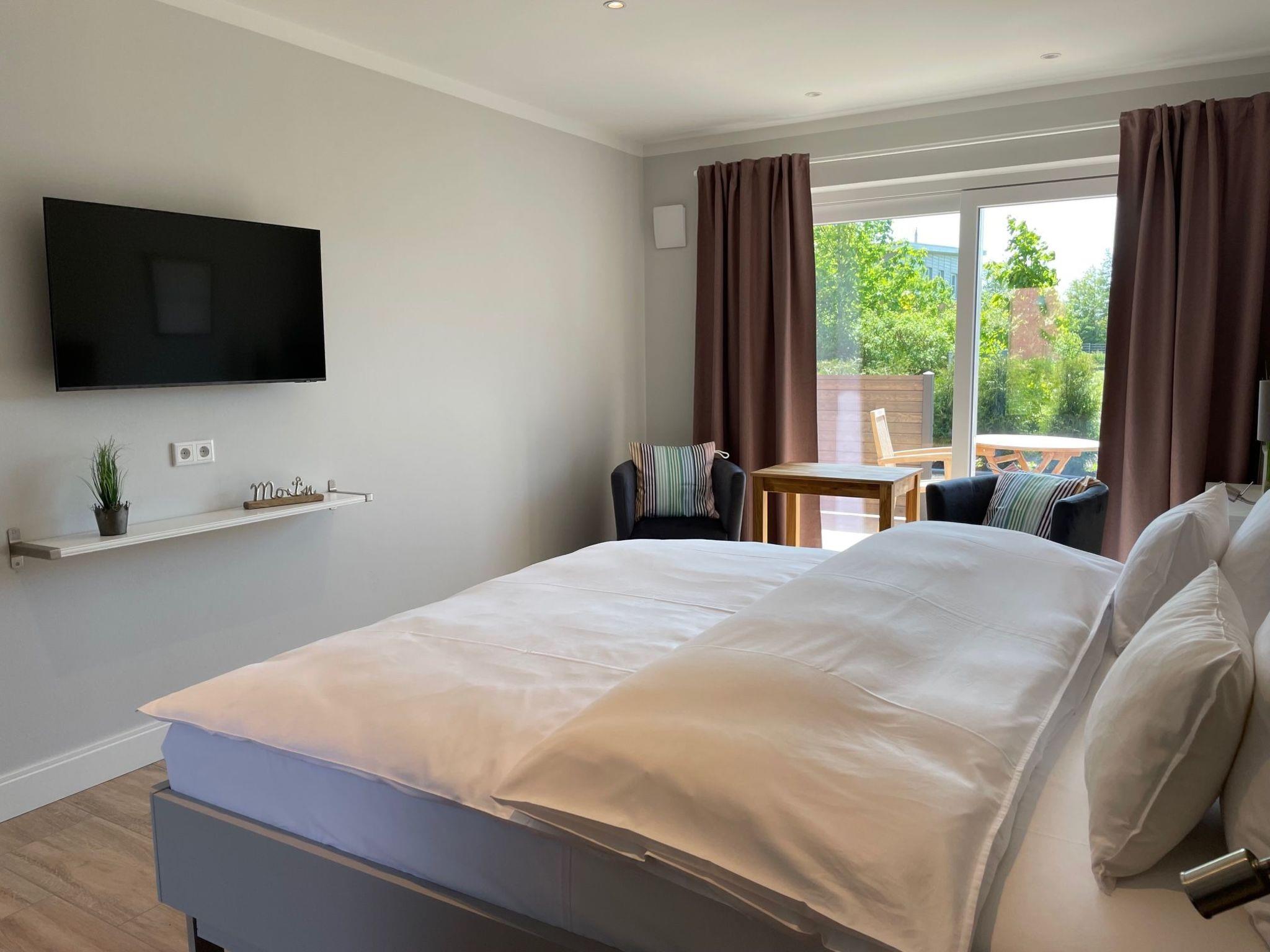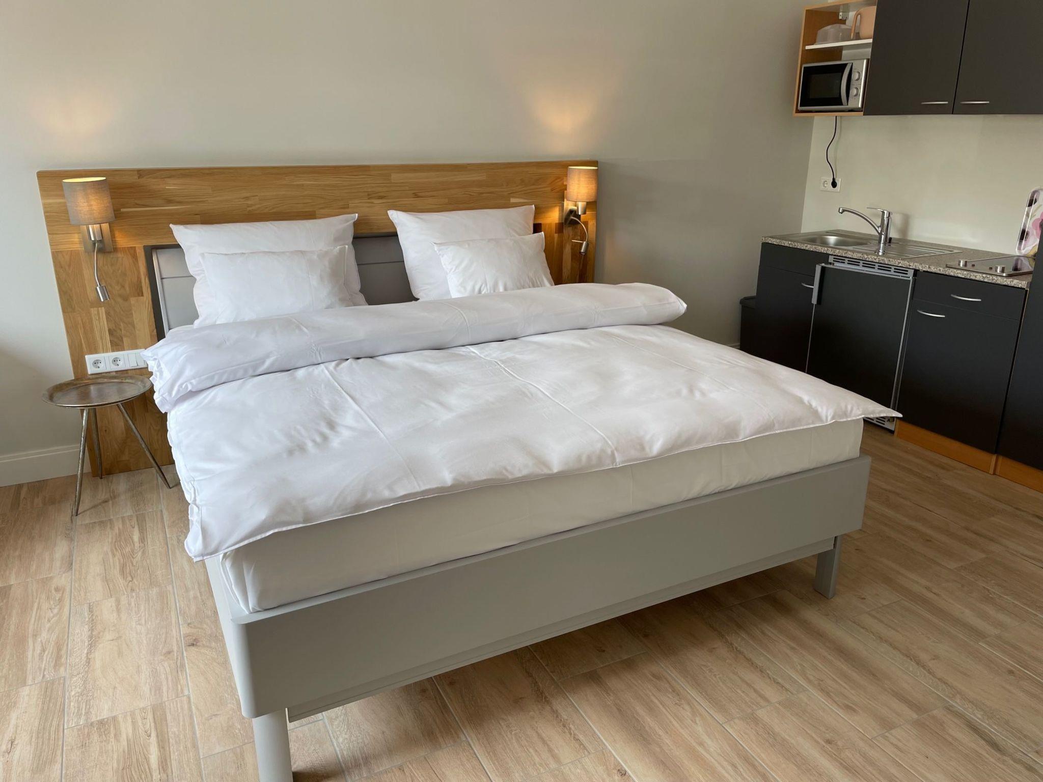 In each of our 30 m² holiday flats you will find everything you need for a relaxing stay. The flats have a cosy bedroom and living room with an integrated kitchen, equipped with a practical 2-plate cooker and a filter coffee machine for the perfect start to the day. Thanks to the underfloor heating, which provides cosy warmth throughout the flat, you will feel completely at ease even on cooler days. There is also a modern bathroom with a reliable shower, complemented by amenities such as a TV and WiFi for your entertainment and networking needs.