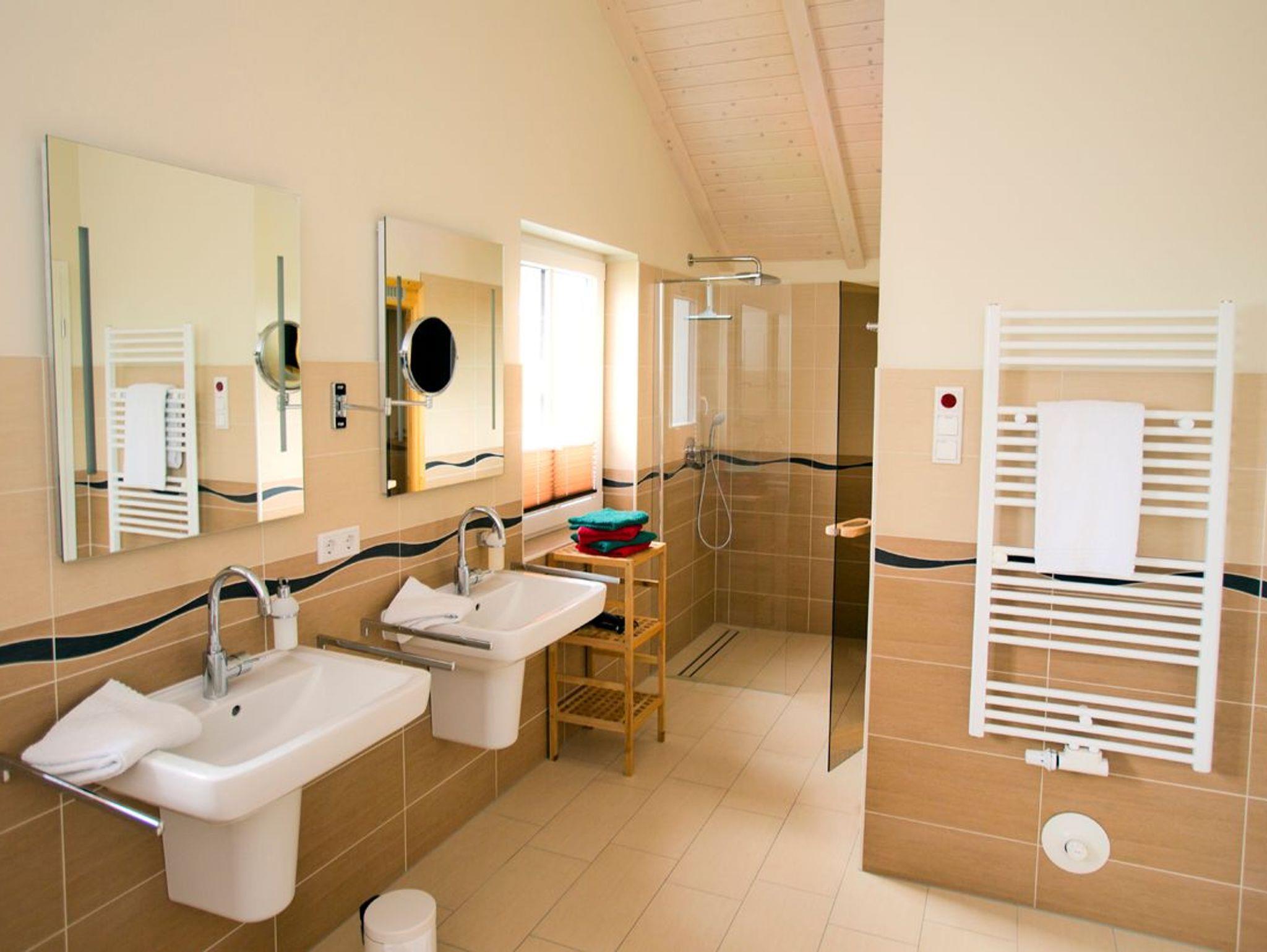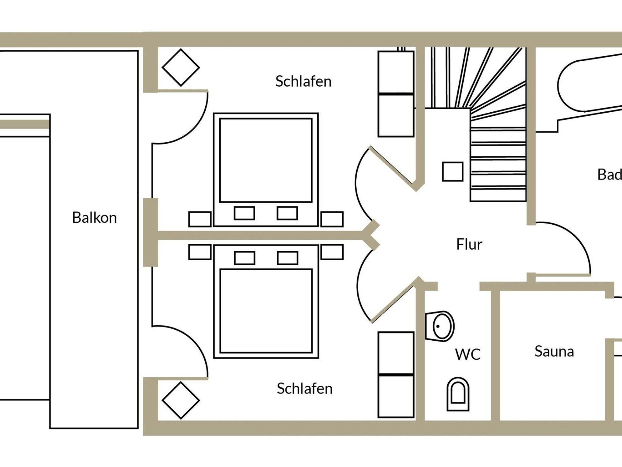 Im Obergeschoss erwartet Sie ein großzügiges Wellnessbad mit XXL-Badewanne, Dusche und Sauna. Zwei Schlafzimmer mit Doppelbetten und Zugang zum Balkon bieten Rückzugsorte mit Ausblick.