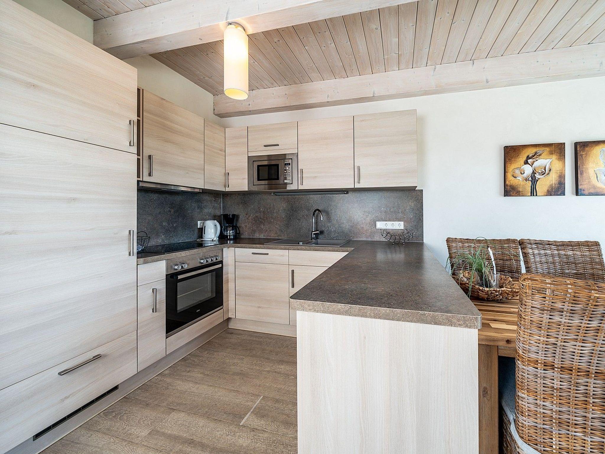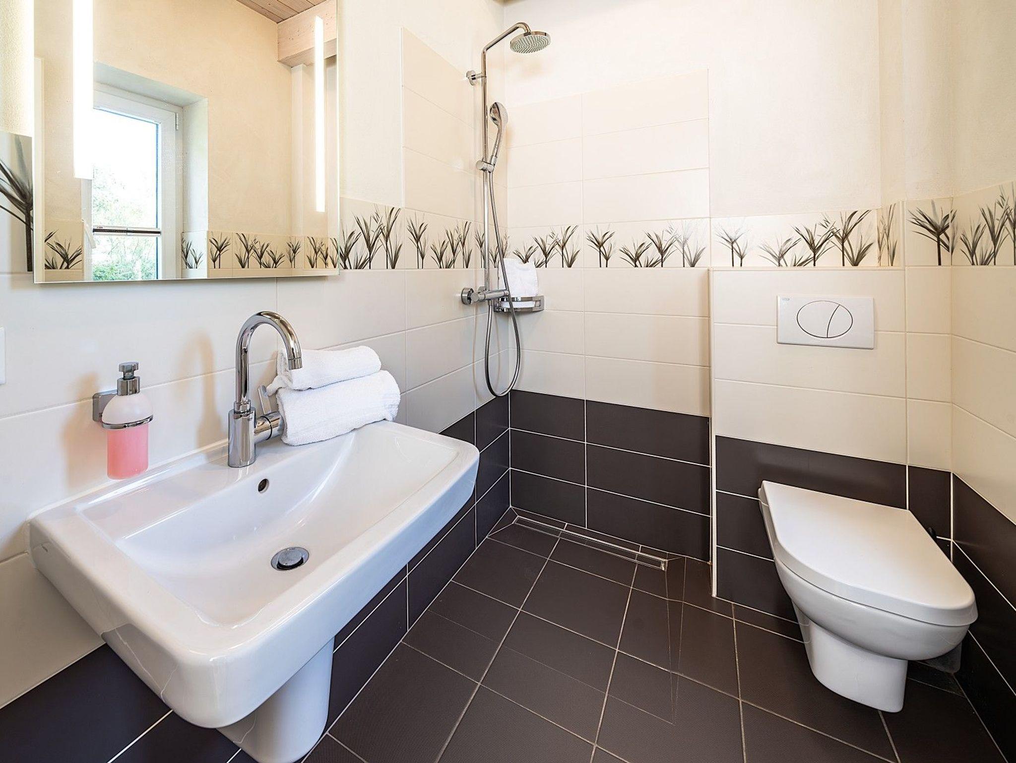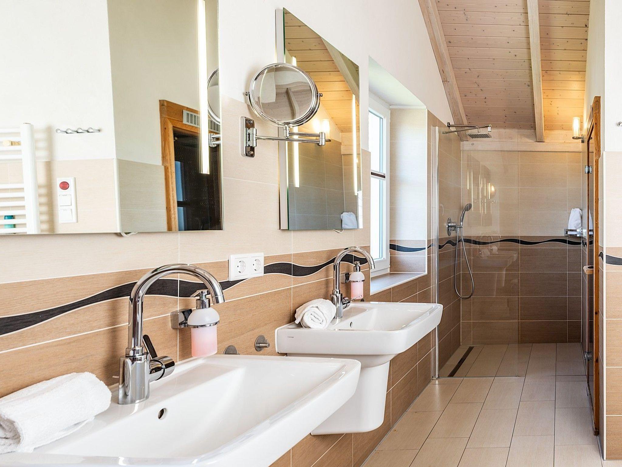 Im Inneren sorgt ein offener Wohn- und Essbereich mit moderner Küche, Kaminofen und gemütlicher Sofaecke für eine angenehme Atmosphäre. Das Obergeschoss verfügt über ein Wellnessbad mit großer Sauna und einer Badewanne im XXL-Format für zwei Personen. Im Erdgeschoss befindet sich ein barrierearmes Bad mit ebenerdiger Dusche.