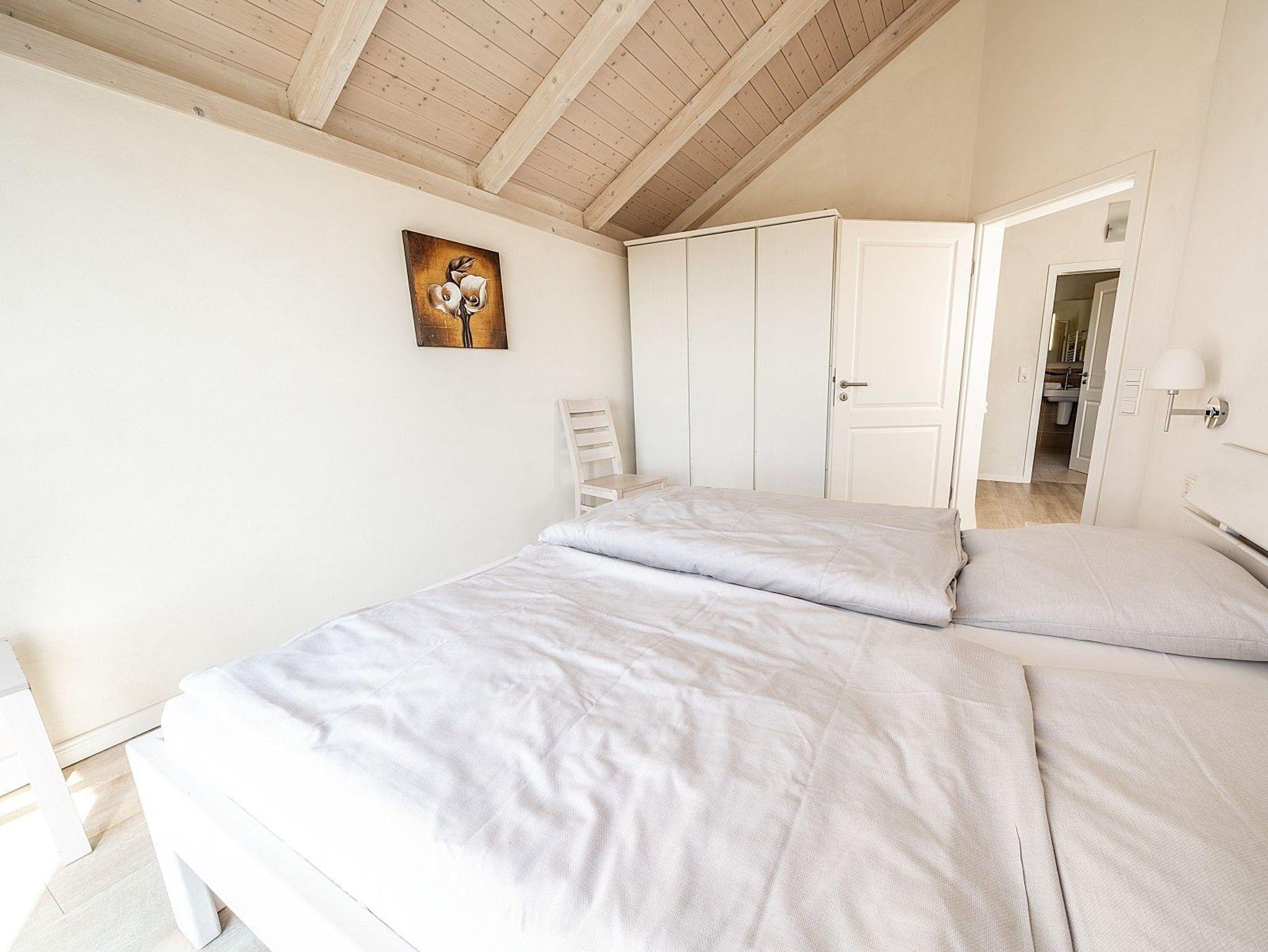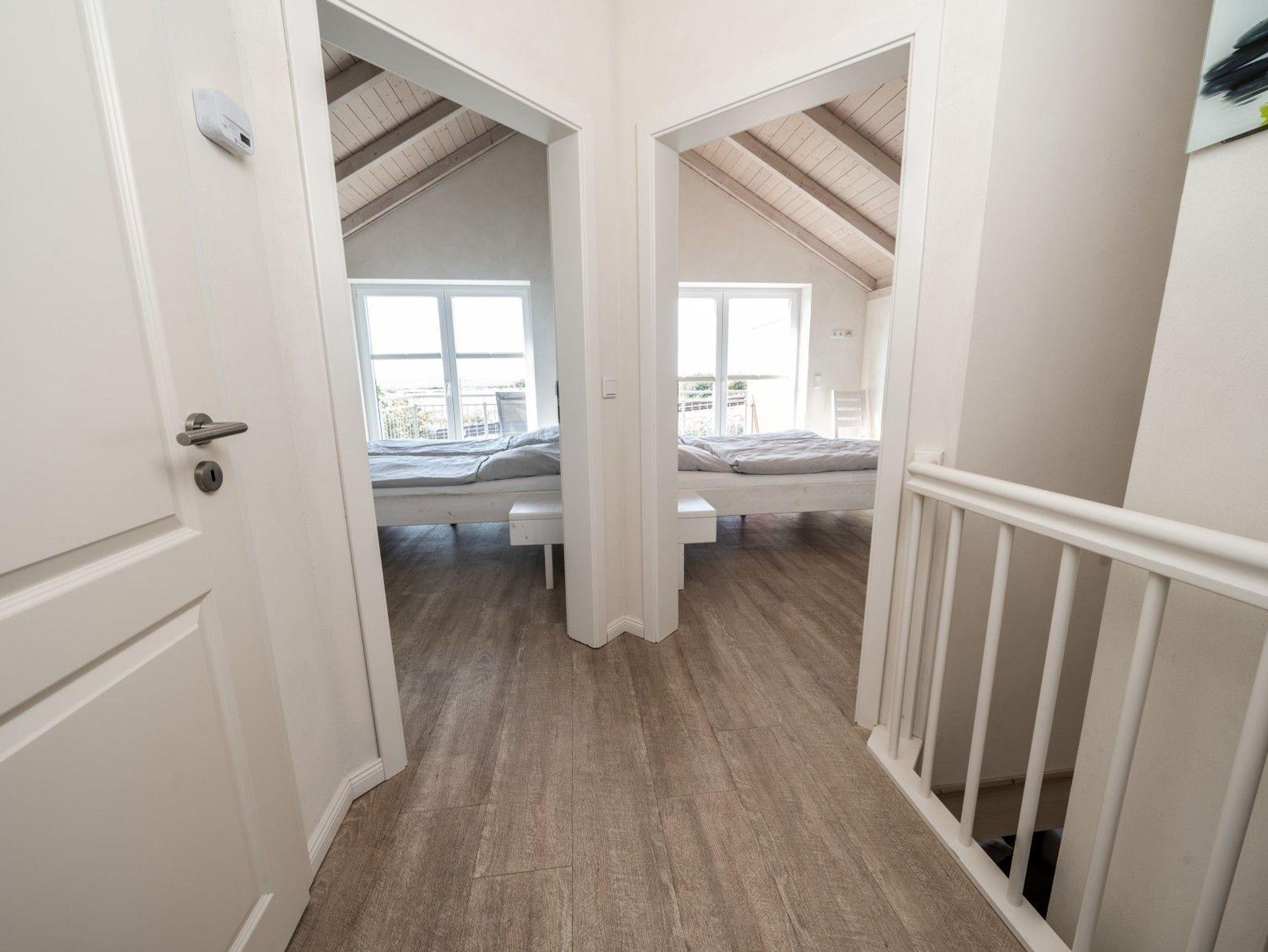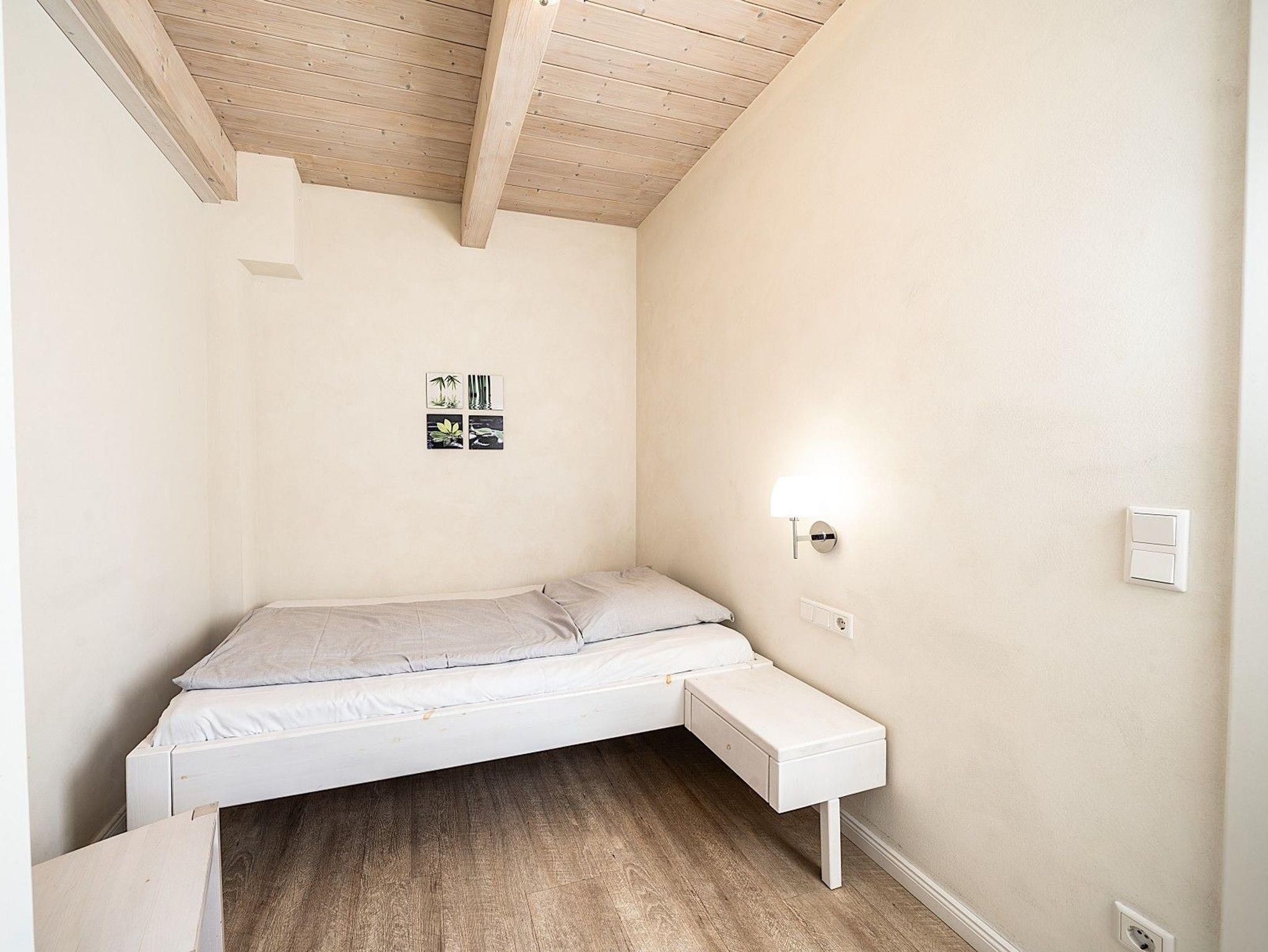 Das Einzelzimmer mit 1,20 m breitem Bett liegt ebenfalls im Erdgeschoss und eignet sich besonders für Gäste, die Treppen vermeiden möchten. Zwei weitere Schlafzimmer mit Doppelbetten befinden sich im Obergeschoss. Für Radfahrer ist eine abschaltbare Steckdose zum Laden von E-Bikes vorhanden, zudem steht eine eigene Waschmaschine bereit.