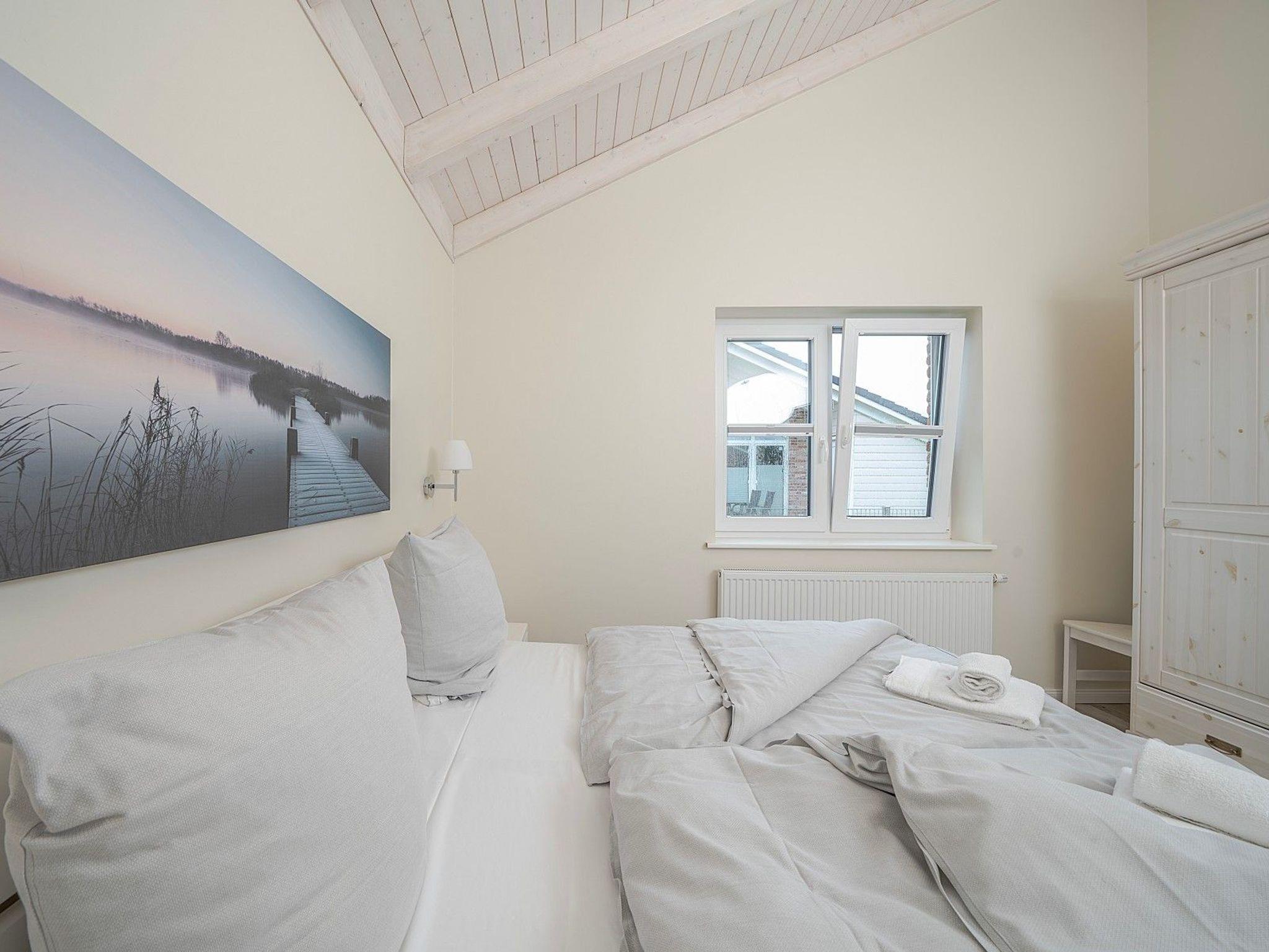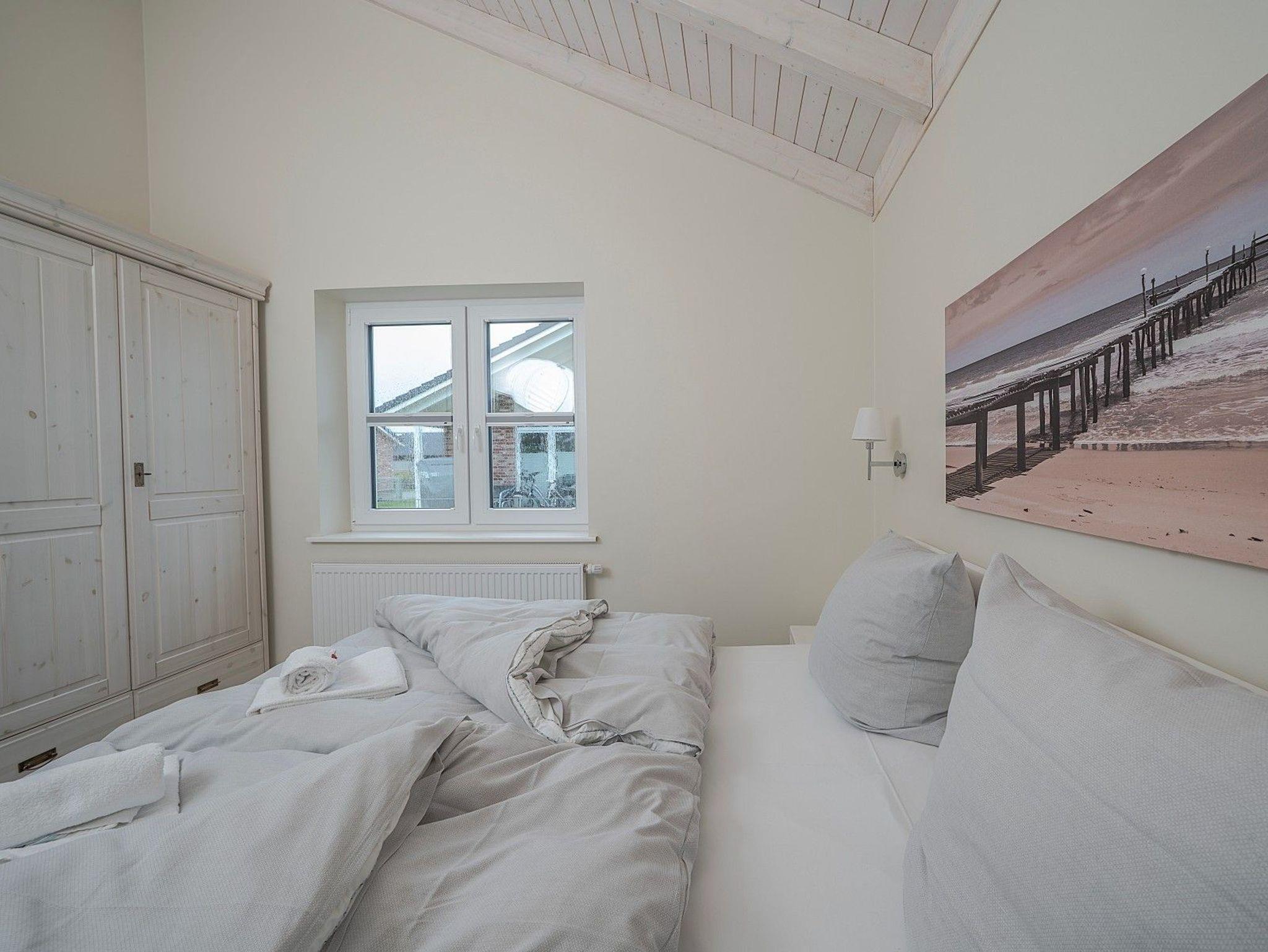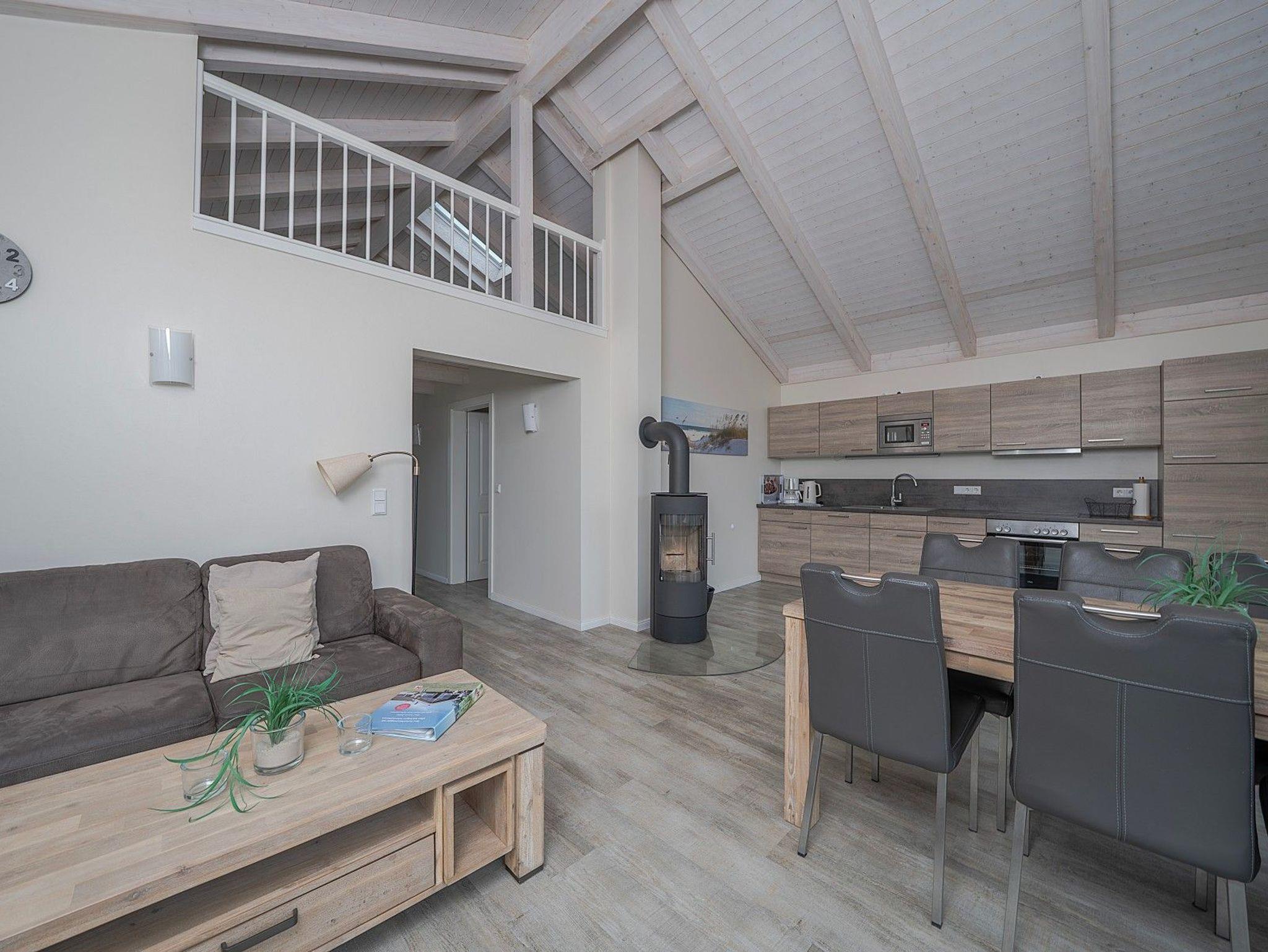 Zwei Doppelzimmer, ein stilvolles Bad mit Dusche und Badewanne sowie ein heller Wohn- und Essbereich mit Kaminofen schaffen eine behagliche Wohlfühlatmosphäre. Für entspannte Stunden steht eine private Sauna zur Verfügung, während von April bis September zusätzlich ein eigener Strandkorb auf der Terrasse bereitsteht.