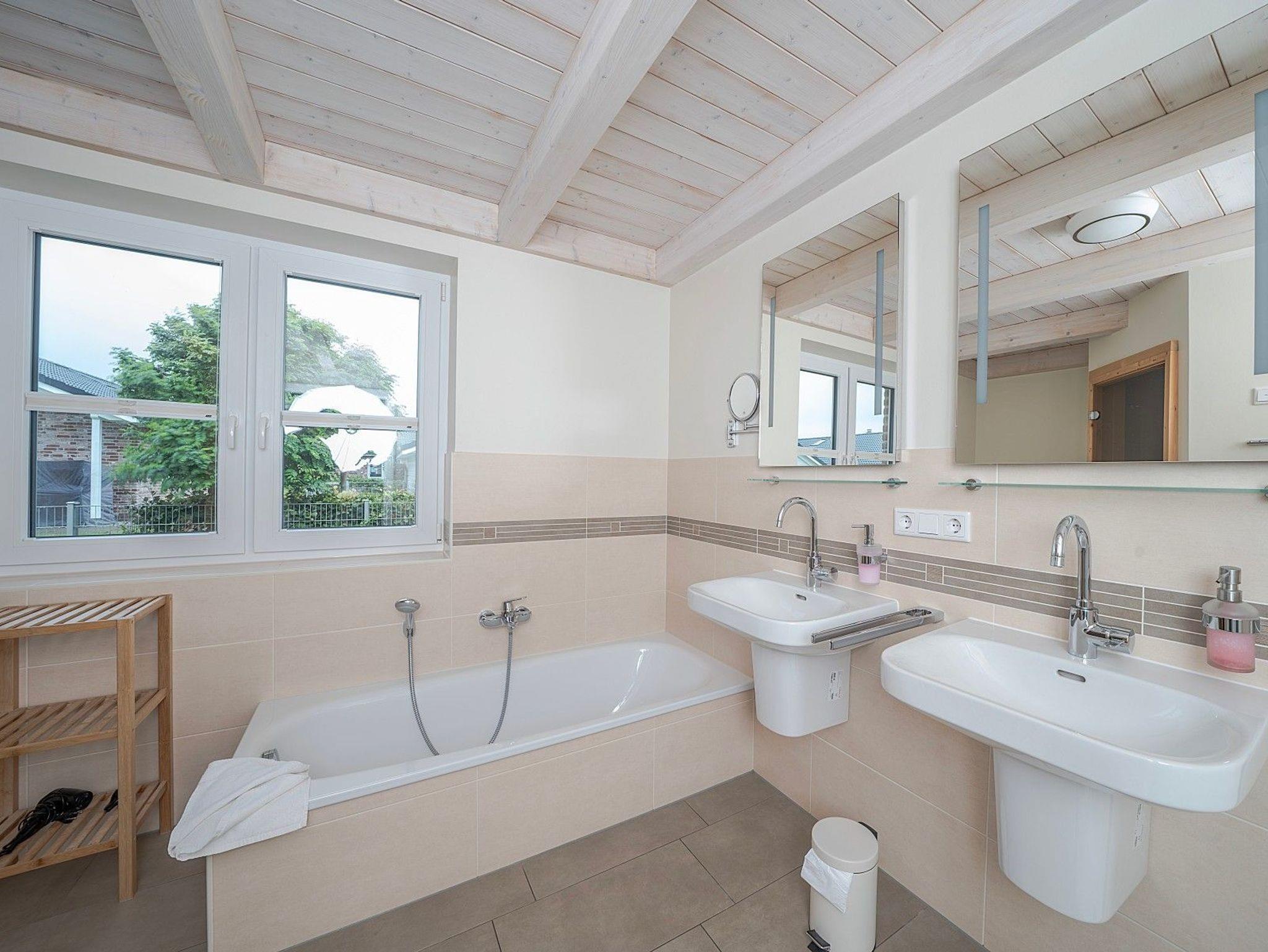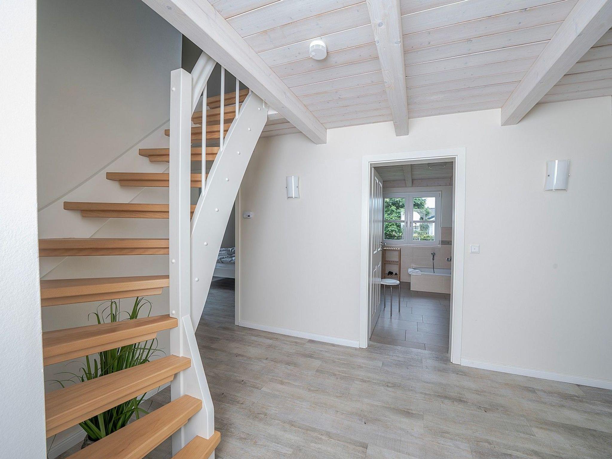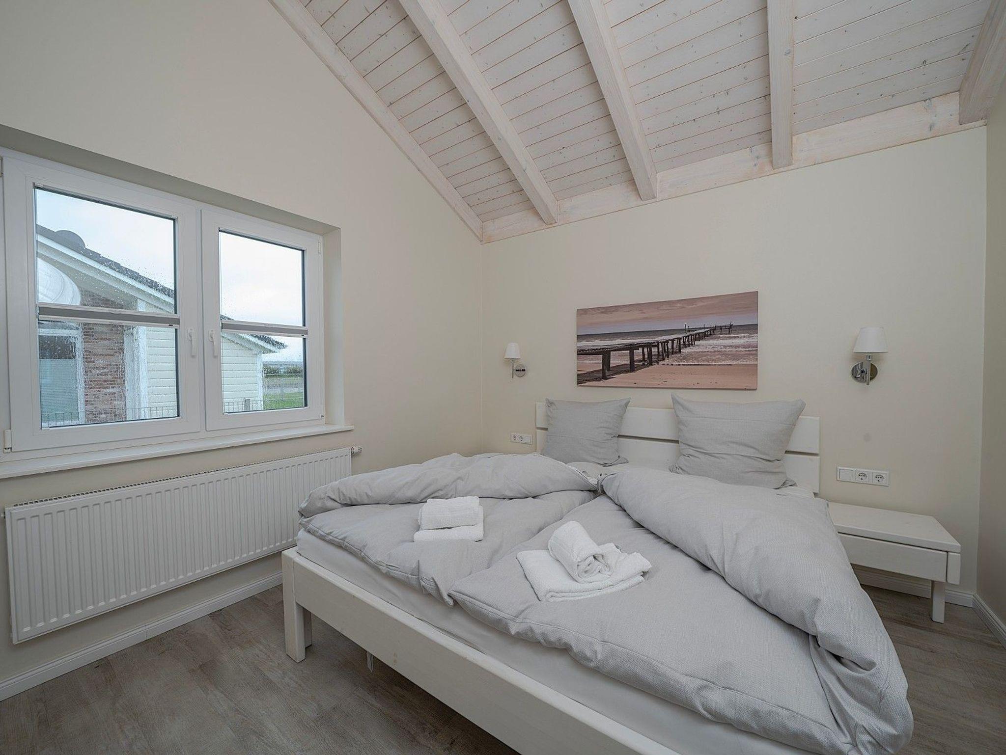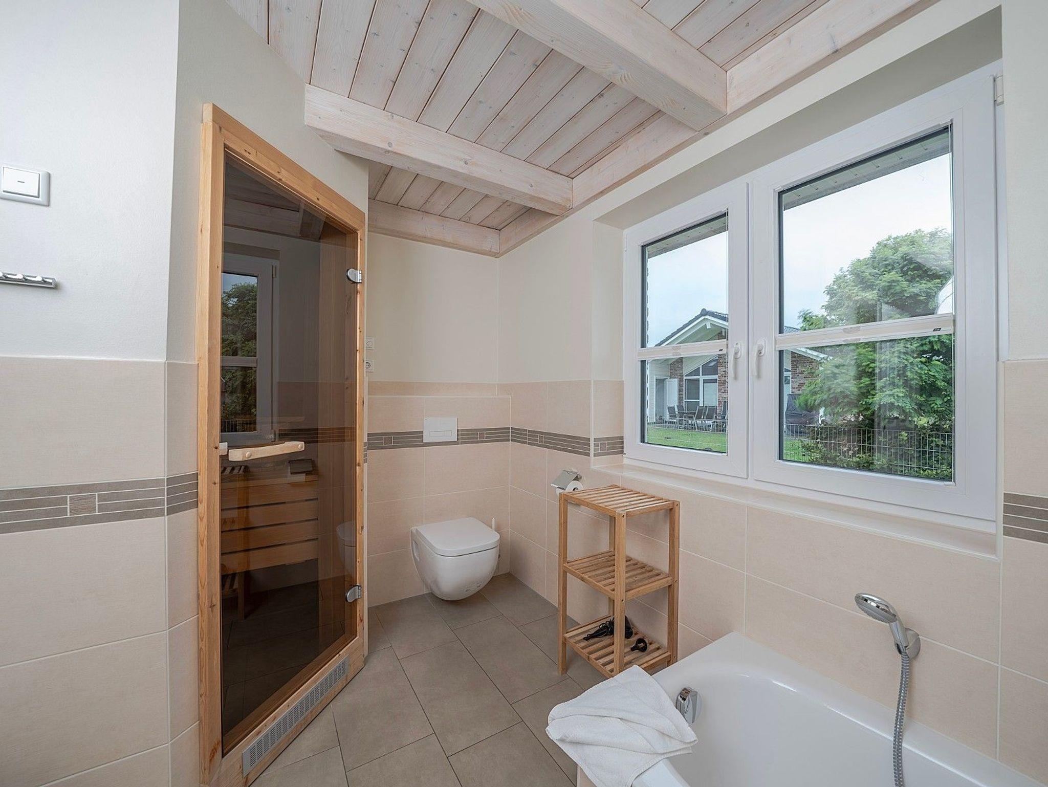 Zwei Doppelzimmer, ein stilvolles Bad mit Dusche und Badewanne sowie ein heller Wohn- und Essbereich mit Kaminofen schaffen eine behagliche Wohlfühlatmosphäre. Für entspannte Stunden steht eine private Sauna zur Verfügung, während von April bis September zusätzlich ein eigener Strandkorb auf der Terrasse bereitsteht.
