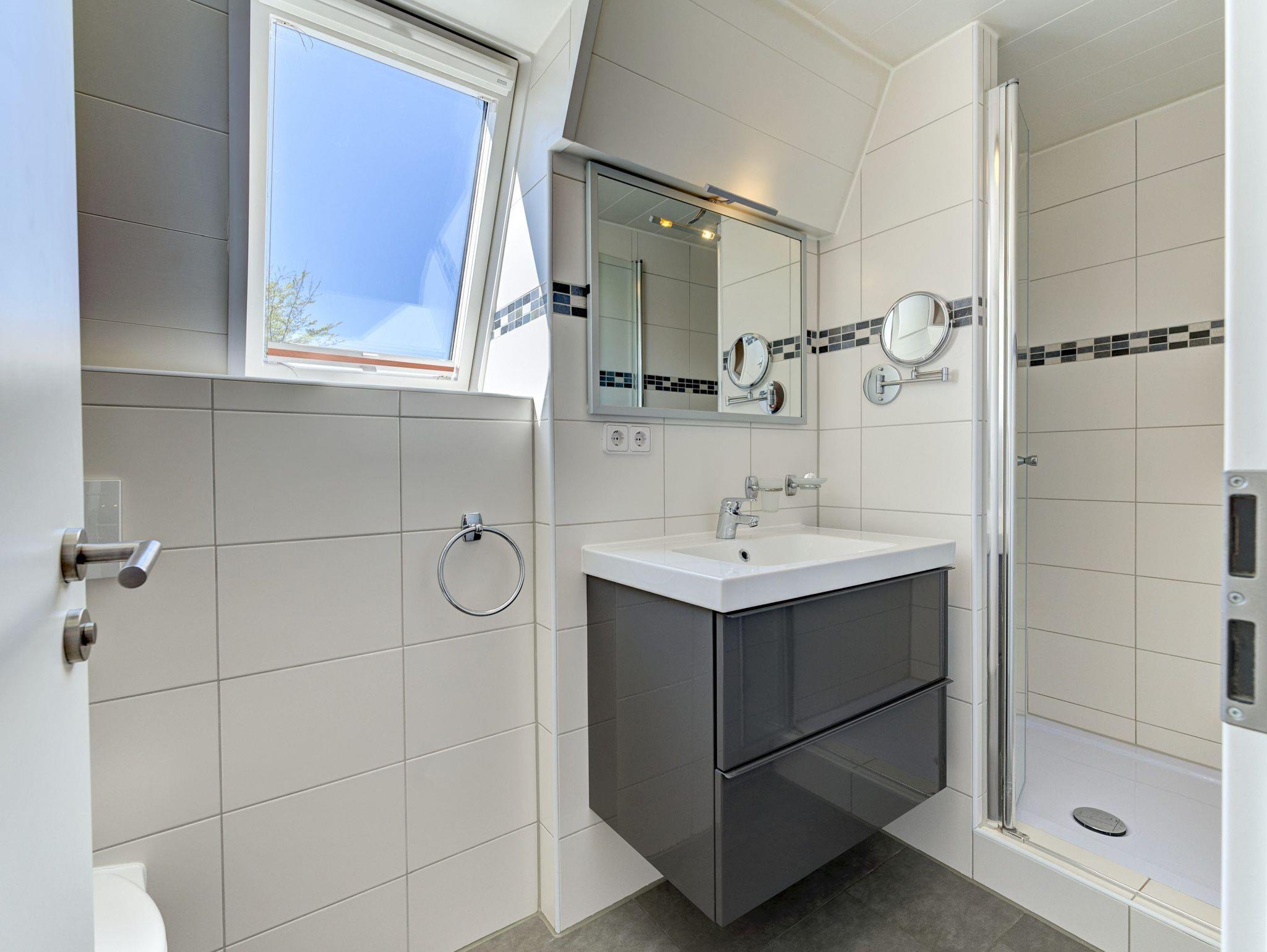 Im Badezimmer befinden sich eine Dusche, ein WC und ein Fön.