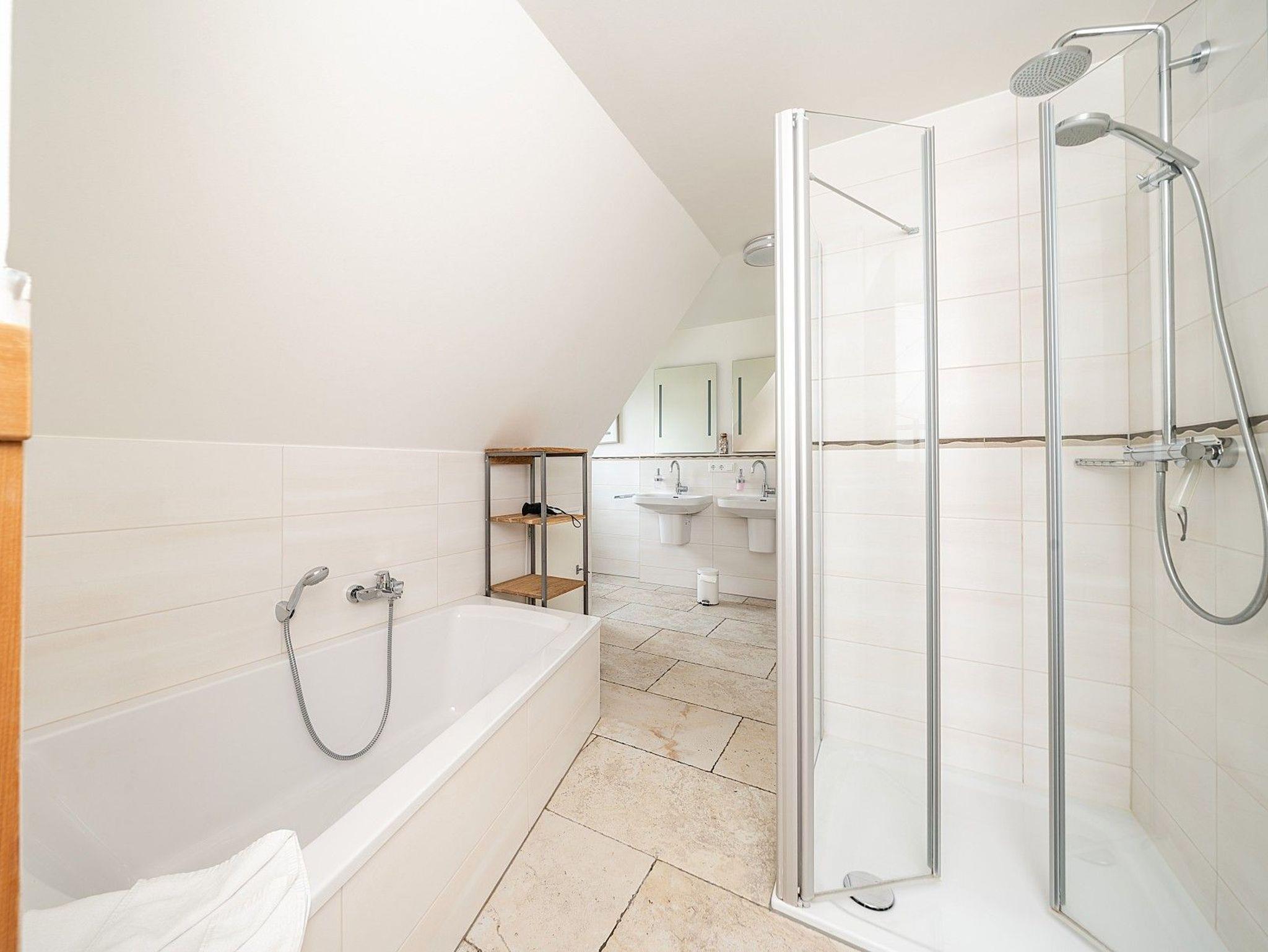 • 2 Badezimmer (1x OG mit Badewanne und Sauna, 1x EG mit Dusche)