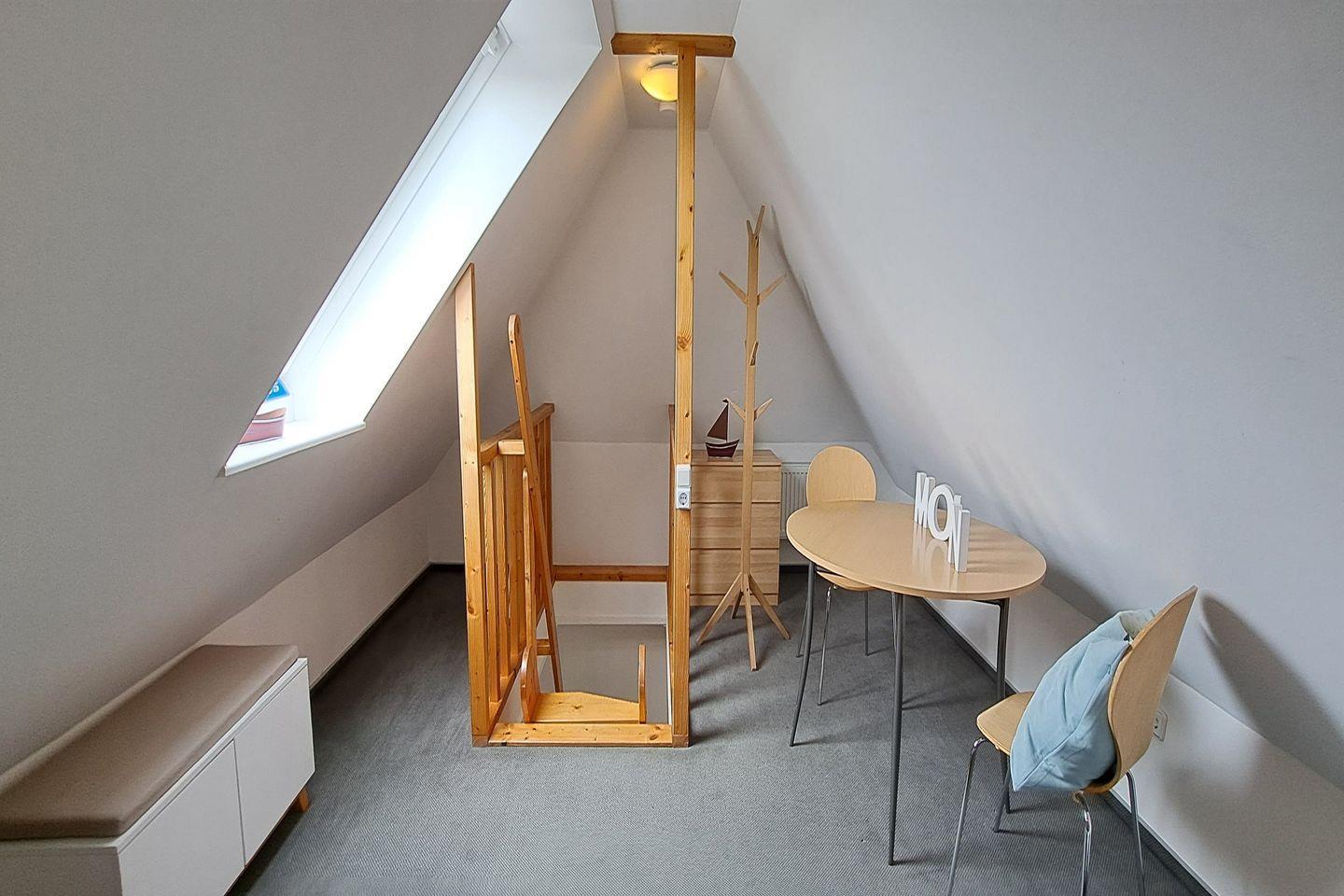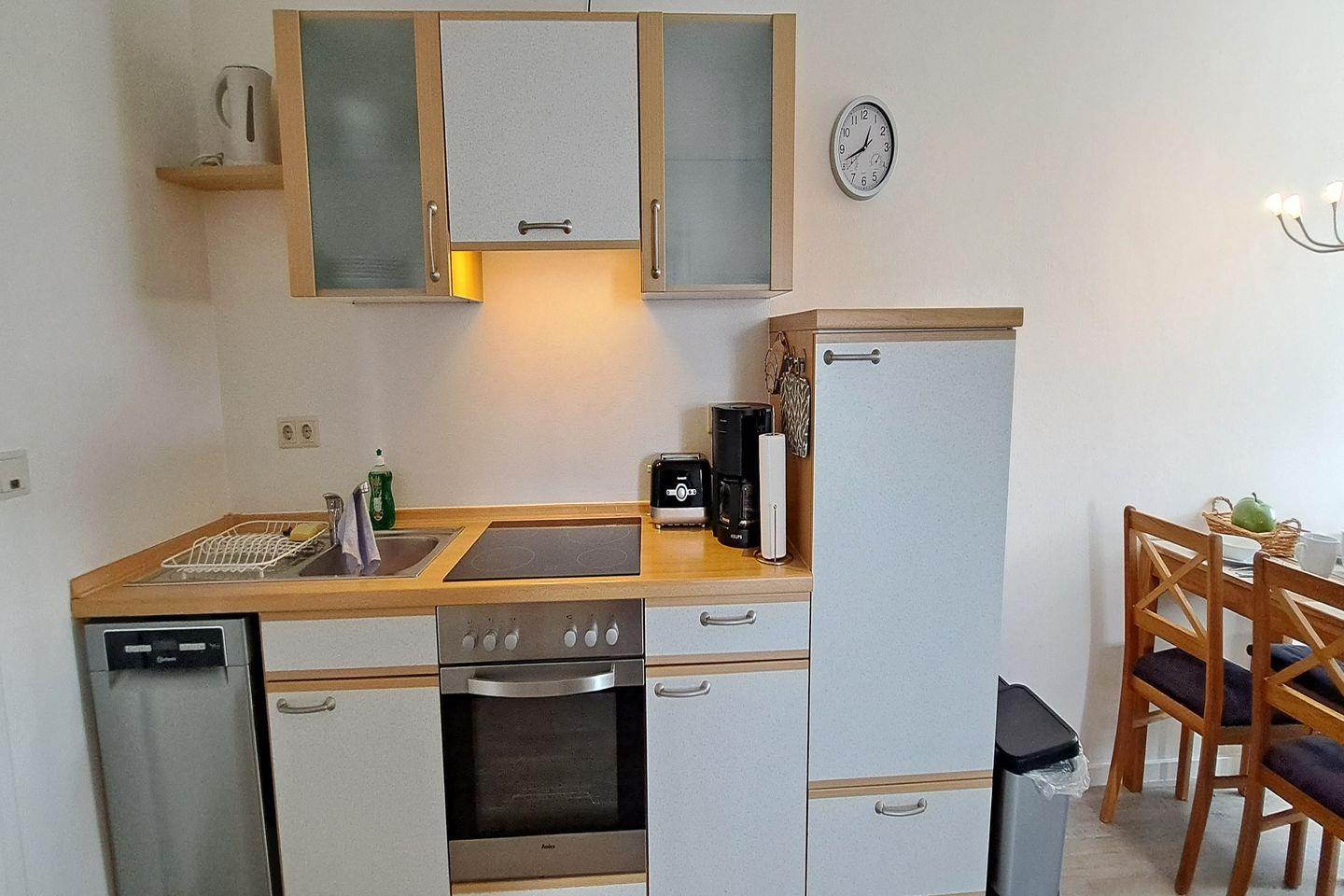 Die Wohnung befindet sich im ersten Stock eines zweigeschossigen Gebäudes und umfasst zwei Schlafzimmer, ein Badezimmer sowie einen offenen Wohn- und Essbereich, der mit einer voll ausgestatteten Küche verbunden ist. Die moderne Küche verfügt über alle notwendigen Annehmlichkeiten, darunter einen Herd mit Ceranfeld, einen Backofen, einen Kühlschrank mit Gefrierfach, einen Wasserkocher und Toaster sowie eine Kaffeemaschine. Hier können Sie wunderbare Mahlzeiten zubereiten und in geselliger Runde am Esstisch genießen. Die Sofaecke im Wohnzimmer lädt zu entspannten Stunden ein, z. B. beim Fernsehen über den vorhandenen TV oder beim gemeinsamen Spiel mit der Familie.