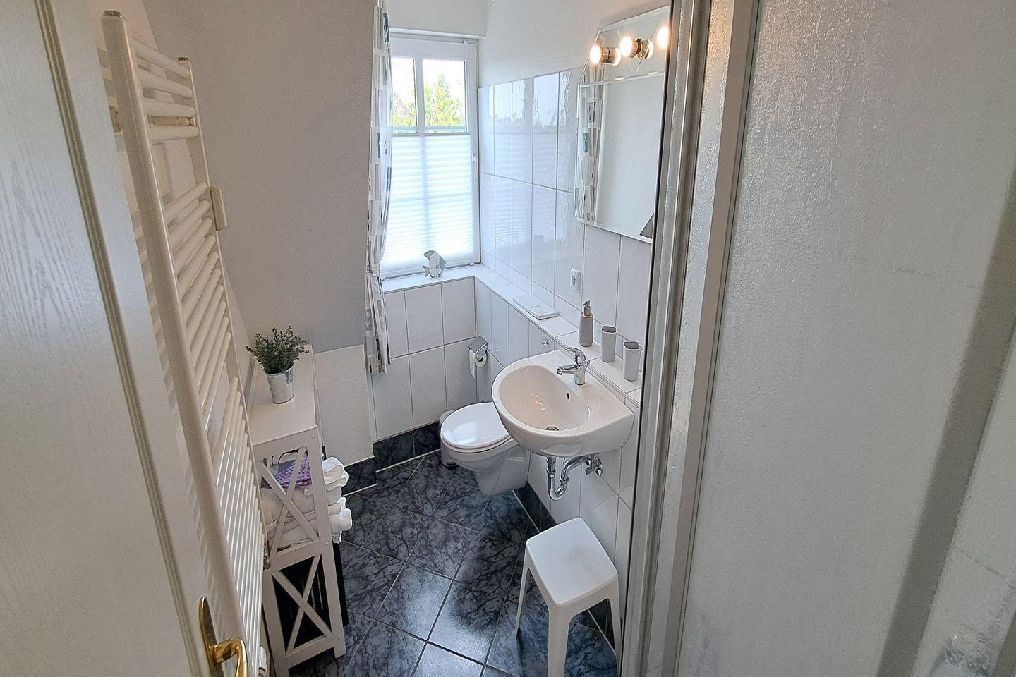 Das Badezimmer ist mit einer bodengleichen Dusche, einem Waschbecken und einem WC ausgestattet, während die Terrasse mit Südausrichtung und der Garten für entspannende Stunden im Freien sorgen. Gartenmöbel und eine Liegewiese ermöglichen es Ihnen, die frische Luft und die Natur in vollen Zügen zu genießen. Das Grundstück ist vollständig abgeschlossen, was zusätzliche Sicherheit und Privatsphäre bietet. Auch Hunde sind in dieser Ferienwohnung willkommen.