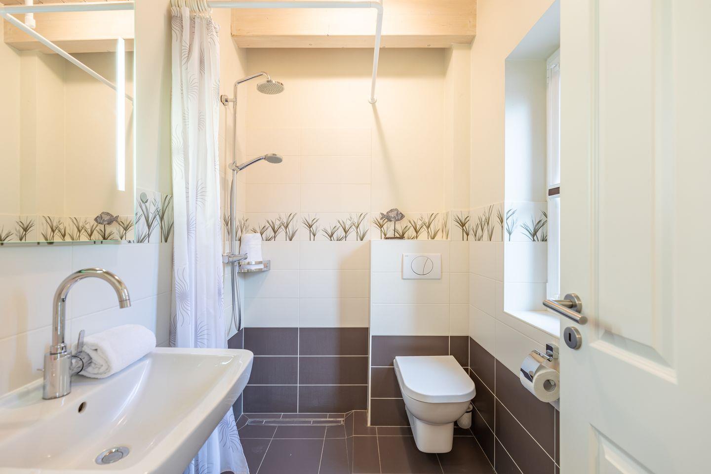Das Badezimmer im Obergeschoss lässt keine Wünsche offen: Zwei Waschbecken, eine große Badewanne, eine ebenerdige Dusche und eine schöne Sauna geben Ihrem Urlaub den richtigen Rahmen. Im Obergeschoss befindet sich auch ein separates WC. Das Ferienhaus verfügt über ein zusätzliches Duschbad und Gäste-WC im Erdgeschoss. In der Unterkunft stehen Ihnen eine Waschmaschine und ein Trockner zur Verfügung.