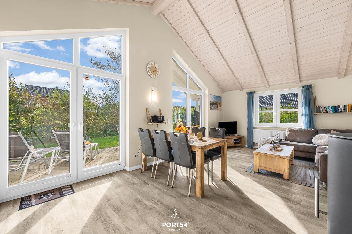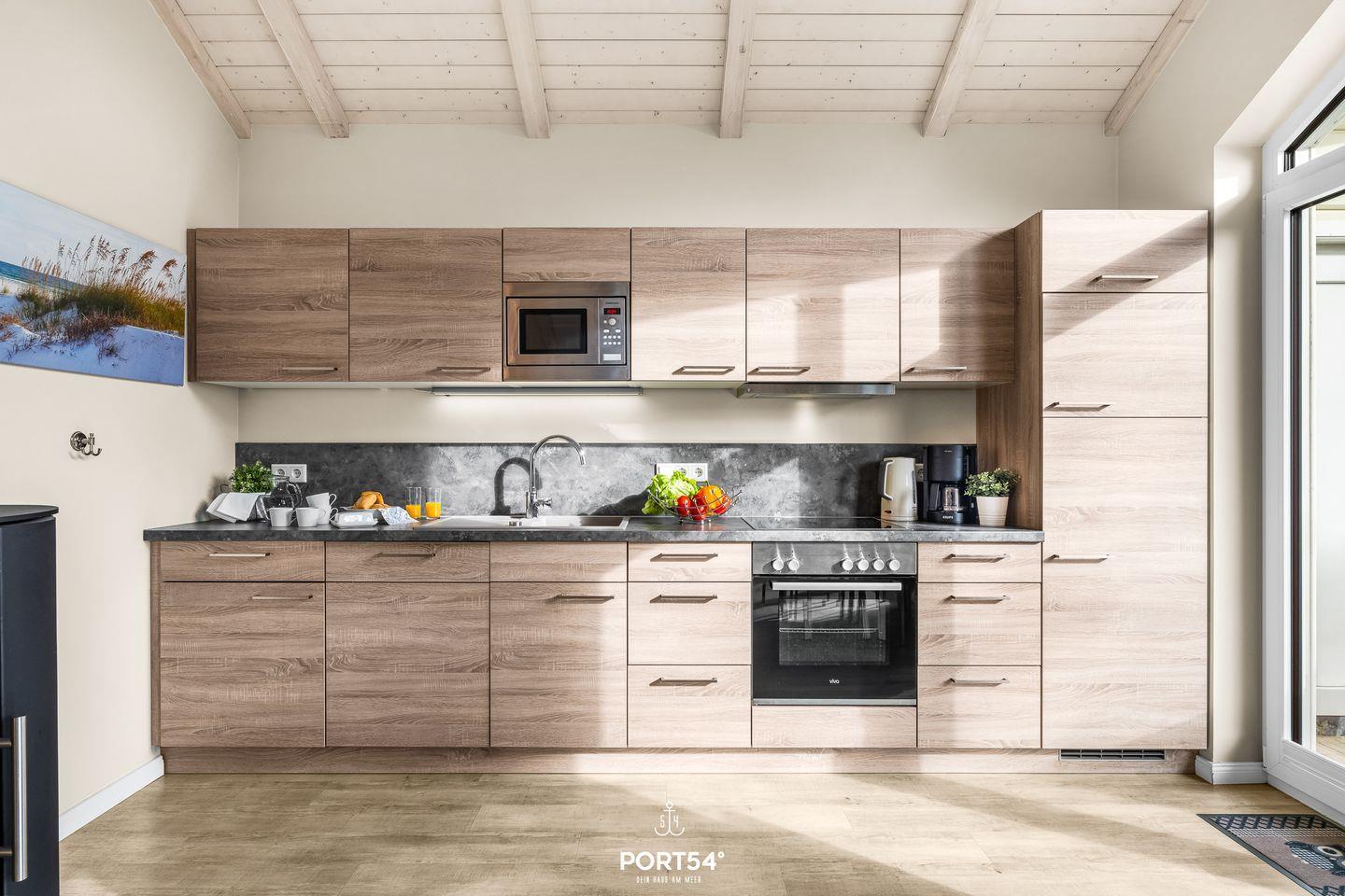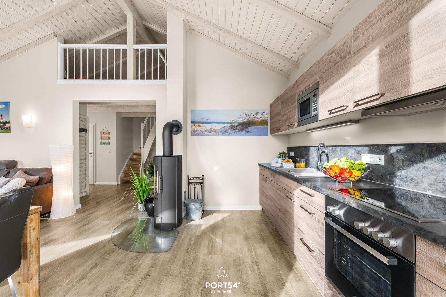 Das Haus empfängt Sie mit einem lichtdurchfluteten Wohnbereich im Erdgeschoss. Hier erwarten Sie eine gemütliche Sofaecke, ein Essbereich sowie ein Kaminofen, der an kühleren Tagen für eine behagliche Atmosphäre sorgt. Für Ihre mediale Unterhaltung stehen zwei Fernseher und ein Blu-ray-Spieler zur Verfügung. Die offene Küche ist zum Wohnzimmer hin gestaltet und umfassend ausgestattet – moderne Geräte wie Ceranherd, Backofen, Geschirrspüler, Kühlschrank mit Gefrierfach, Mikrowelle, Kaffeemaschine und umfangreiches Geschirr und Besteck bieten alles für die unabhängige Selbstversorgung.