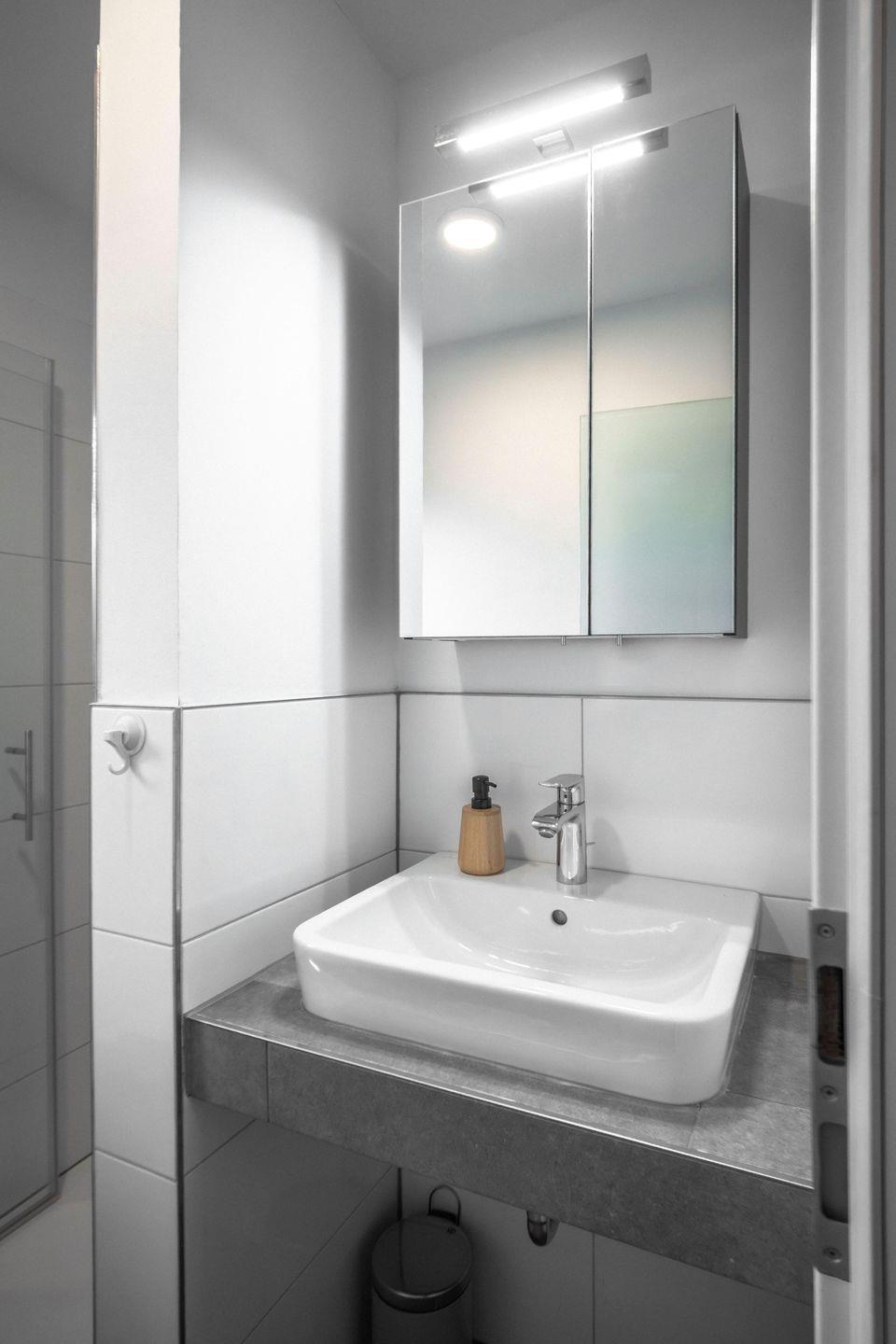 Im Badezimmer erwartet Sie eine bodengleiche Dusche, die für zusätzliche Barrierefreiheit sorgt. Ein Waschbecken, ein Spiegel, ein WC und eine Erstausstattung an notwendigen Hygieneartikeln sind vorhanden. Für Ihren Komfort stehen in der Unterkunft zudem eine Garderobe, ein Ganzkörperspiegel sowie ein gemeinschaftlich nutzbarer Waschmaschinenplatz bereit.