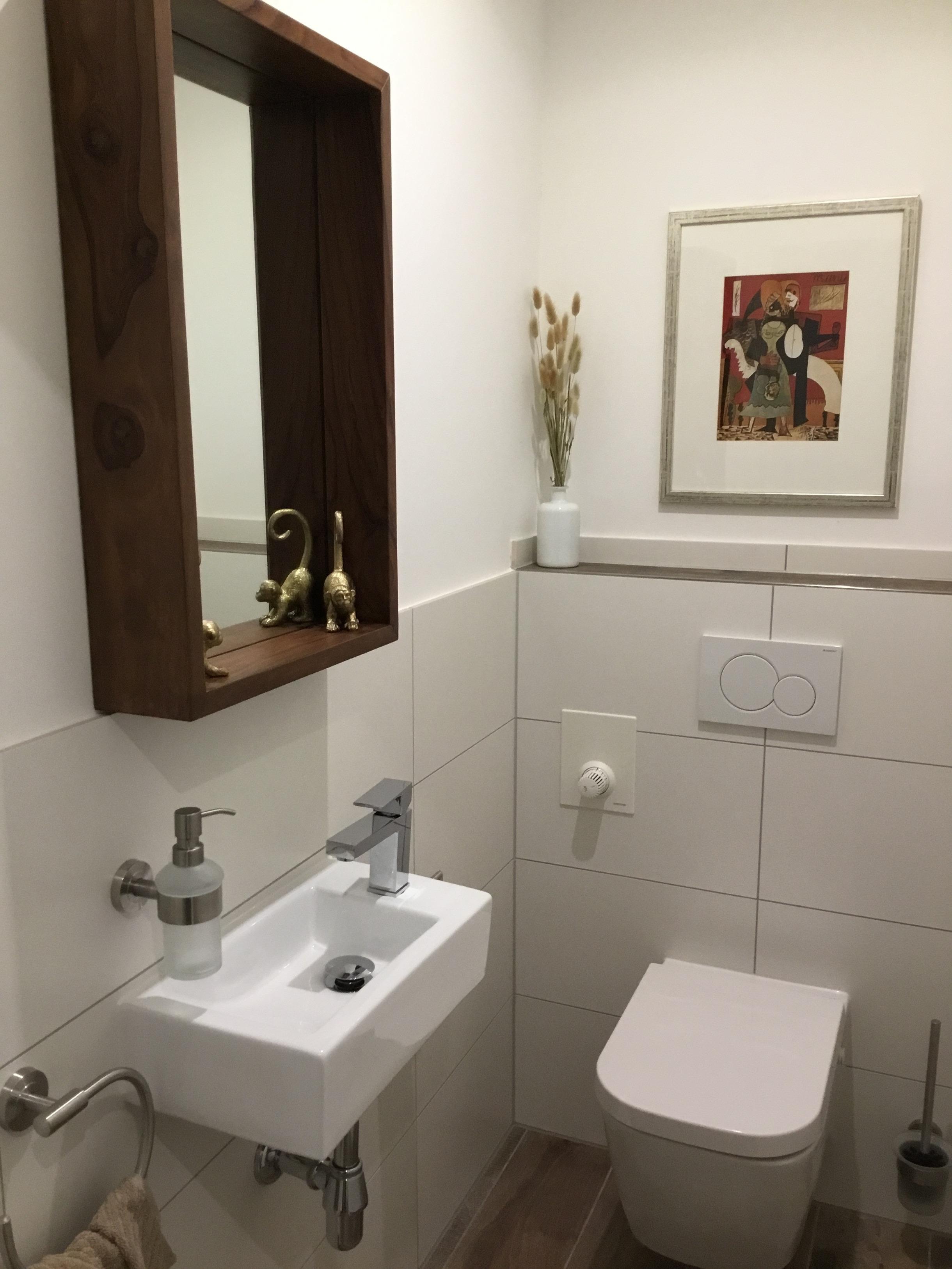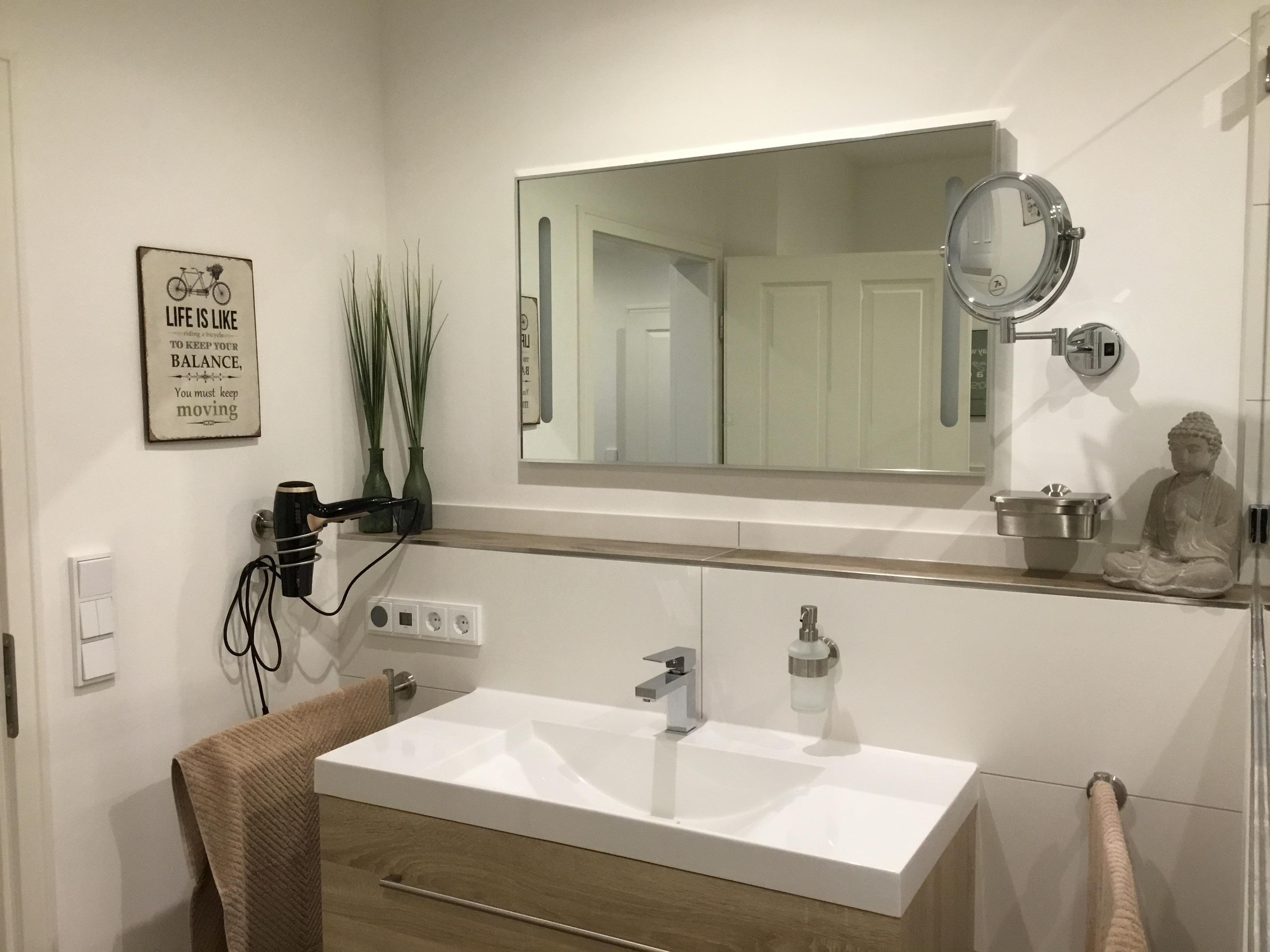 Das Duschbad hat eine Walk-In-Dusche, WC, großen Waschtisch mit Badmöbel, beleuchteter Spiegel und Kosmetikspiegel, Haartrockner, Einbauradio Busch & Jäger, Handtuchheizkörper und Fußbodenerwärmung. Das Gäste WC hat eine Toilette, Waschbecken und Spiegel.