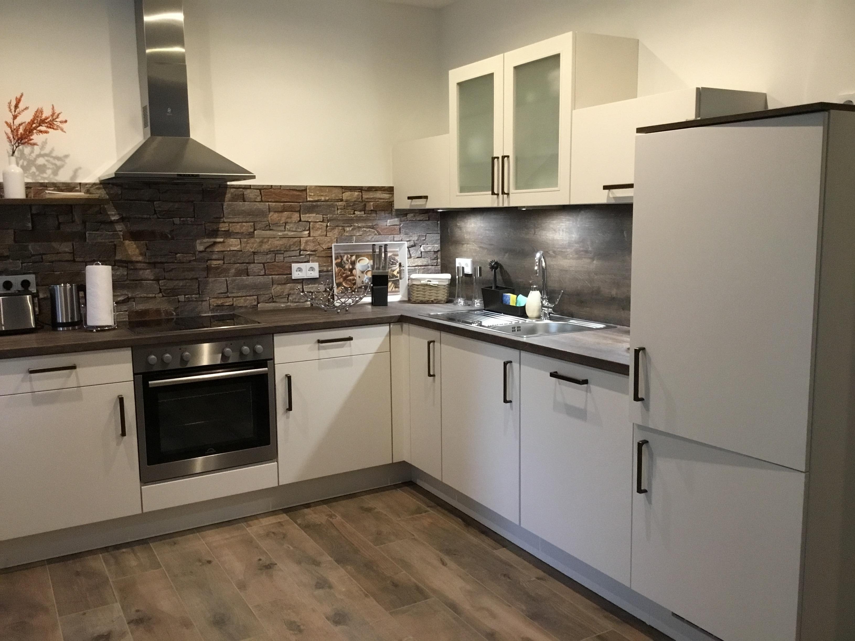 Die Einbauküche ist ausgestattet mit Ceran Kochfeld, Backofen, Spülmaschine, Kühlschrank mit Gefrierfach, sowie Einbauradio Busch & Jäger.