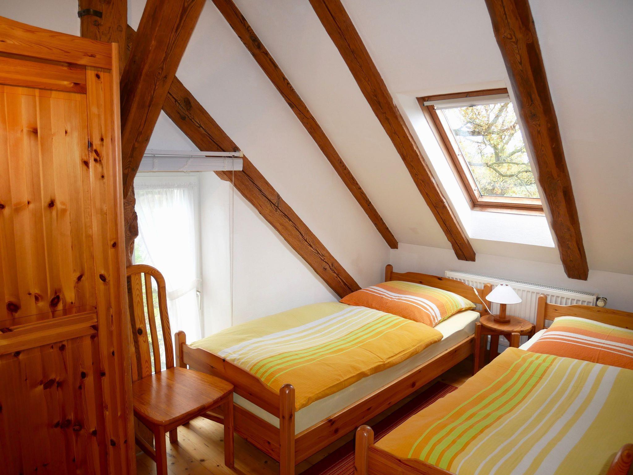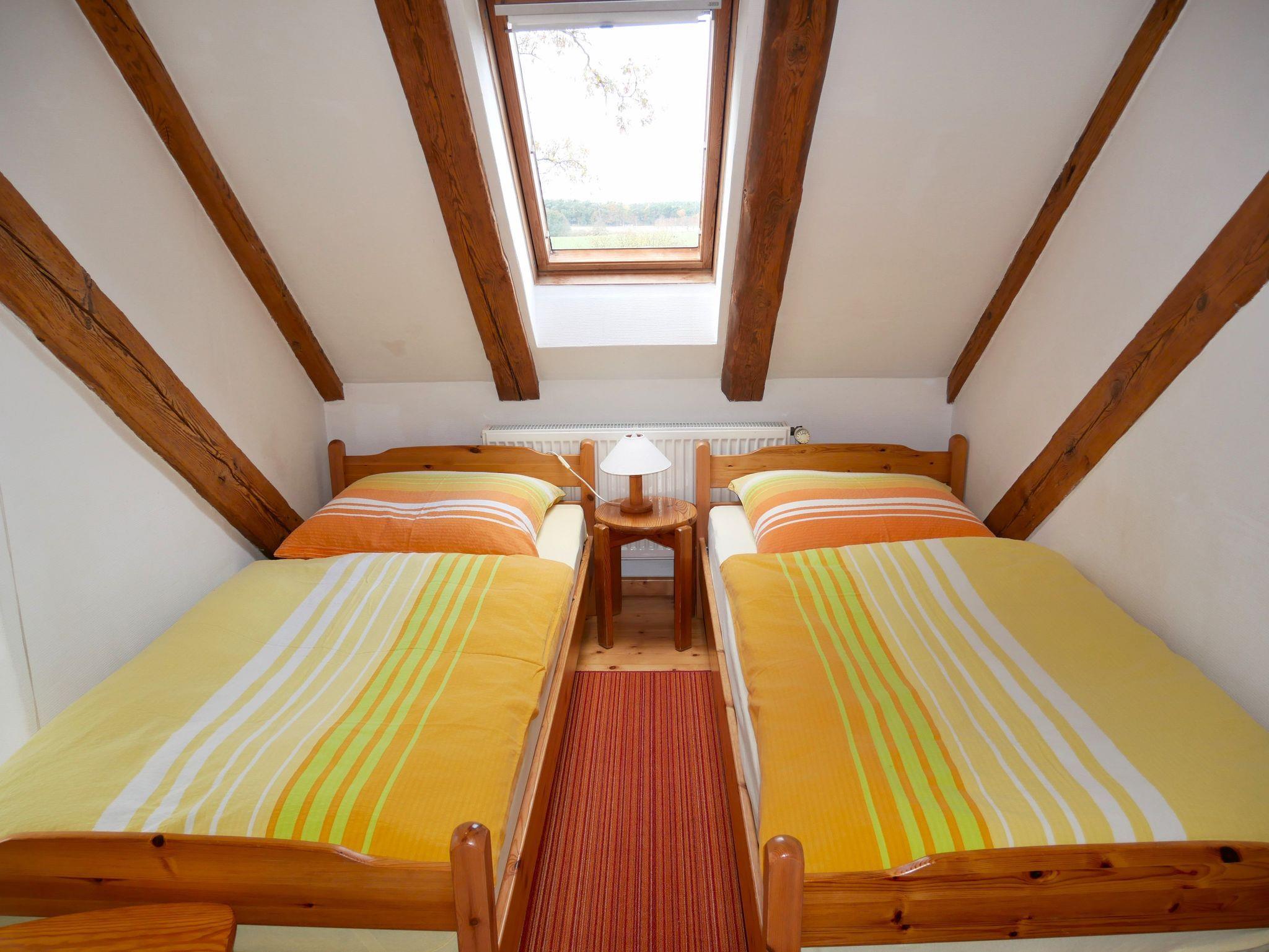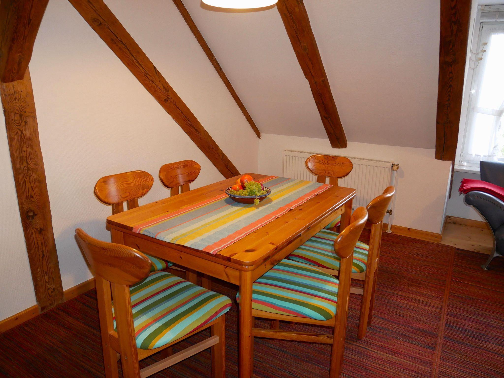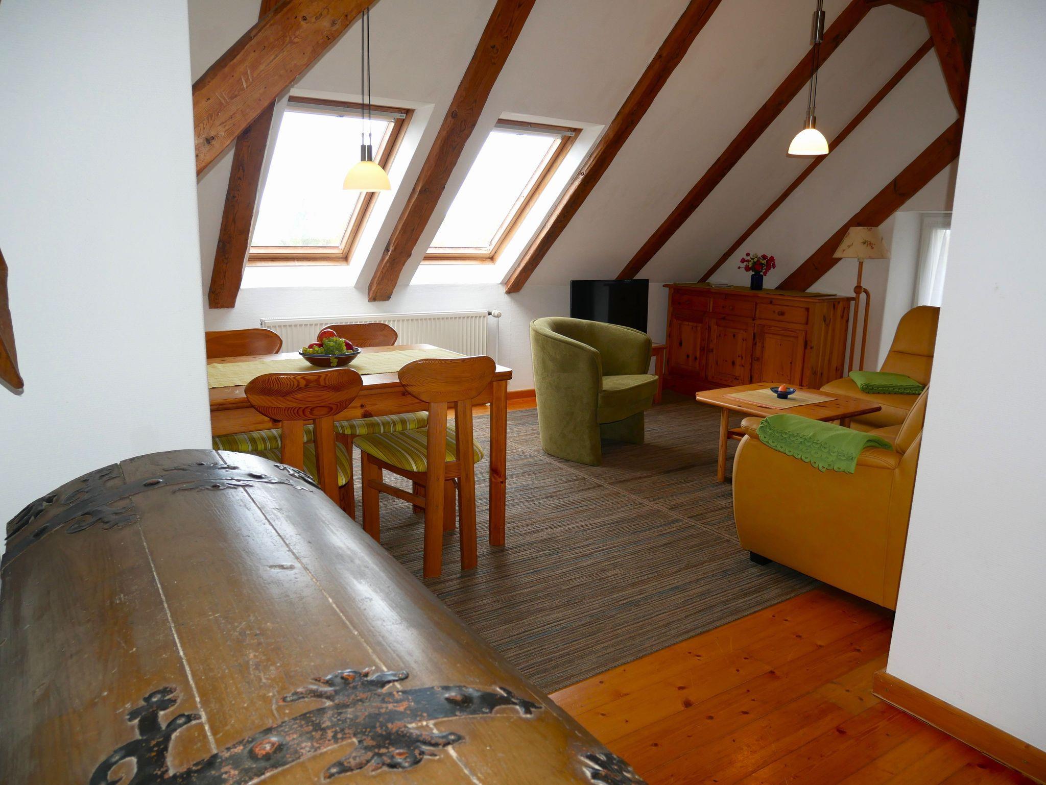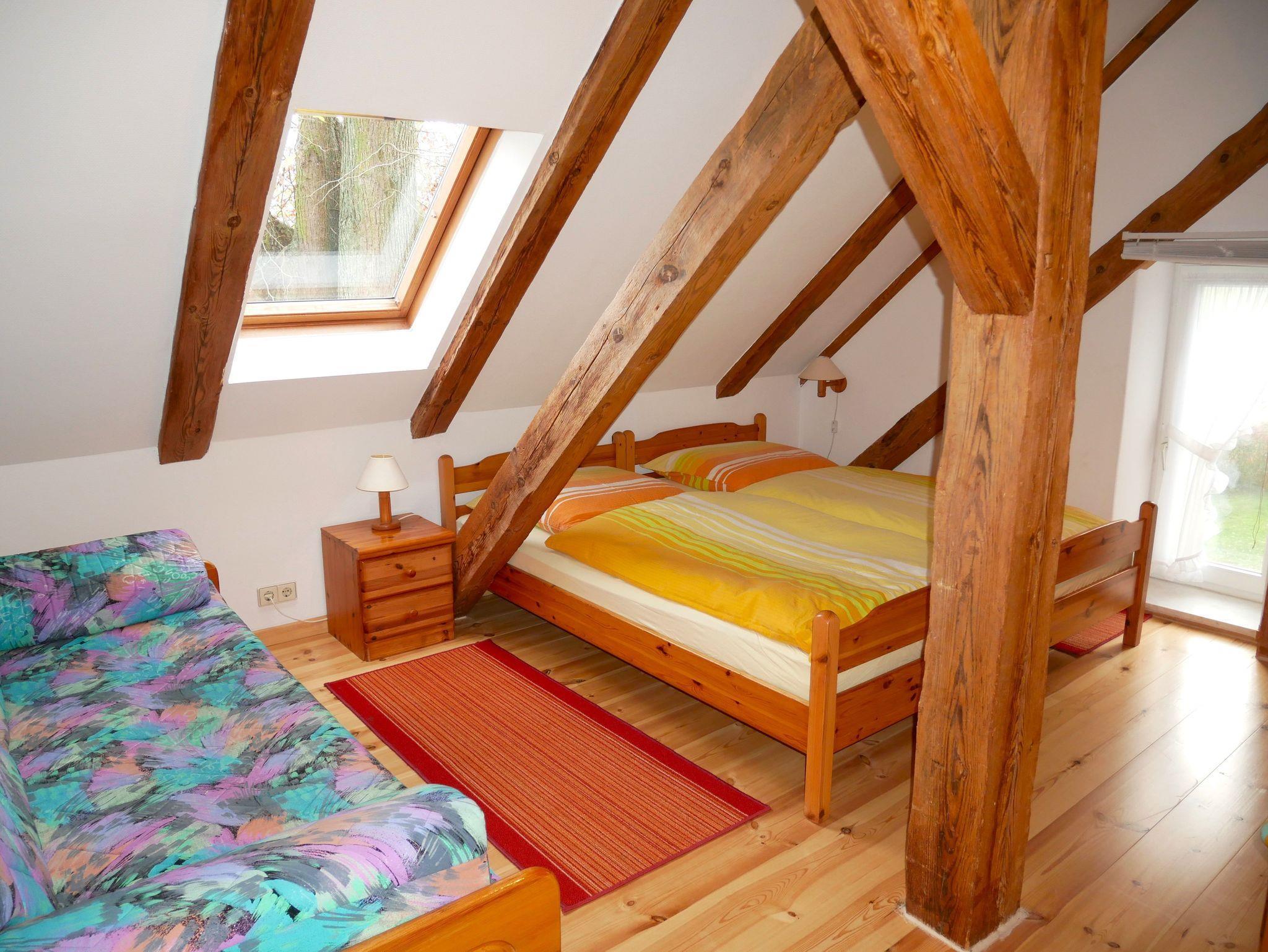 Die 80 qm große komfortable Ferienwohnung befindet sich im 1. Obergeschoss und ist für bis zu 8 Personen (7 Erw. + 1 Kind max. 3 Jahre) geeignet und bietet einen herrlichen Ausblick in unseren Garten sowie in die offene Landschaft mit Feldern, Wiesen, Wald und Oderhaff.