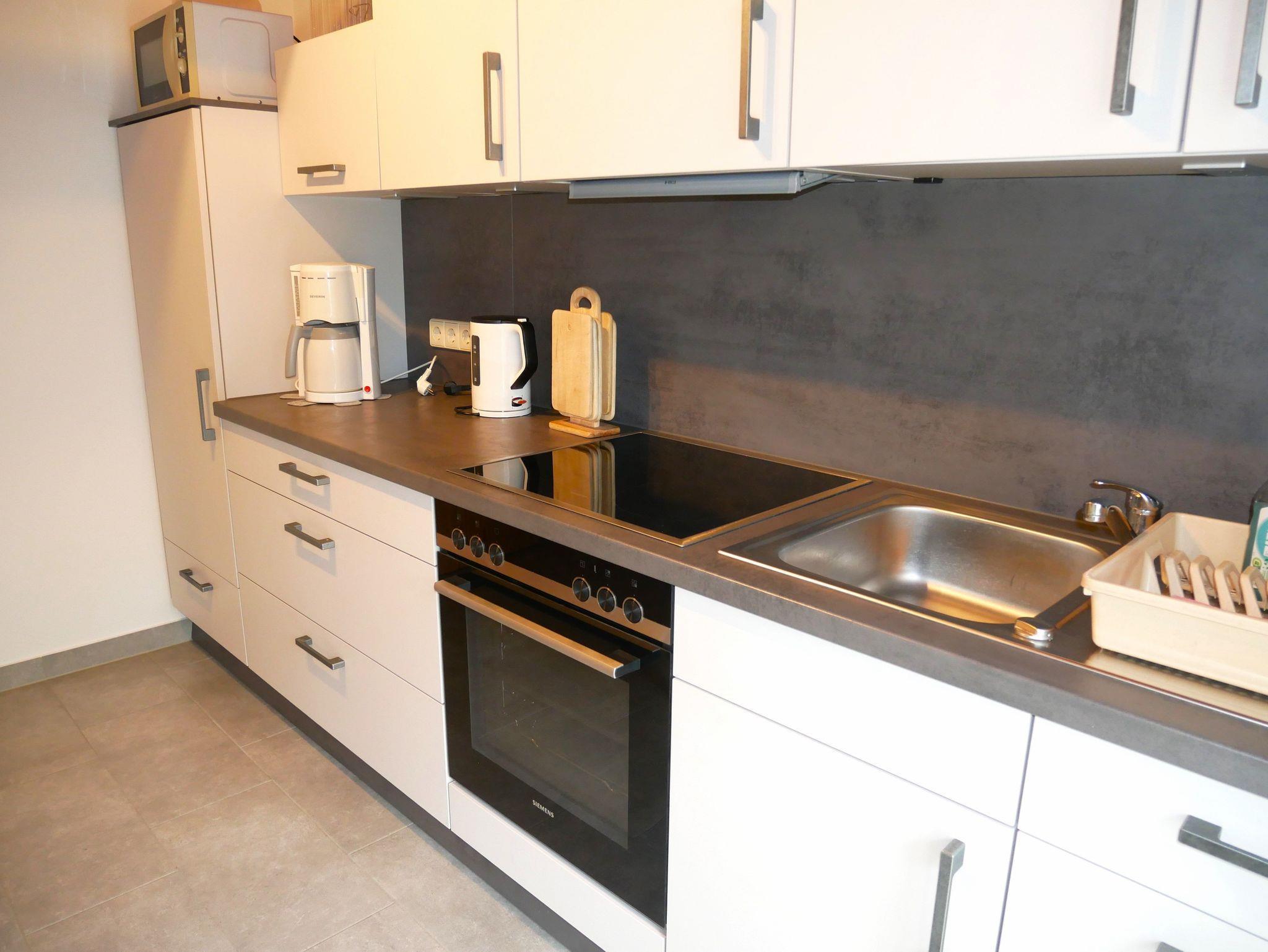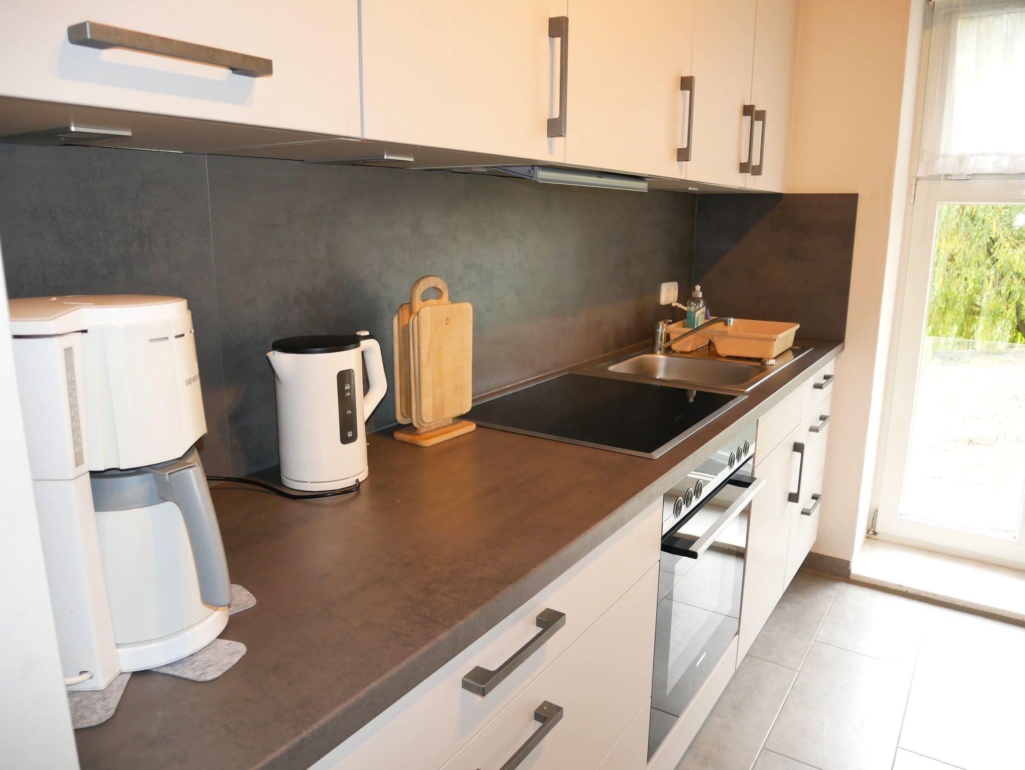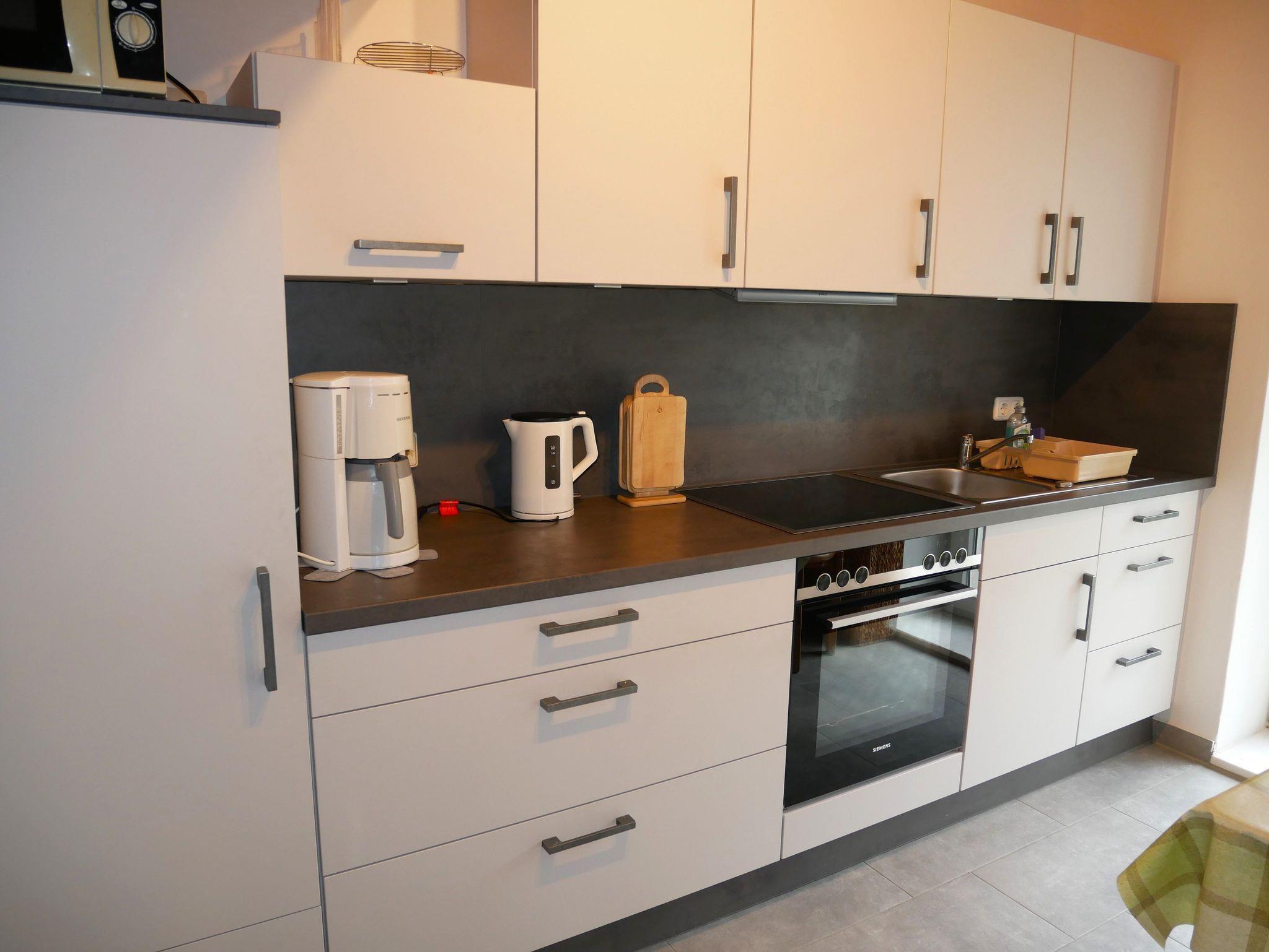 Sie verfügt über einen Wohnraum mit Couchgarnitur, Sat- TV, Radio und Essplatz. Die separate Küche ist mit Kühlschrank, Herd, Backofen, Mikrowelle, Kaffeemaschine, Wasserkocher und Toaster ausgestattet.