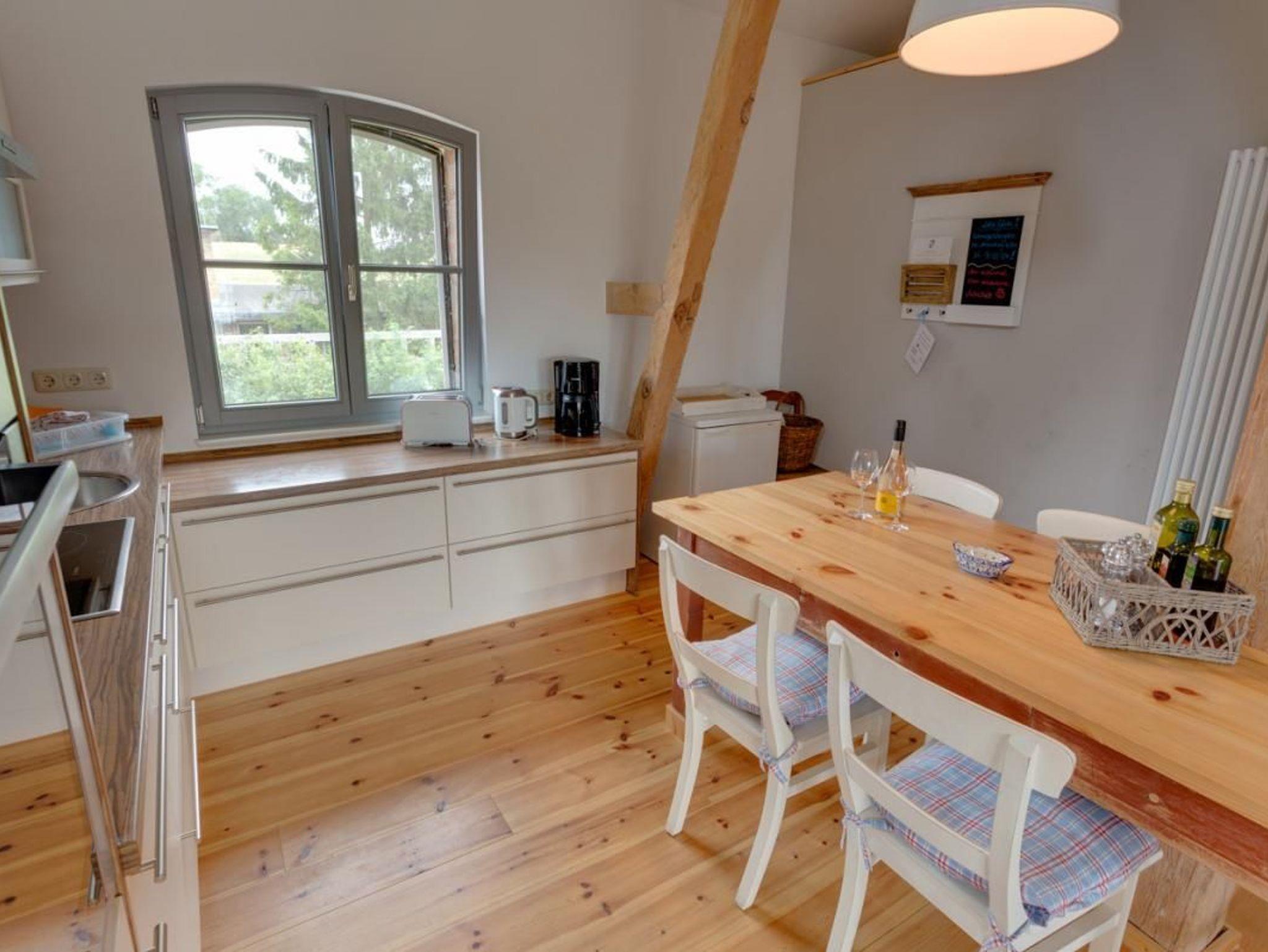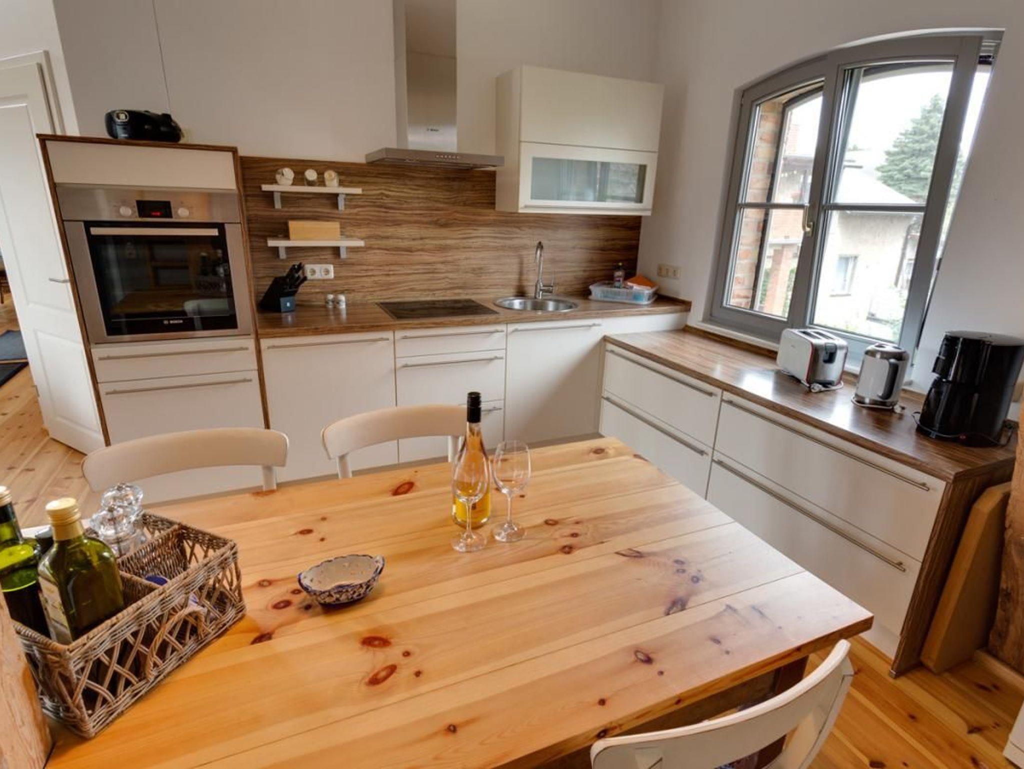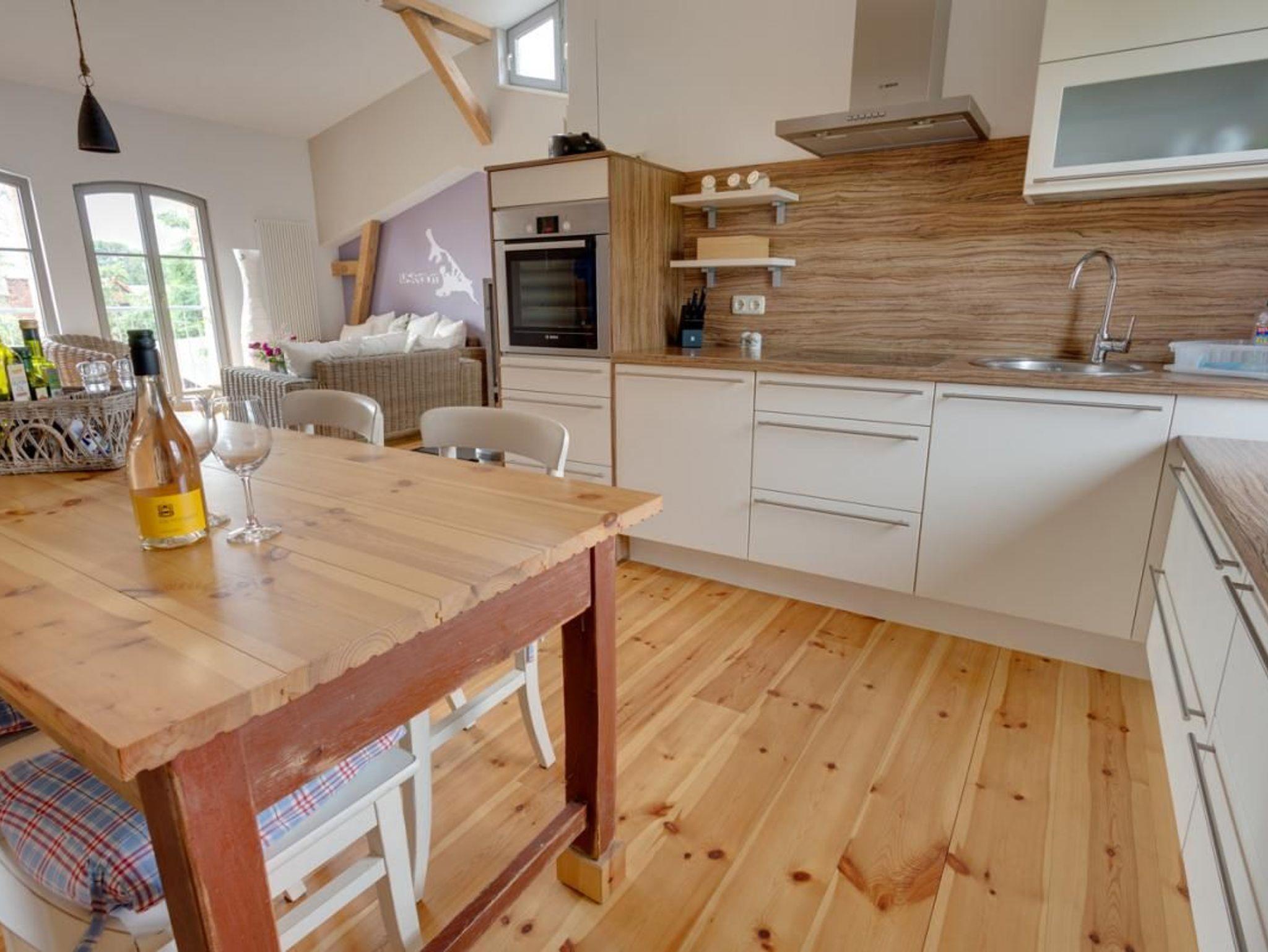 Der offene und helle Wohnbereich mit 2 französischen Balkonen zum Garten inkl. Haffblick ist mit einem Kamin, Wohnsitzecke, Esstisch und einer großen Küche ausgestattet. In der Küche finden Sie einen Backofen, ein Kochfeld, einen Kühlschrank mit Gefrierfach, einen Geschirrspülautomaten, Kaffeemaschine, Toaster und Wasserkocher für ein uneingeschränktes Kochvergnügen.