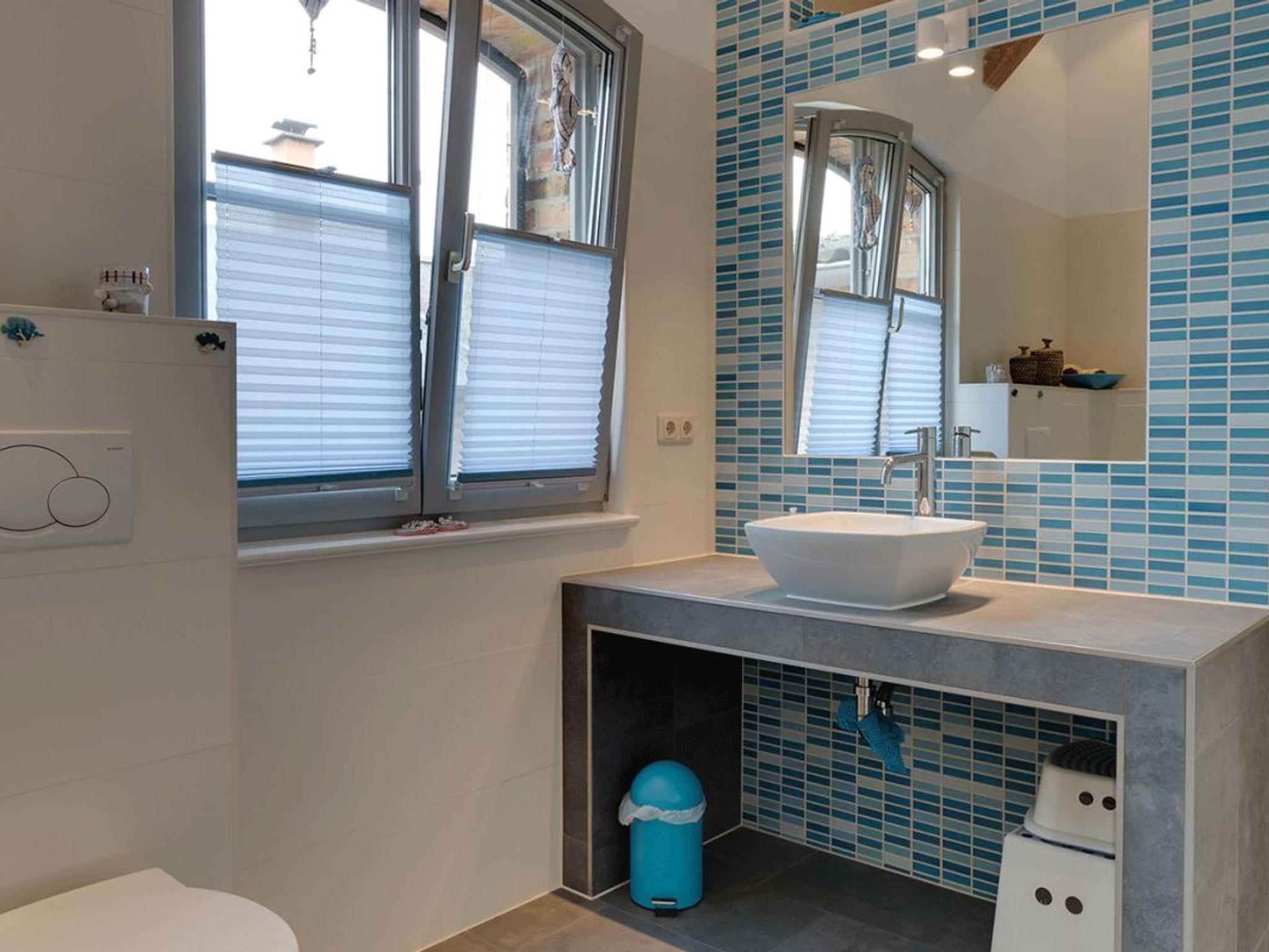 Das Badezimmer verfügt über eine große Dusche, Fußbodenheizung, WC und über einen Waschtisch.