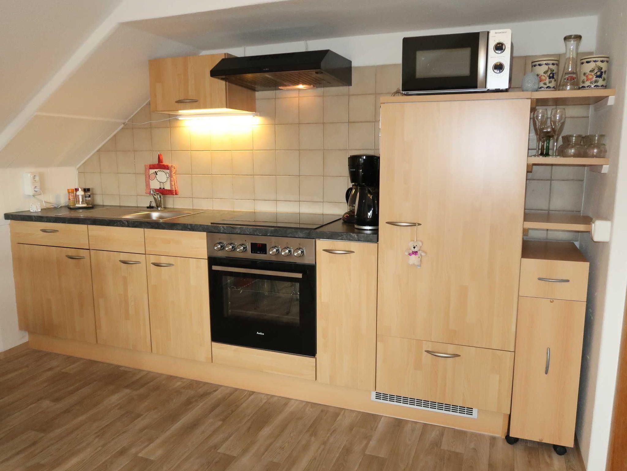 Das Herz der Ferienwohnung ist ein großer Raum, der eine gut ausgestattete Küchenzeile mit zwei daran anschließenden Sitzgelegenheiten beinhaltet. Die Küche enthält die Standardausstattung wie Wasserkocher, Kaffeemaschine und Toaster und überzeugt durch Extras, wie z.B. einem neuen E-Herd mit Backofen und Ceran-Kochfeld, sowie einer neuen Mikrowelle.