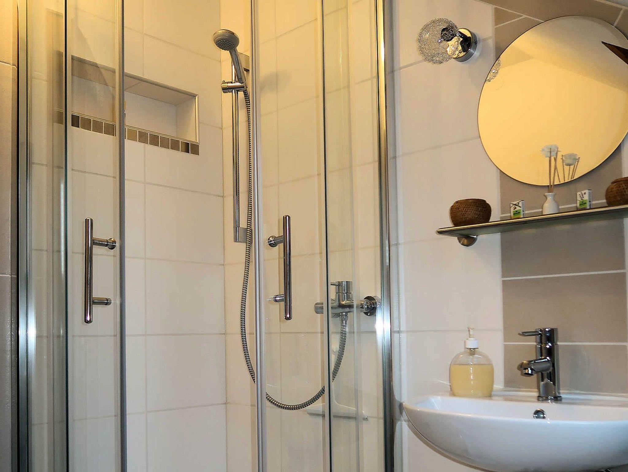In der Dusche/WC-Kombination finden Sie neben einem Haarföhn auch eine kleine Auswahl nützlicher Utensilien für die Körperpflege.
