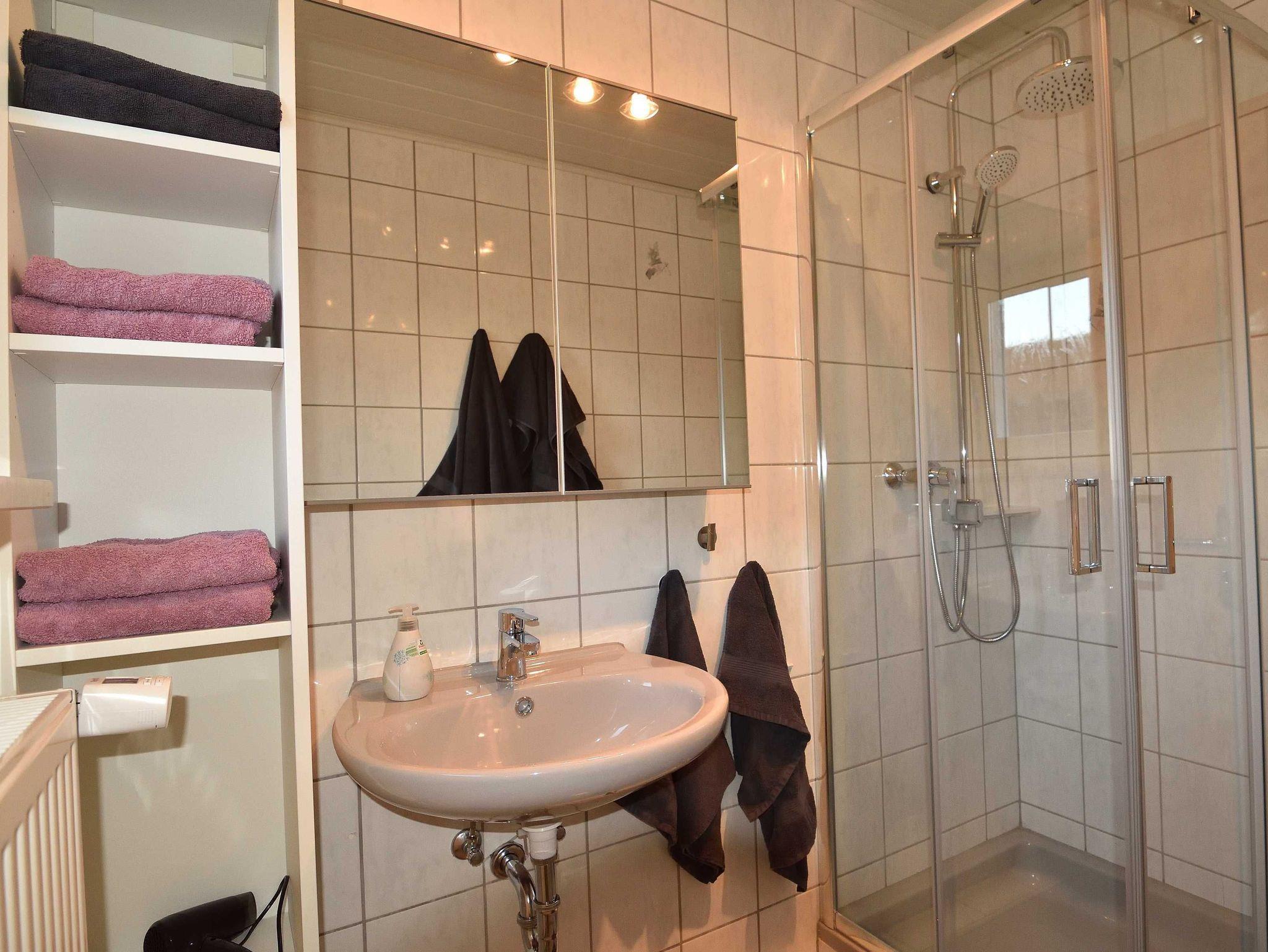 Das Bad ist mit einer Regenschauerdusche, einem Waschbecken und einer Toilette ausgestattet. Das Wohnzimmer mit einem großen LCD-Fernsehgerät sowie einem Schlafsofa bildet zusammen mit der Küche und dem integrierten Essbereich einen großen Wohnraum.