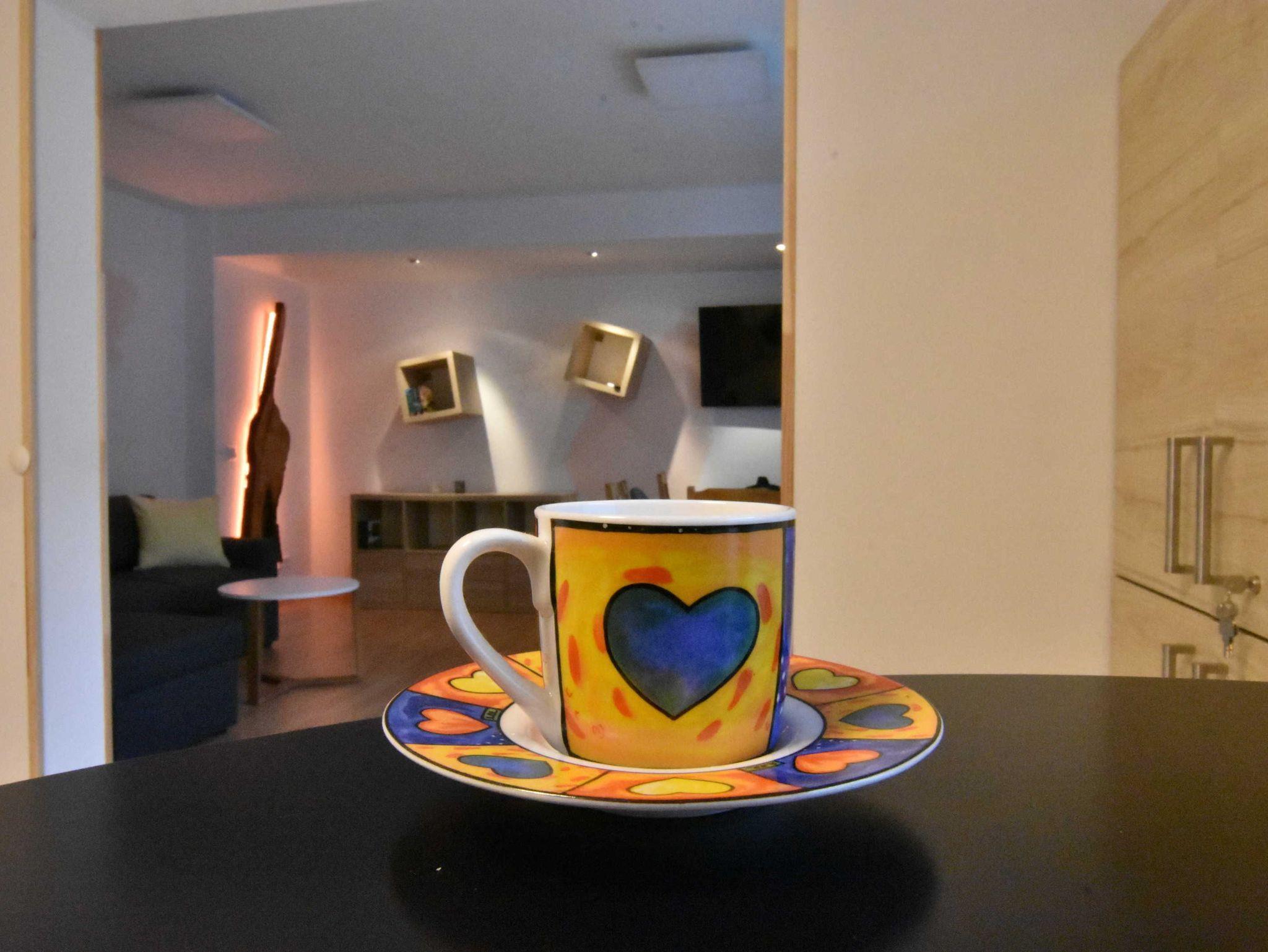 Die modern eingerichtete Küche beinhaltet einen Kühlschrank mit Gefrierfach, einen Herd mit Backofen, einen Geschirrspüler und eine Waschmaschine mit Trocknerfunktion. Die eingerichtete Terrasse erreicht man direkt über den Wohnraum. Verschiedene Lichteffekte sowie einige Holzelemente runden die neu renovierte Wohnung ab.