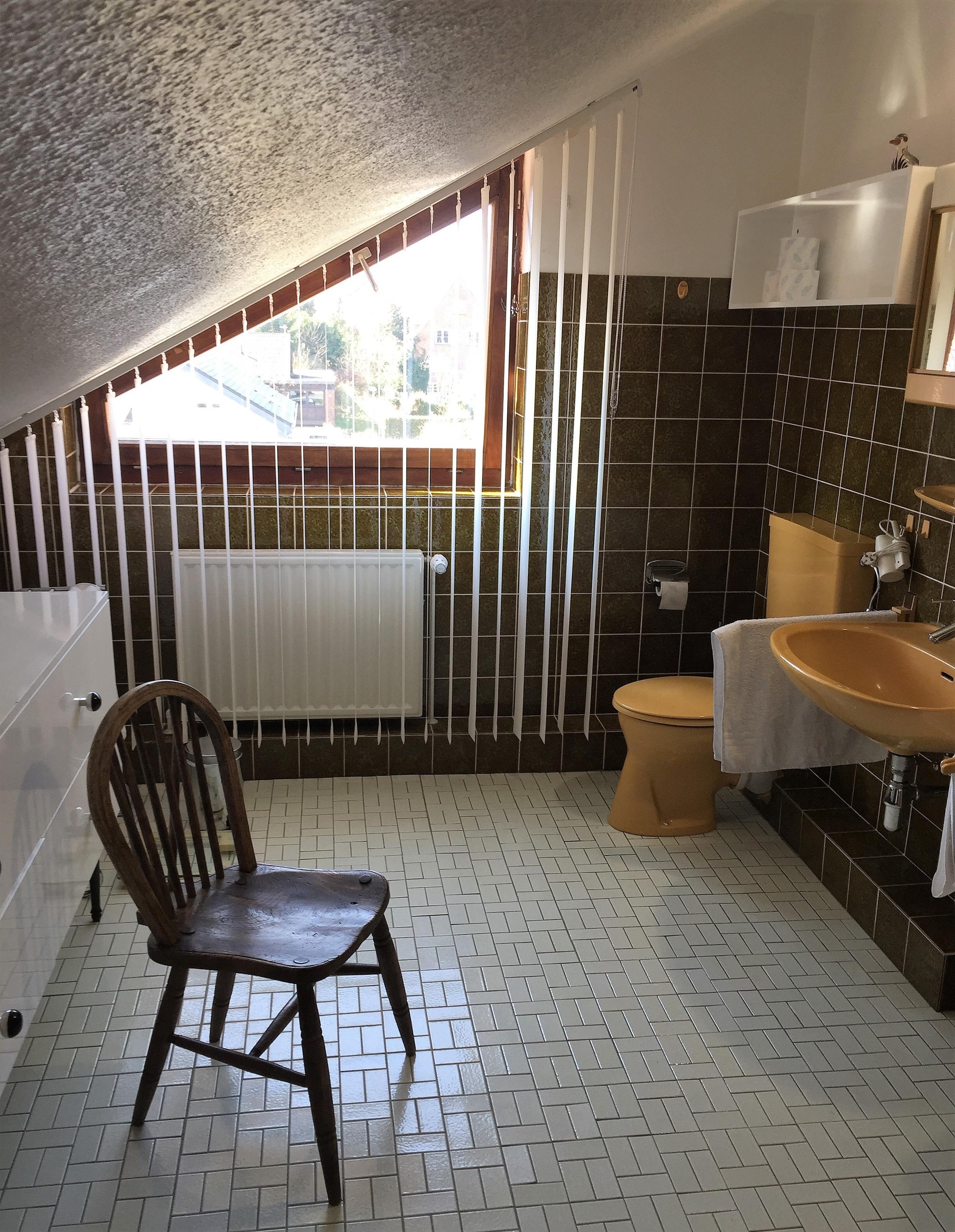 Leider ist die Wohnung nicht barrierefrei. 26 Stufen führen zum Eingang der Ferienwohnung Weitblick. Im Erdgeschoss liegen die Wohnküche, das Wohnzimmer und ein Badezimmer. Im ersten Obergeschoss befinden sich drei Schlafzimmer und ein weiteres Wannenbad.