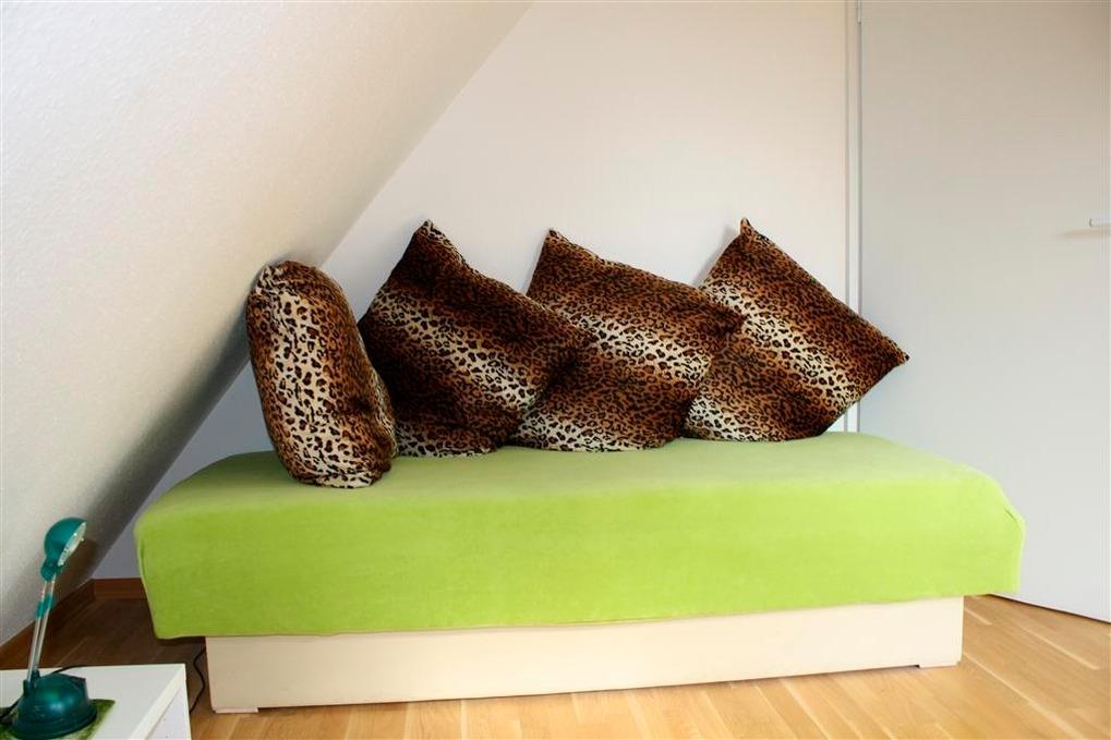 Drittes Schlafzimmer im Obergeschoß mit Balkon und Blick in den Garten, Einzelbett 90 cm.